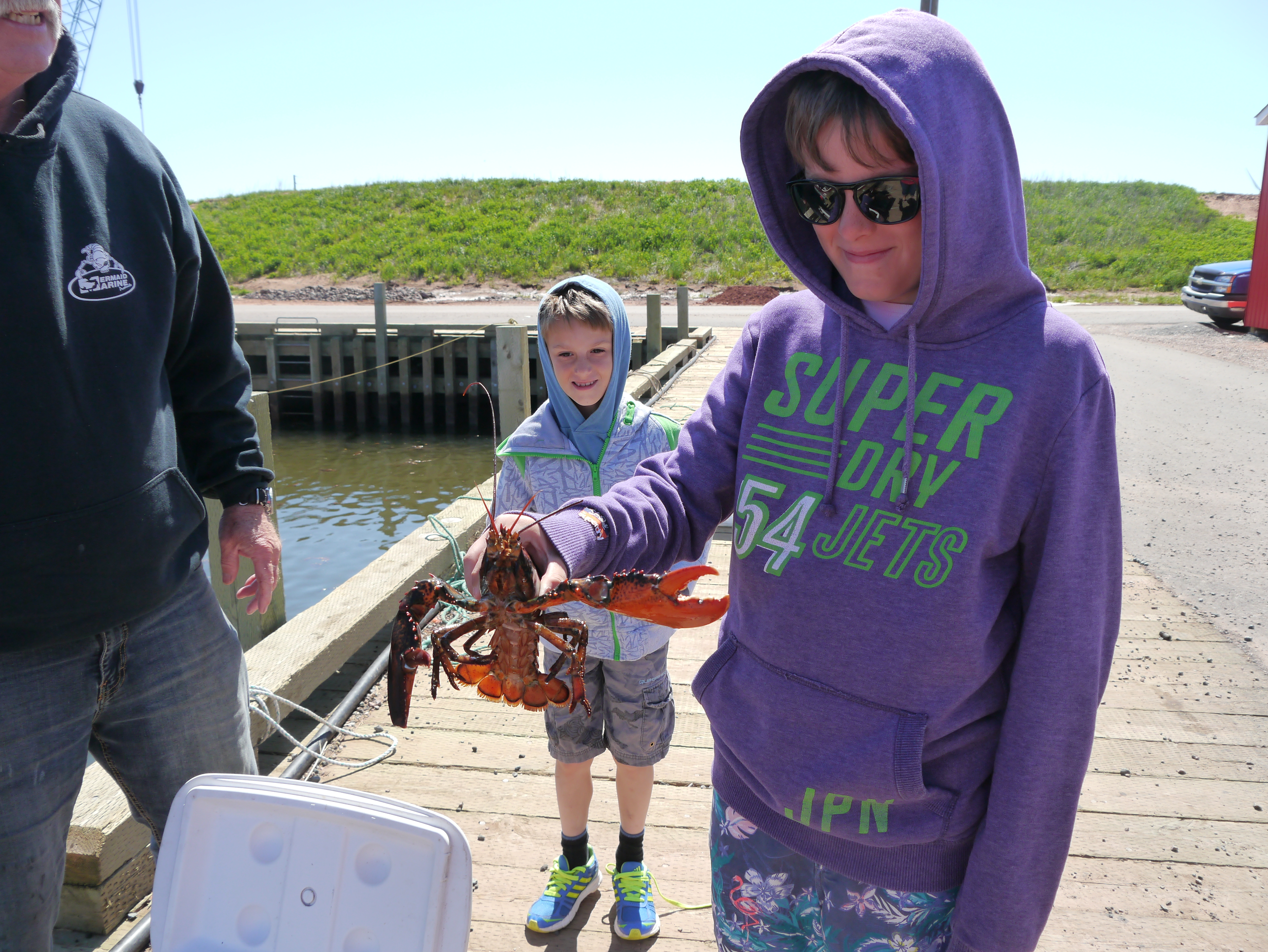 We got chatting to a fisherman just in from collecting up the contents of his lobster pots.  He let the kids hold one and taught them how to put it to sleep by stroking between it’s eyes – just like you do with babies – and it sent it off so much he was able to make it do a handstand on his cool box!