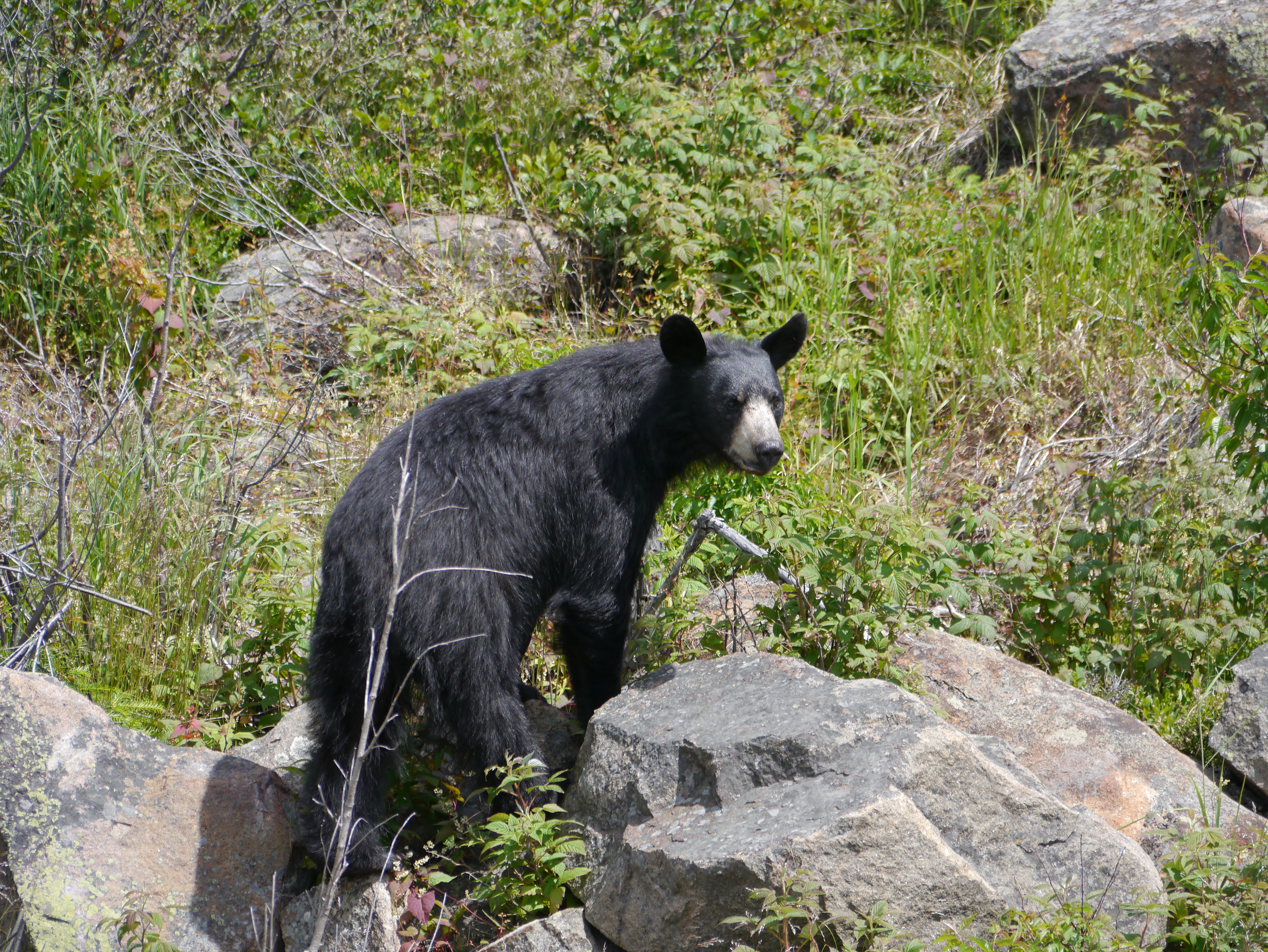 Further on the road while John was calling us to look at yet another stunning vista of the Lake on our left a Black Bear lolloped across the road in front of us causing us to slam on our brakes. He then wandered slowly into the rocky verge and stood looking at us while we squealed and grabbed cameras and phones. He hung around for about 3 minutes before wandering off again. Amazing!!