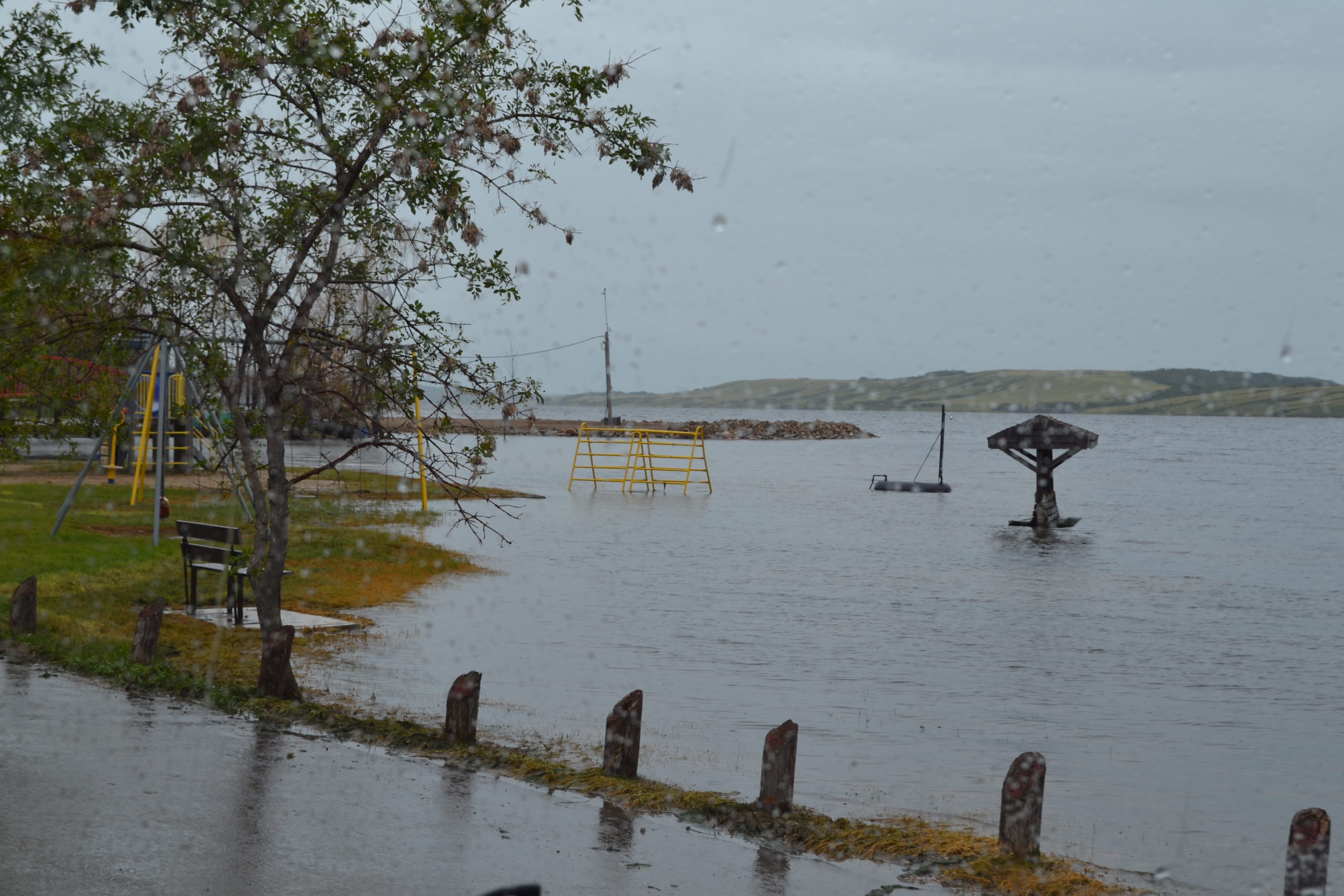 Charlie assured us it would be warm once we were in. The lake was completely flooded and we drove up and down the shore looking for a spot to quietly wade into the waters without drawing too much attention to ourselves. We spotted a motel which was completely washed out, at least 2 pumps going trying to empty the ditches nearby and the ‘beach’ and the pavilion were almost completely submerged.