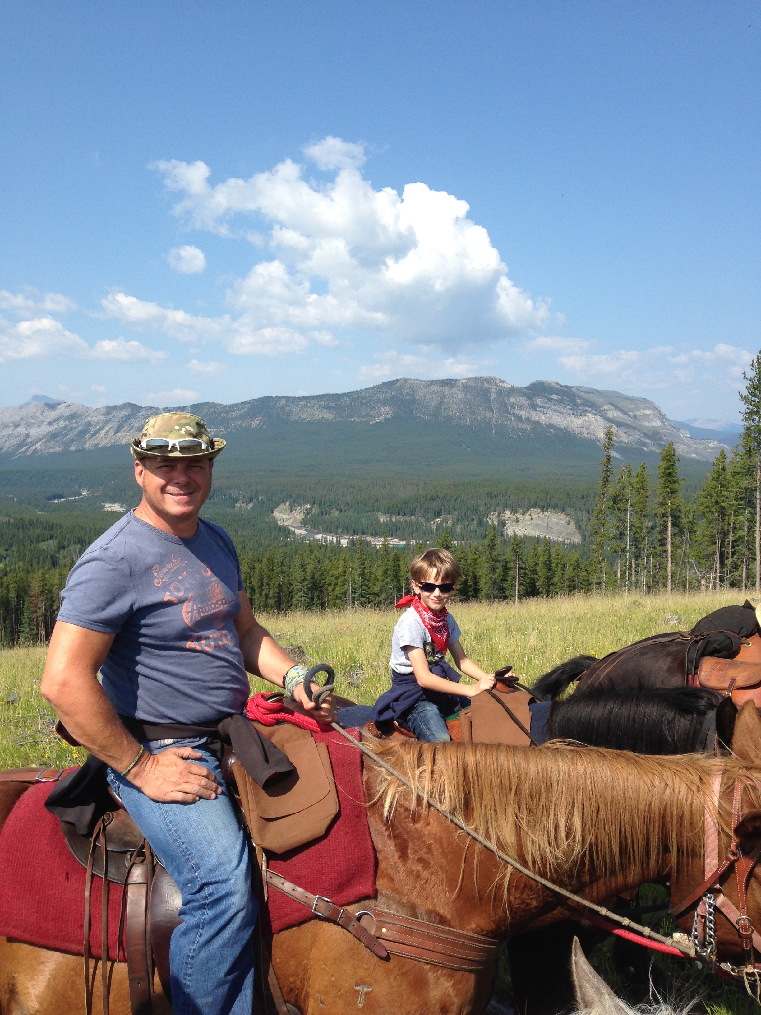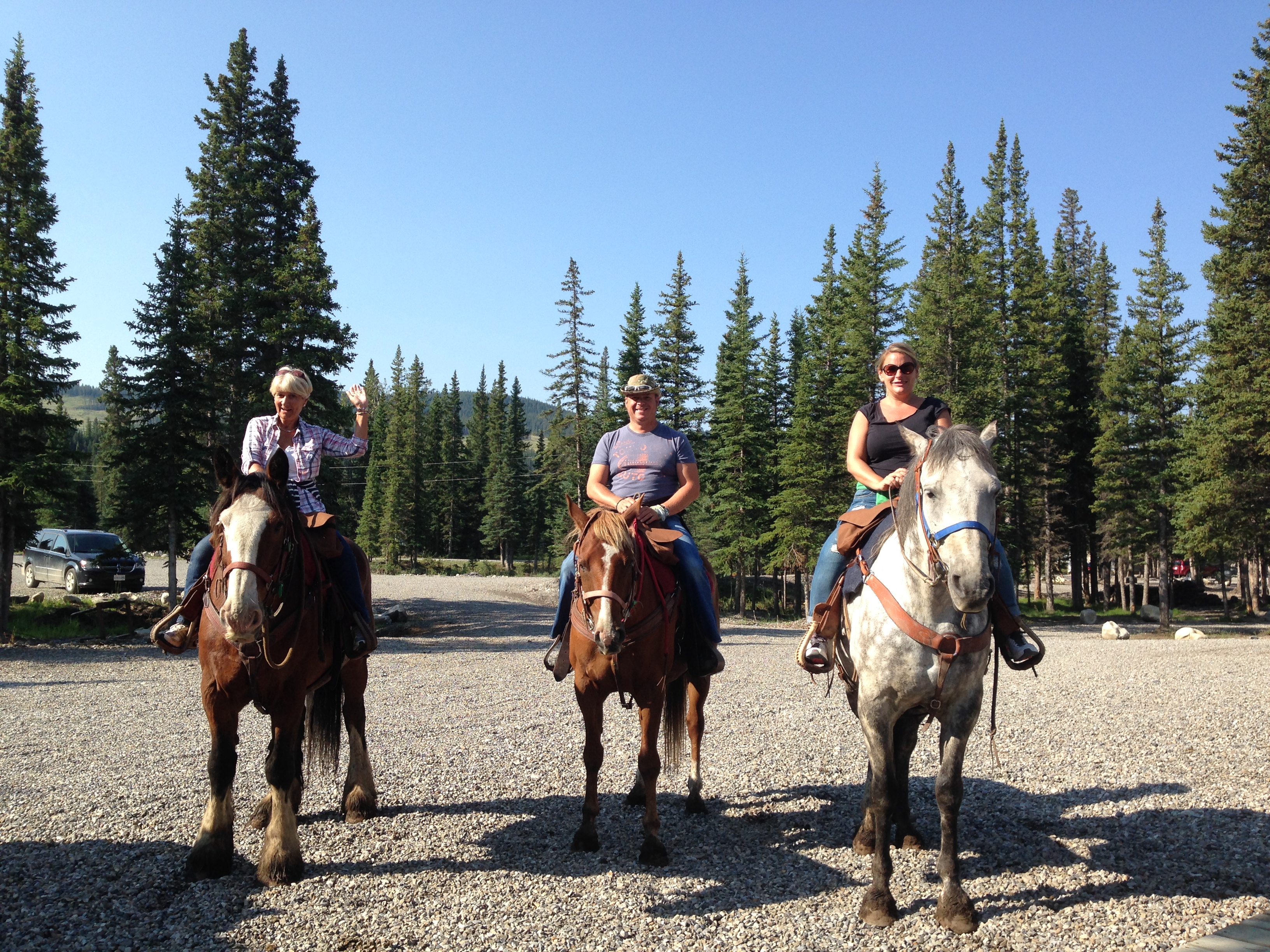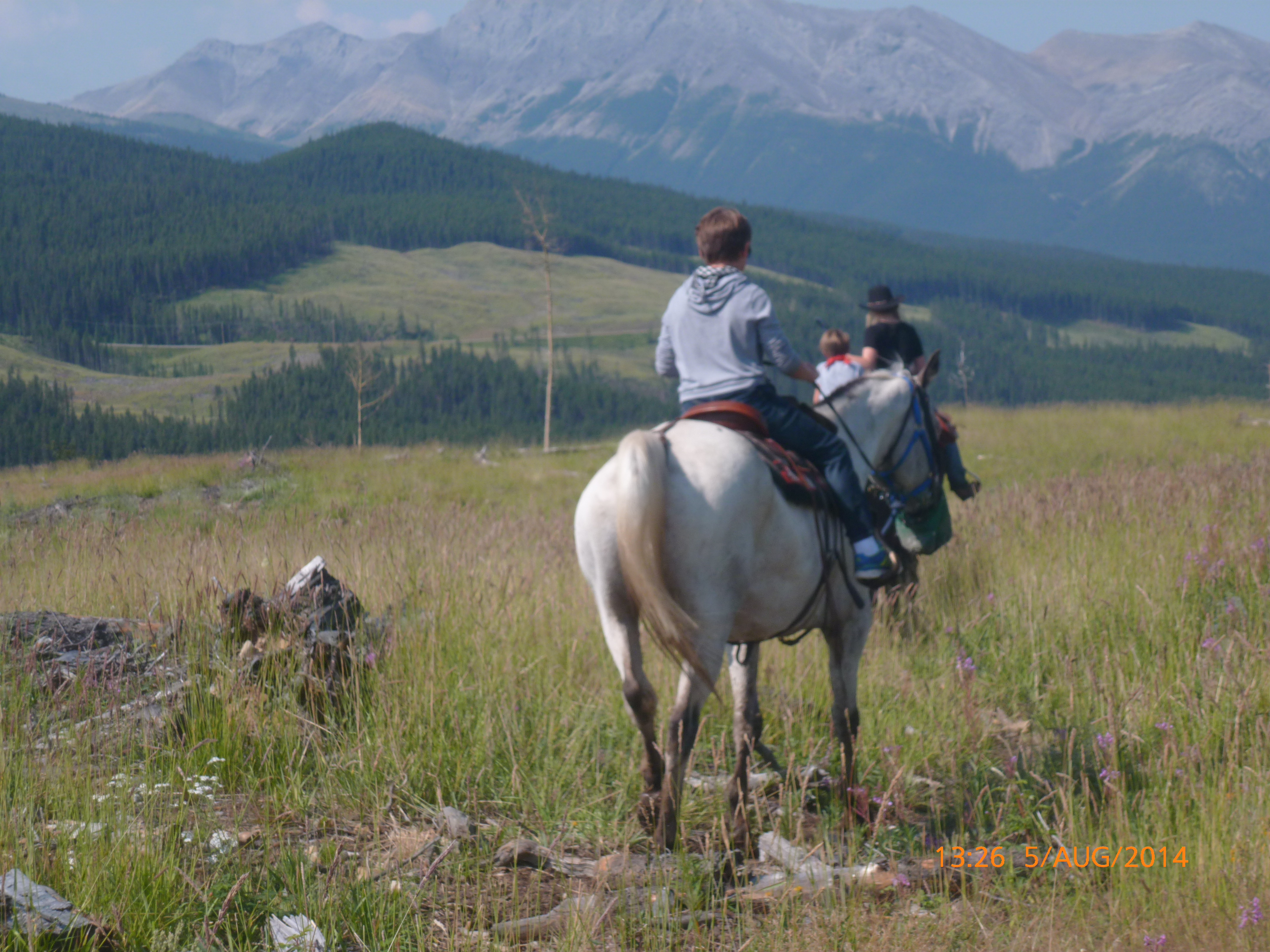 We all surprised ourselves with the terrain we managed to negotiate (well our clever horses did!). Up some incredibly steep paths over fallen trees, through muddy paths, the shallows of the river, forests and then a mountain meadow where the view of the Rockies was just breath taking. We loved it all and felt completely exhilarated with the whole thing. Before we had even dismounted Charlie and Will were both asking when we could do it again.