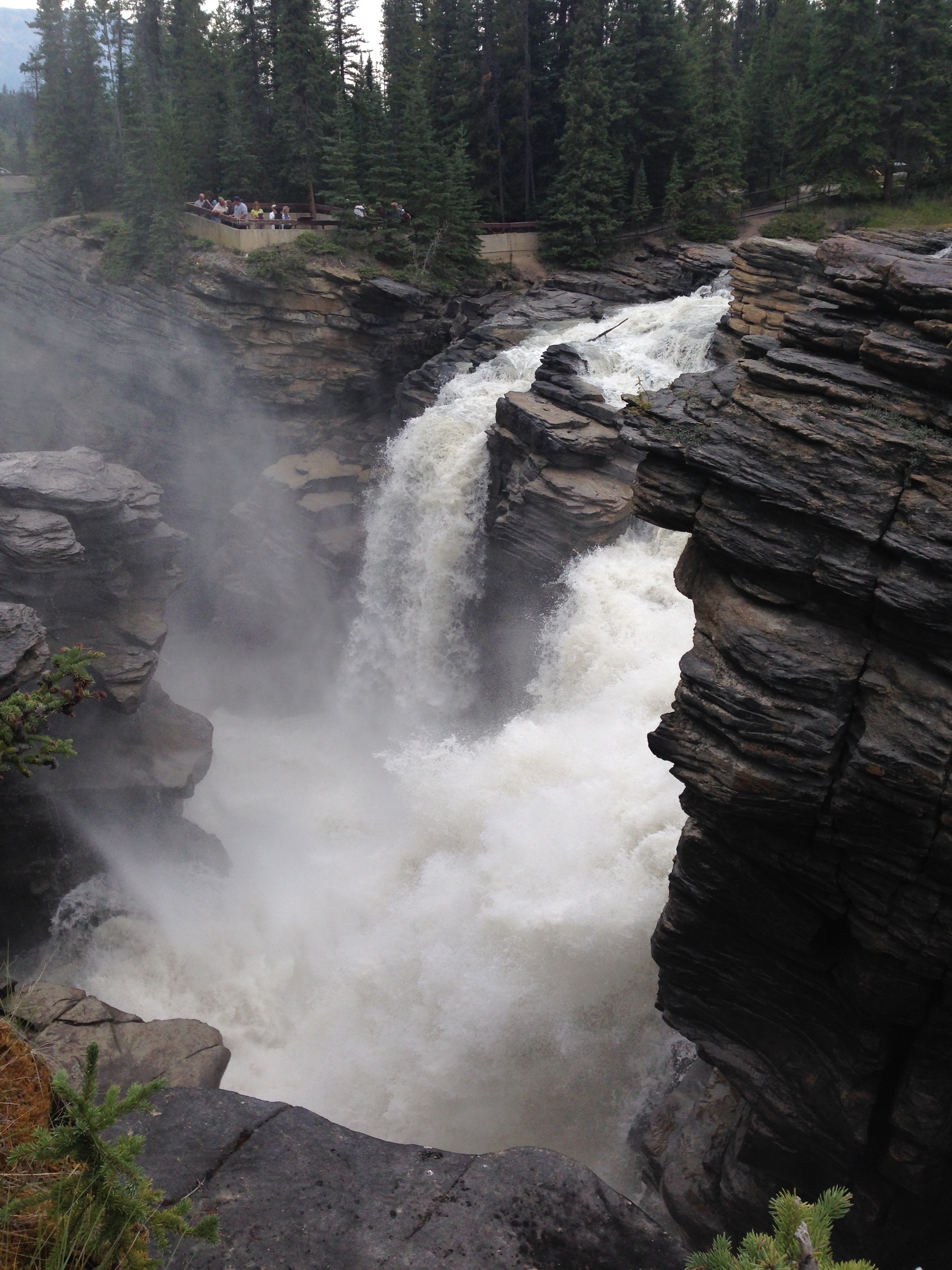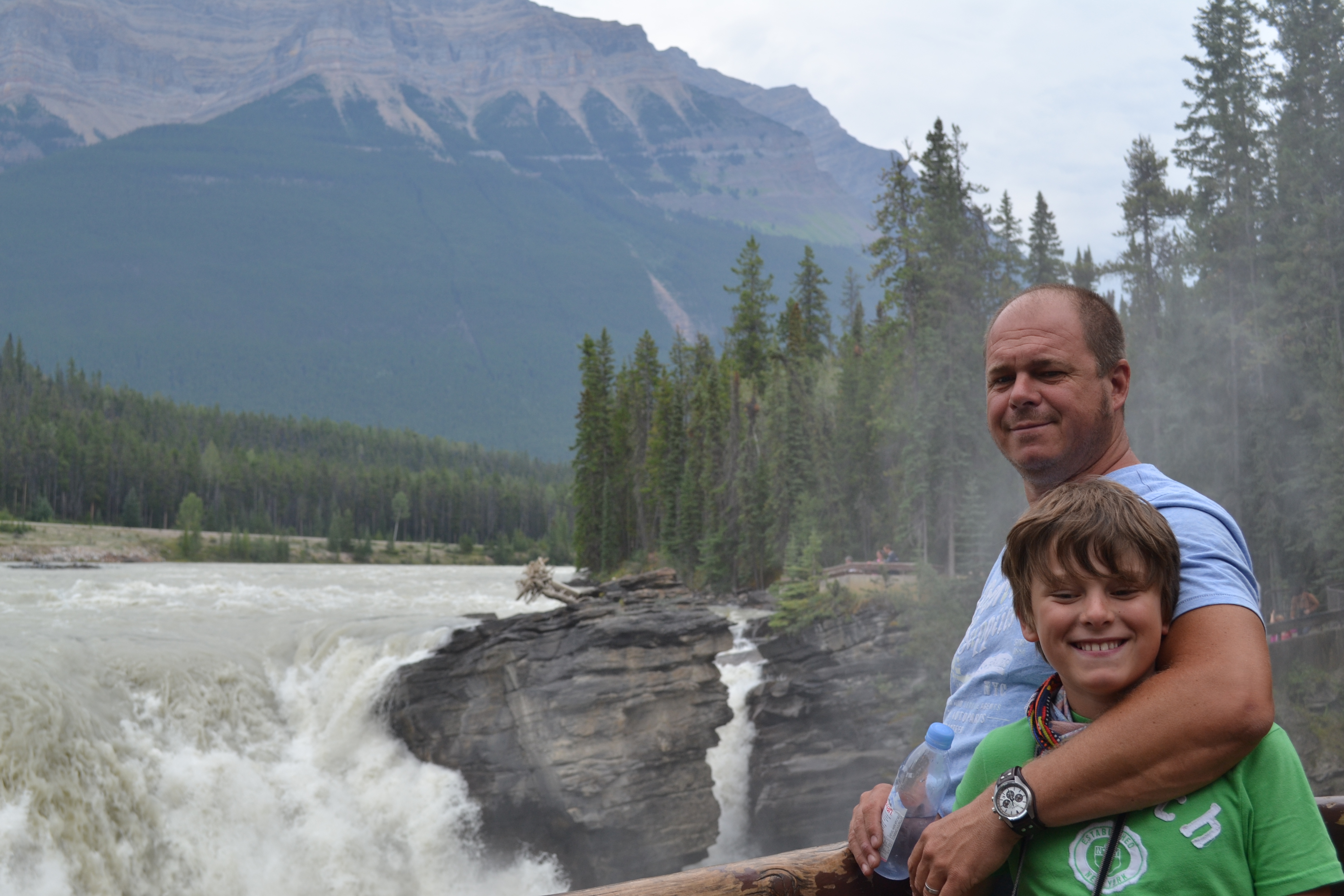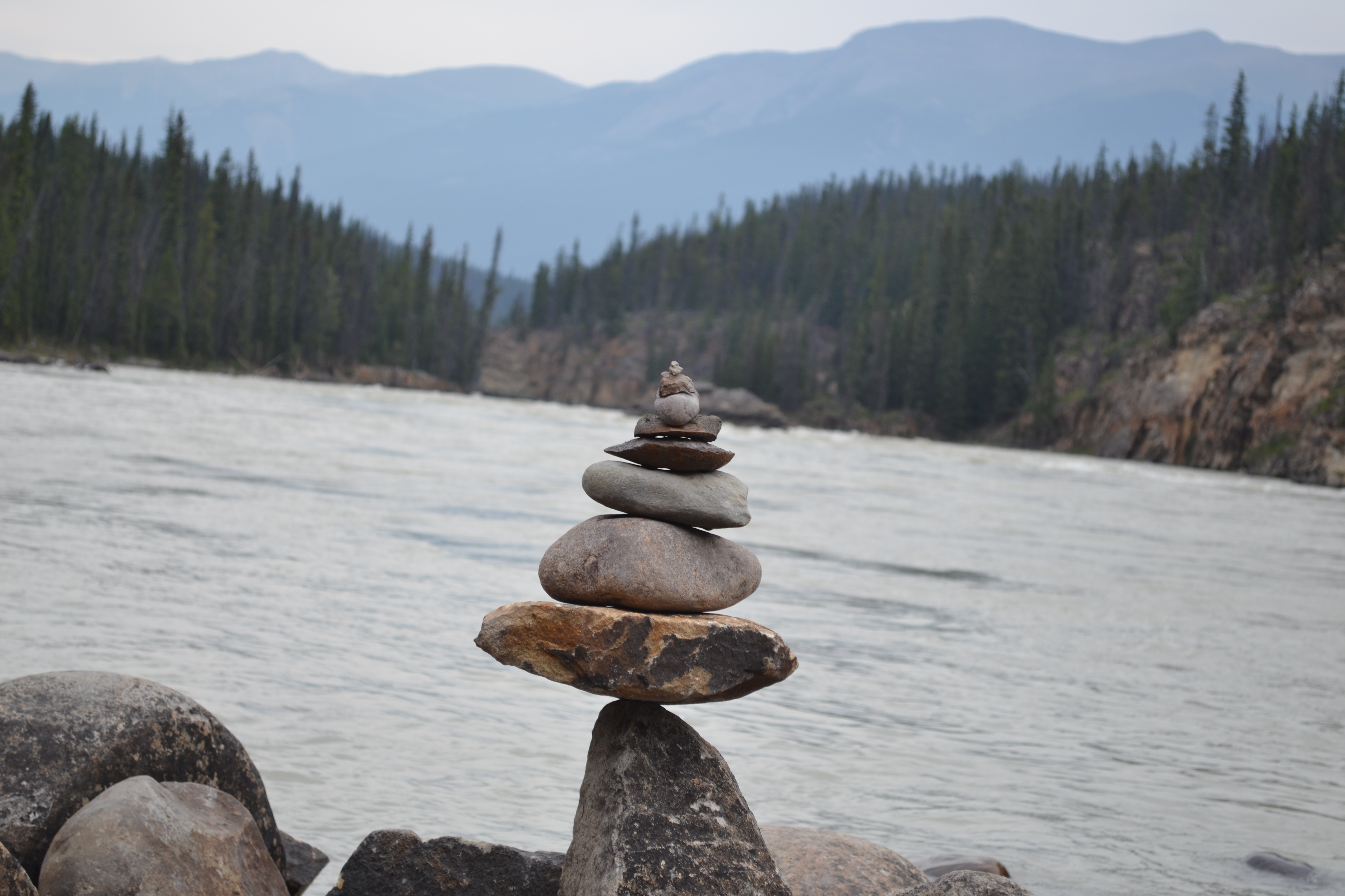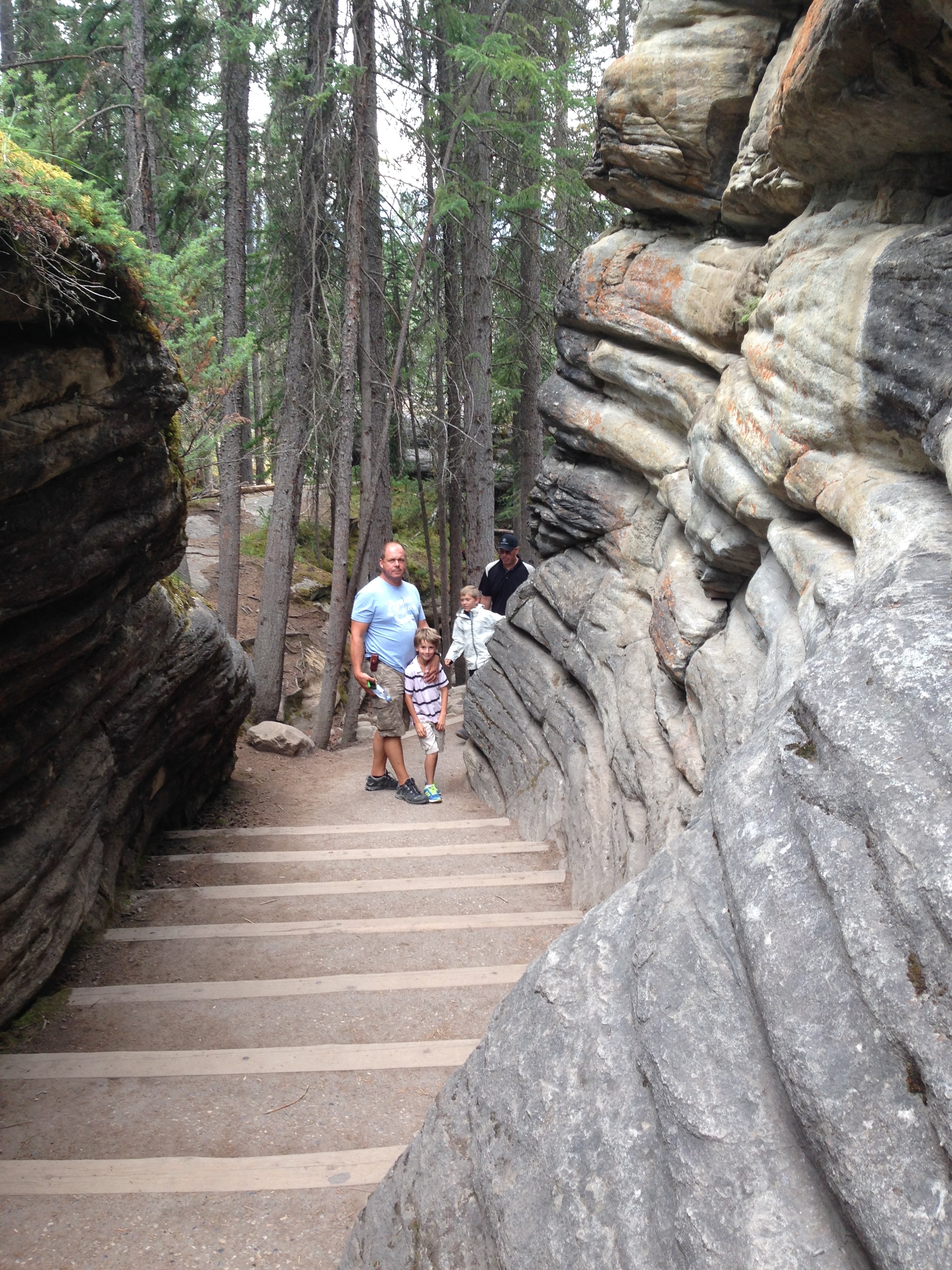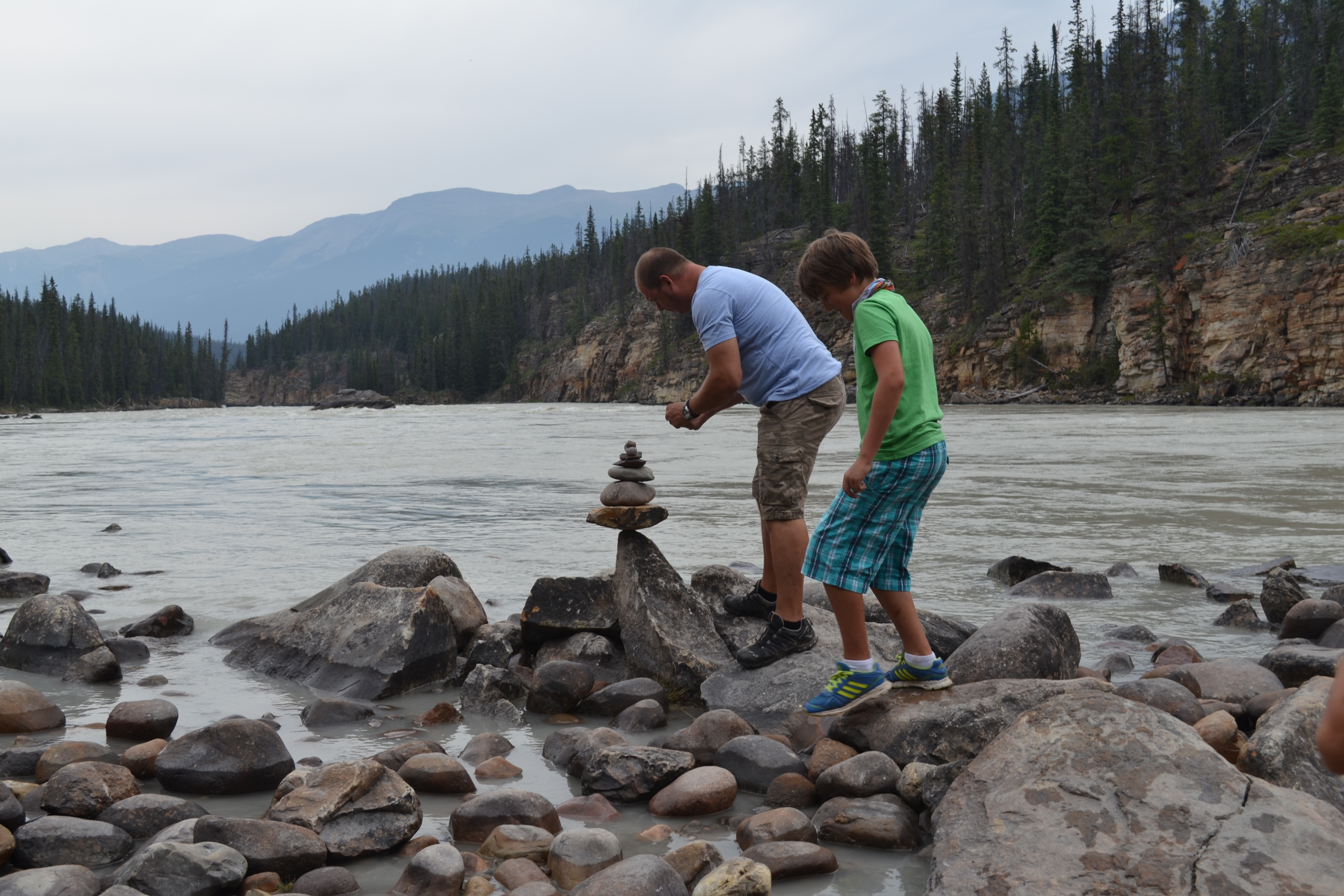 Day 3 in Jasper we drove down a part of the Icefields Parkway and visited the Athabasca and Sunwapta Falls. The Athabasca Falls were the more dramatic. The Athabasca River thunders through a narrow gorge where the walls have been smoothed and great pot holes carved out by the sheer force of the water. You can walk down through the old route the river down to the bottom. Here John crafted his very own Inuksuik while the kids did their best to sabotage his best efforts.