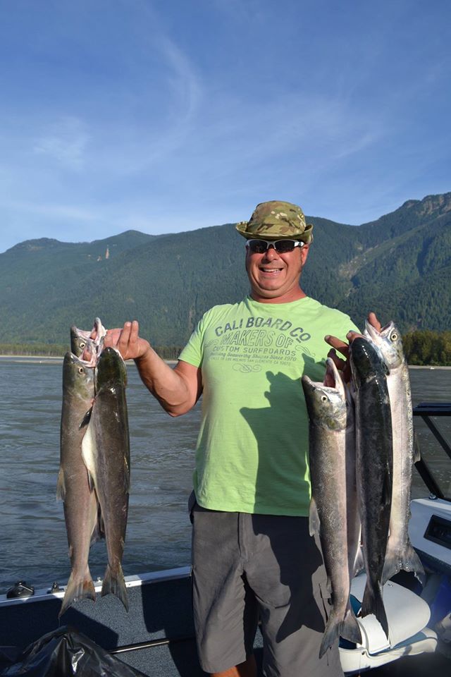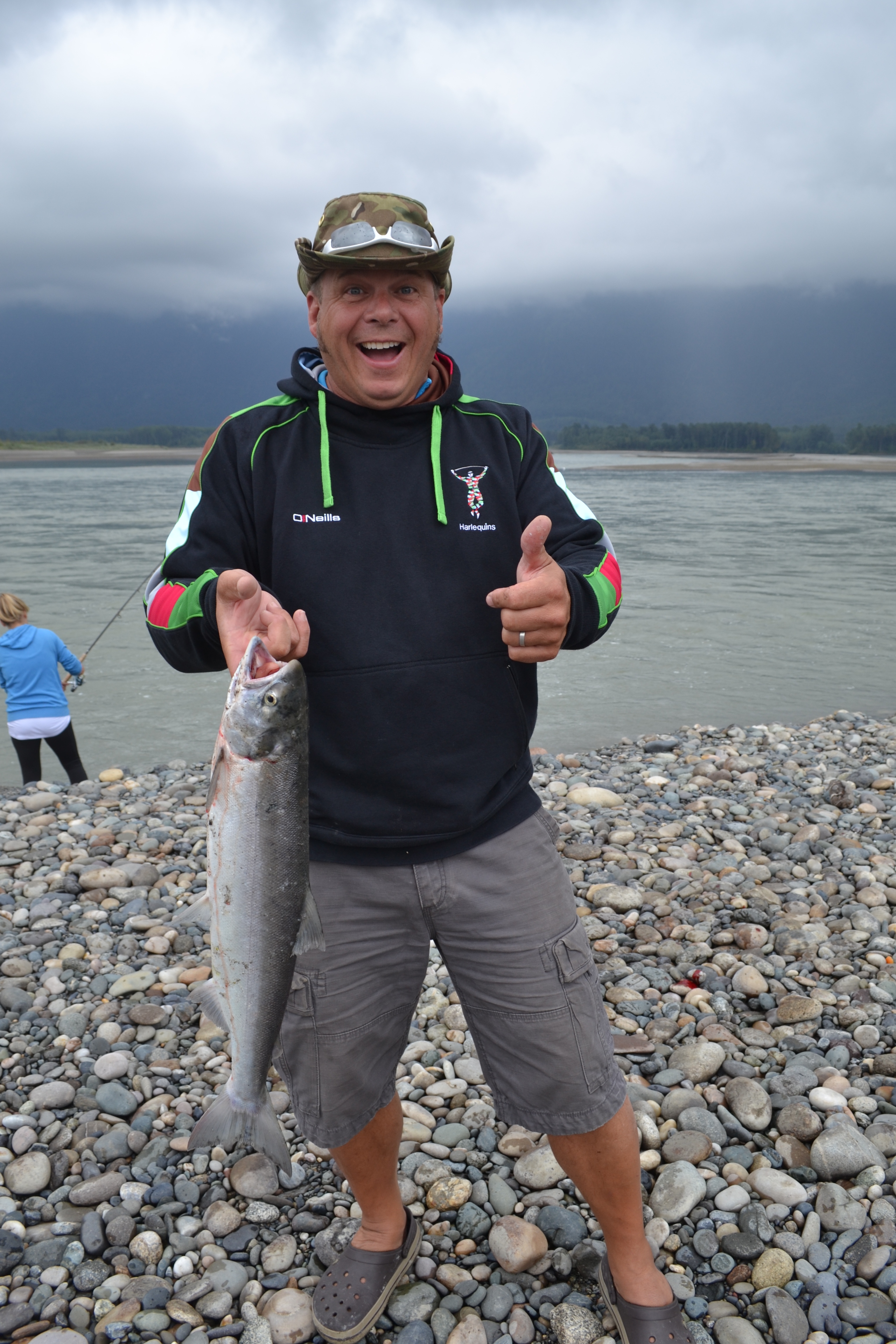 Within minutes of arriving 2 guys along the river from us who had obviously already got their 2 each and were now only interested in hooking some huge Spring Salmon asked the boys if they wanted to reel in the smaller sock eye they had just hooked. So they immediately wrestled in a couple of huge salmon, which went into our cool box!