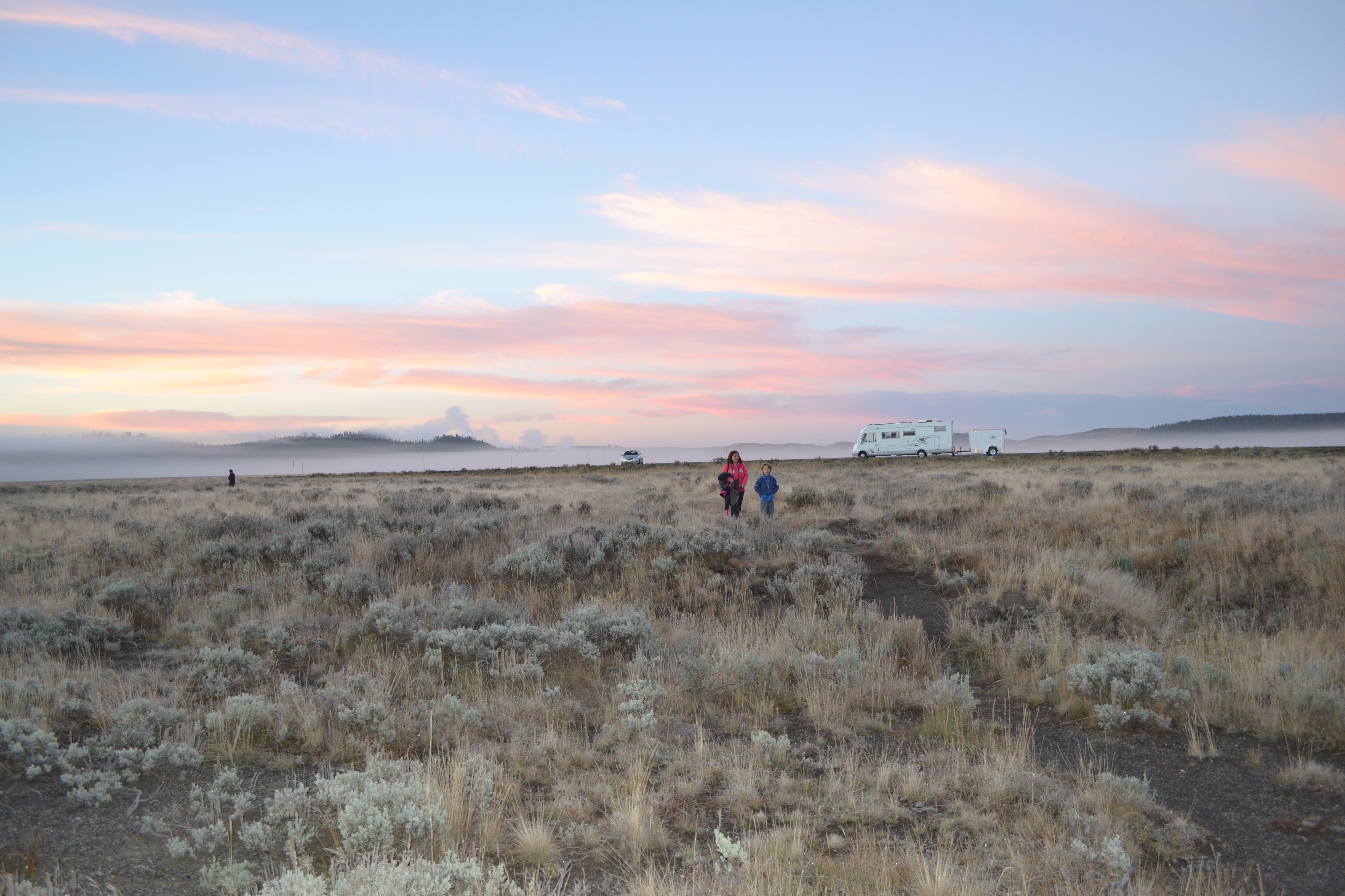 Day 3 we set the alarm for 6am so we could be back up at Hayden Valley with the sunrise to try to spot some more wildlife. As we were hooking up the trailer we heard dozens of wolves howling very near by. Exciting and somewhat scary. William was beside himself (Charlie was still snoring in the back of the van – we left him sleeping till the last possible minute). Even though I was holding open my eyes with matchsticks and guzzling coffee I must confess it was very special driving through Yellowstone as the mist rolled across and herds of bison wandered slowly across the road in front of us.