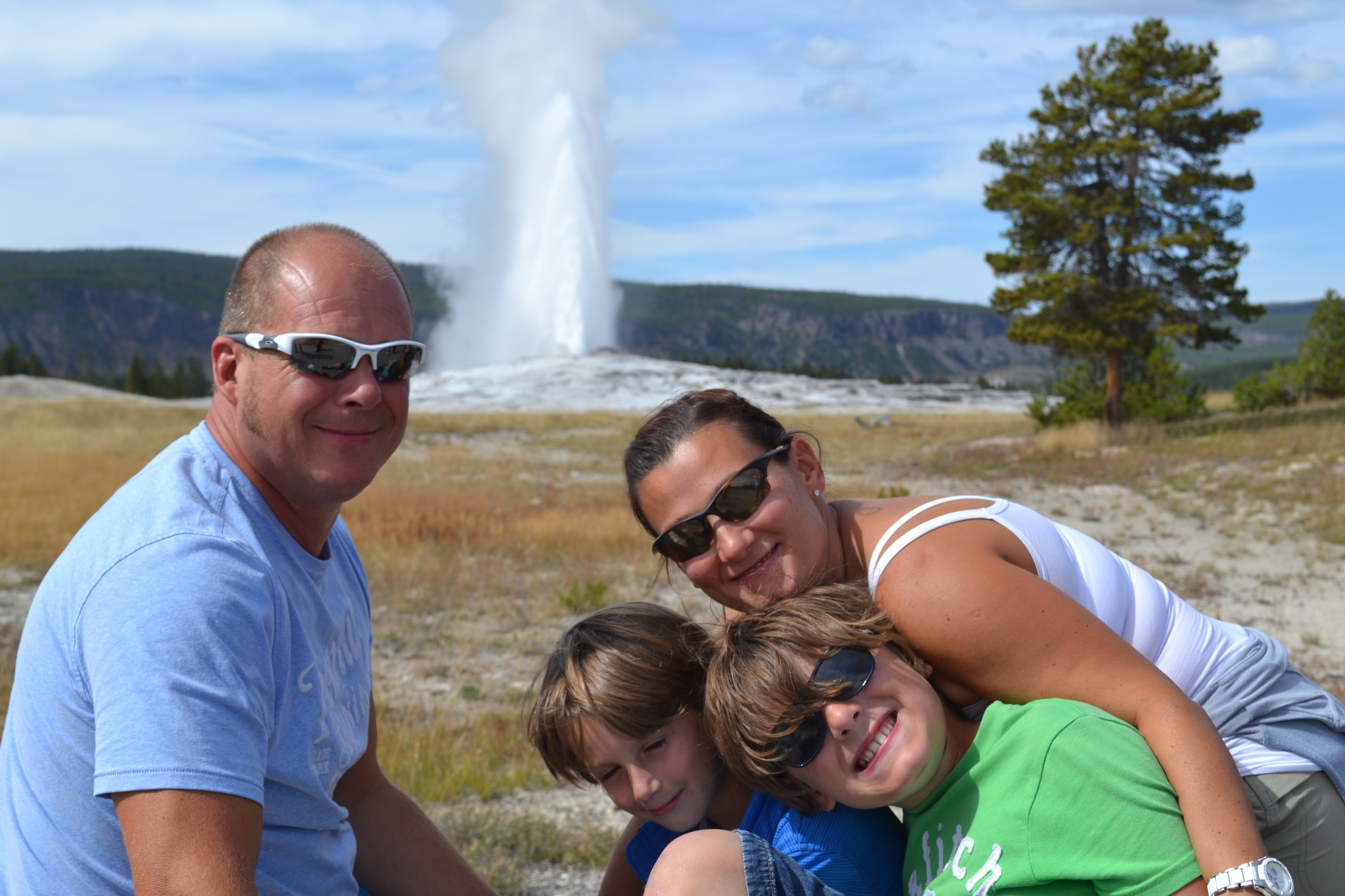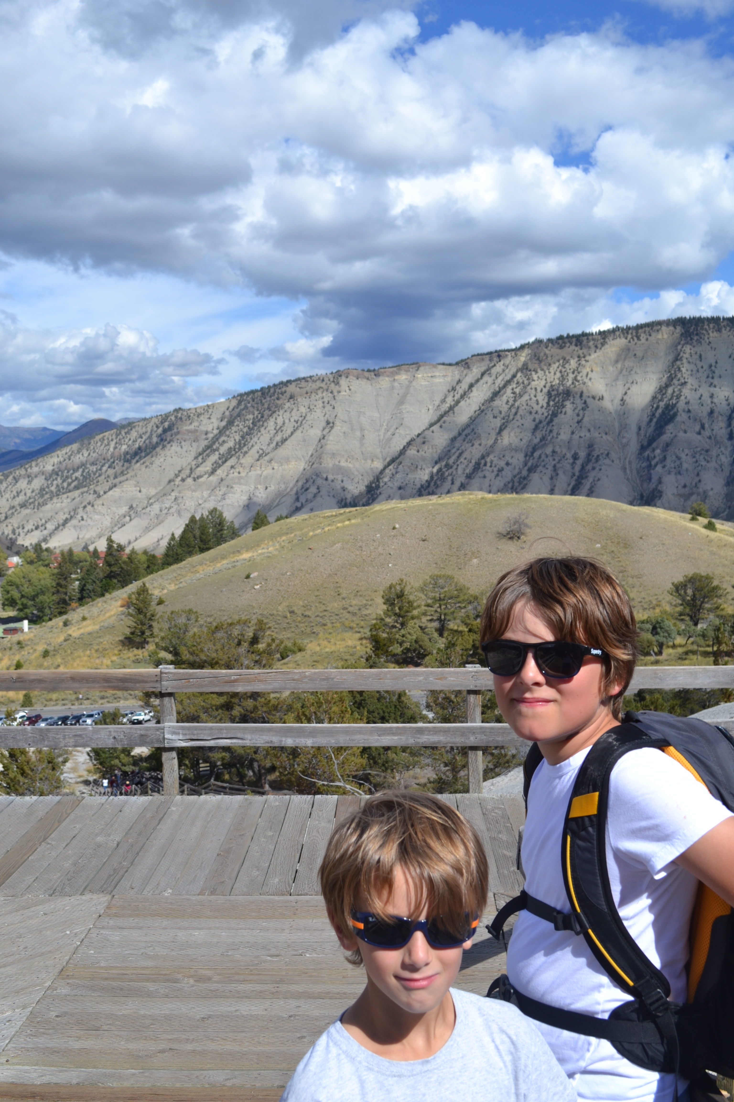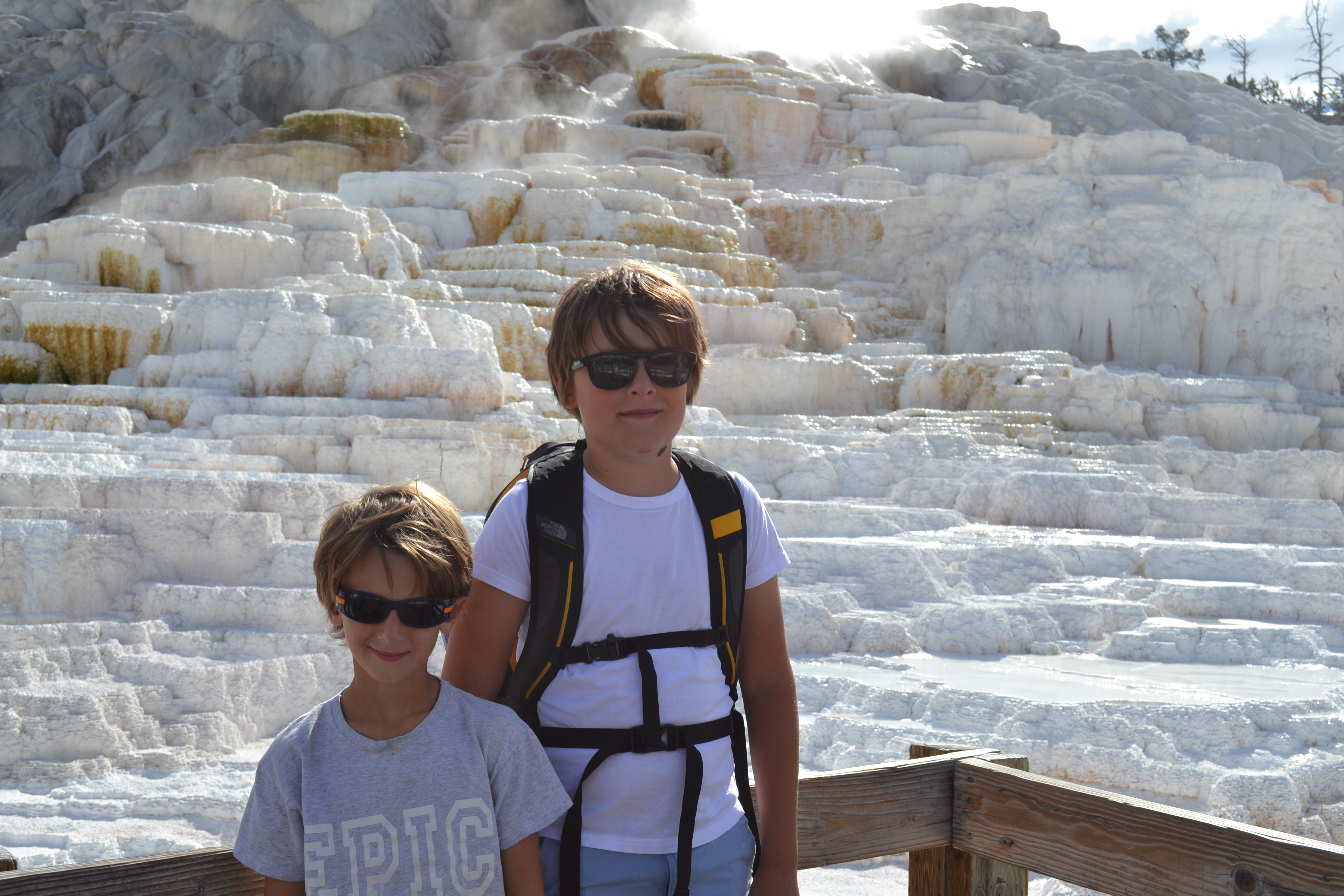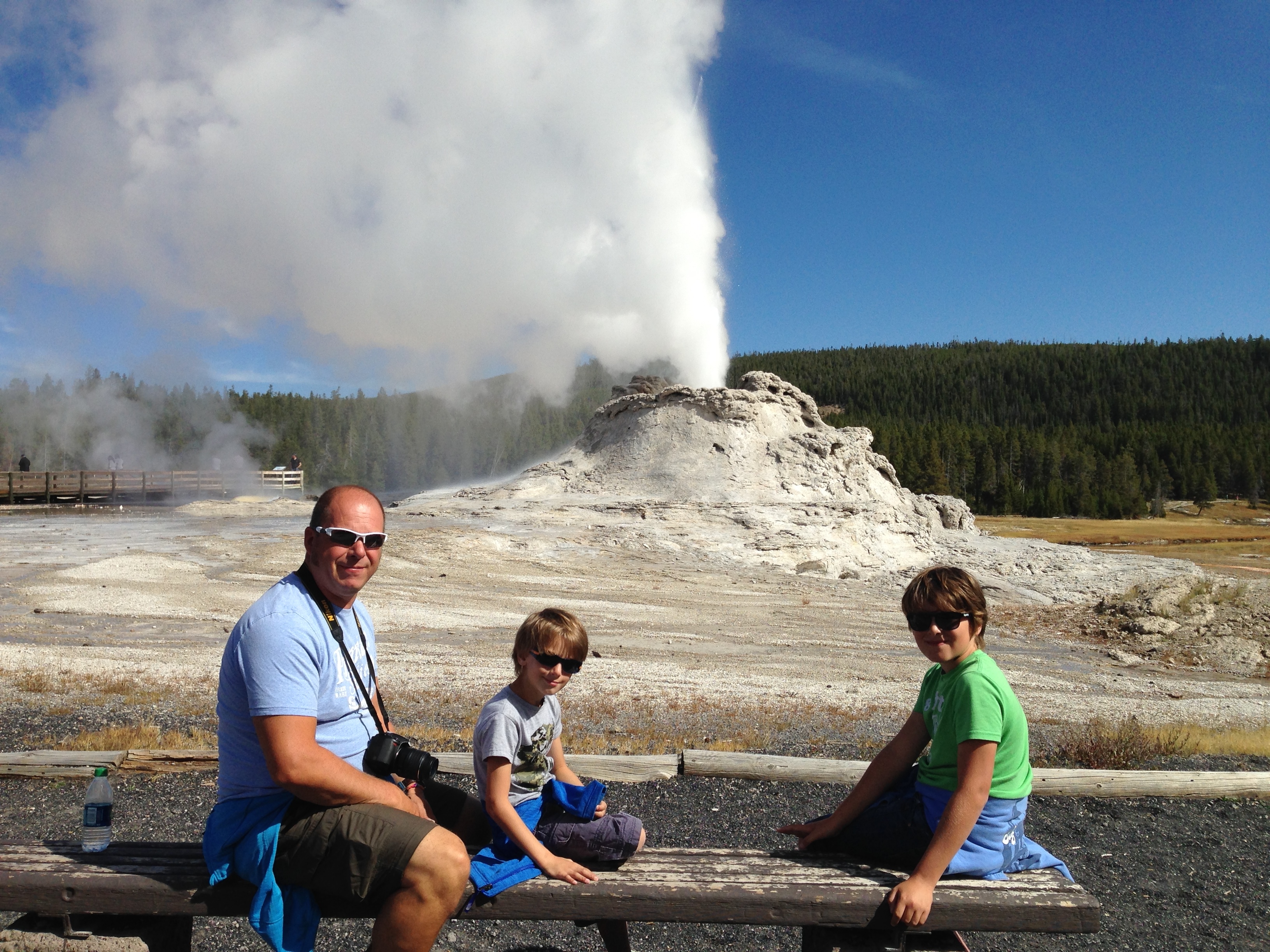 Once we were done there we finally headed towards Old Faithful and the other active geysers in that area. We pulled into the car park just as Old Faithful did its thing (it’s thing being spraying boiling hot water 90-180’ into the air every 90 minutes for 5 minutes or so while being observed by hundreds of tourists sat around it on the strategically placed benches). Gutted we hadn’t been there to actually witness the moment of it’s ‘eruption’ we walked the boardwalks and took in other incredible pools and geysers in this area before heading back and watching it one more time. Castle Geyser we actually preferred. The 12’ cone resembles a castle (hence the name) and although it only sprays 60-90’ into the air, you can walk within a few metres of it and in fact take a rather refreshing shower in the spray as the boys discovered!!