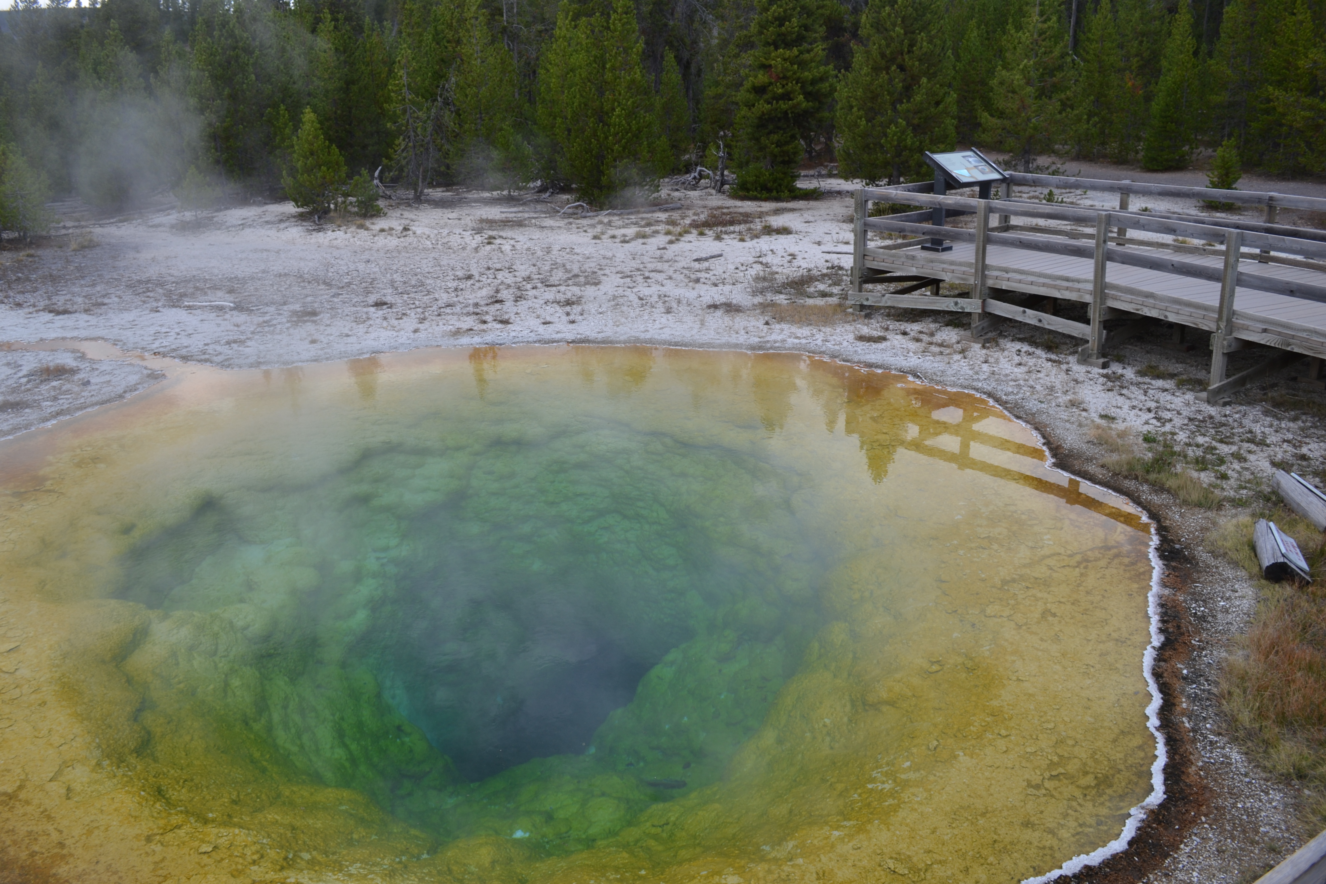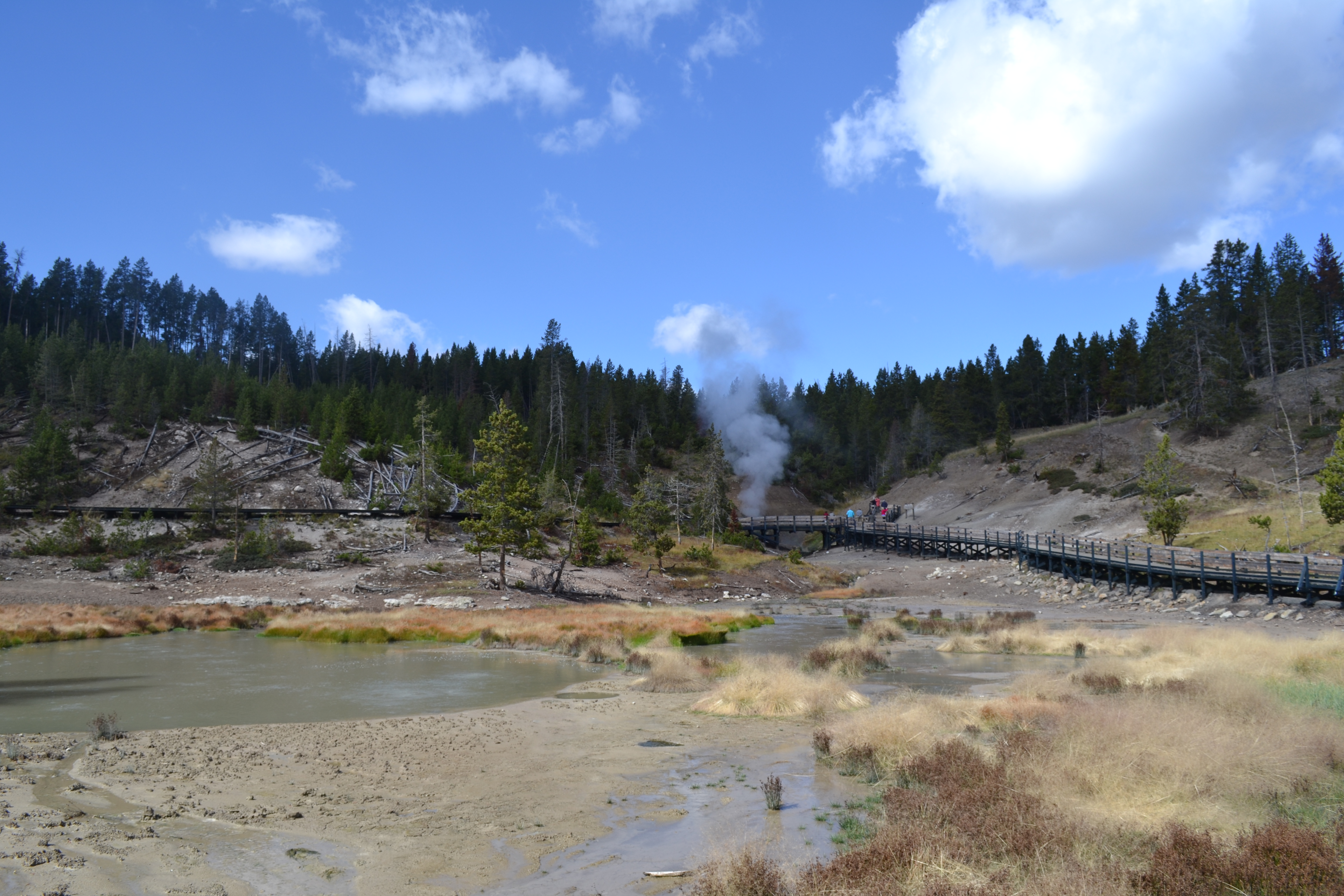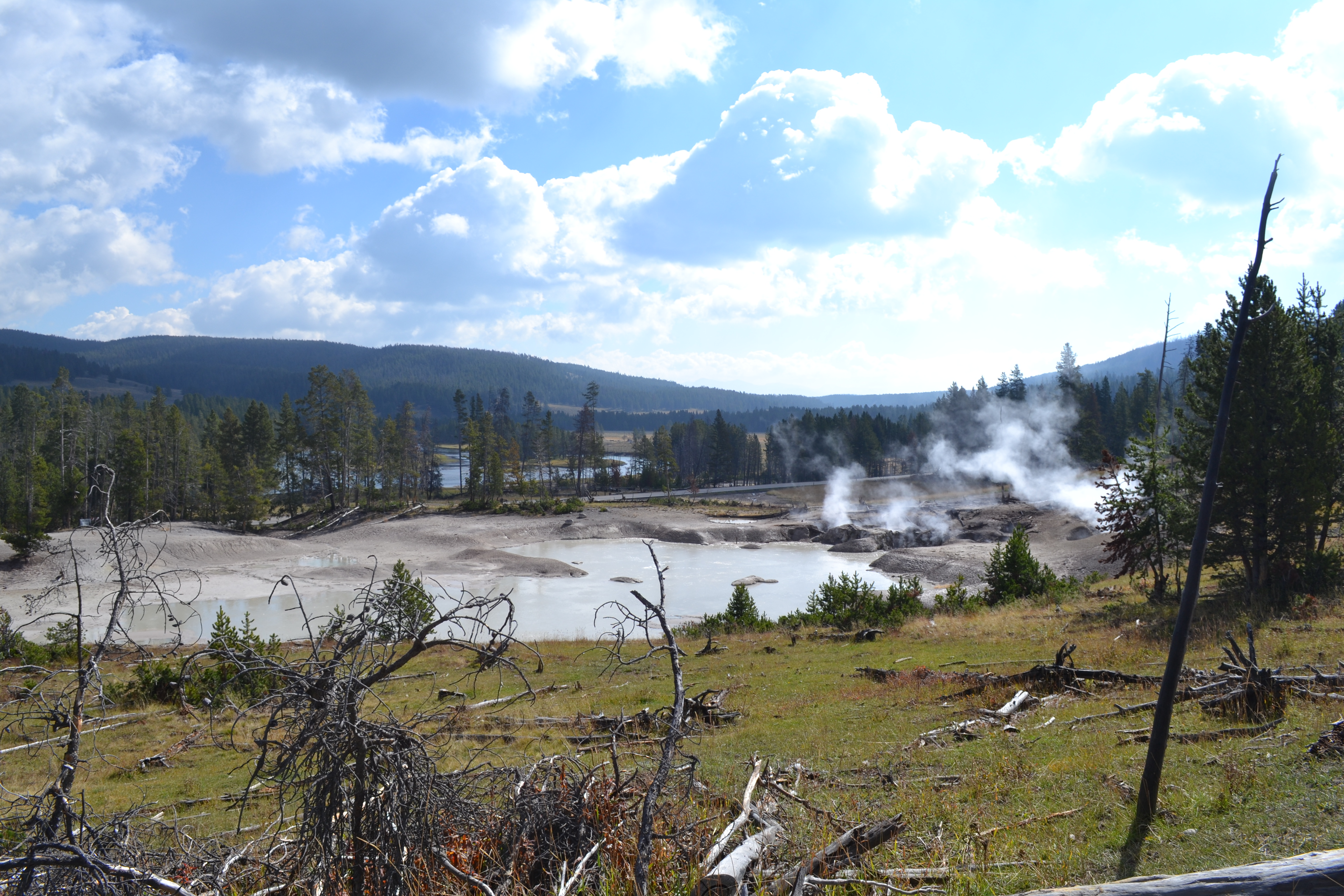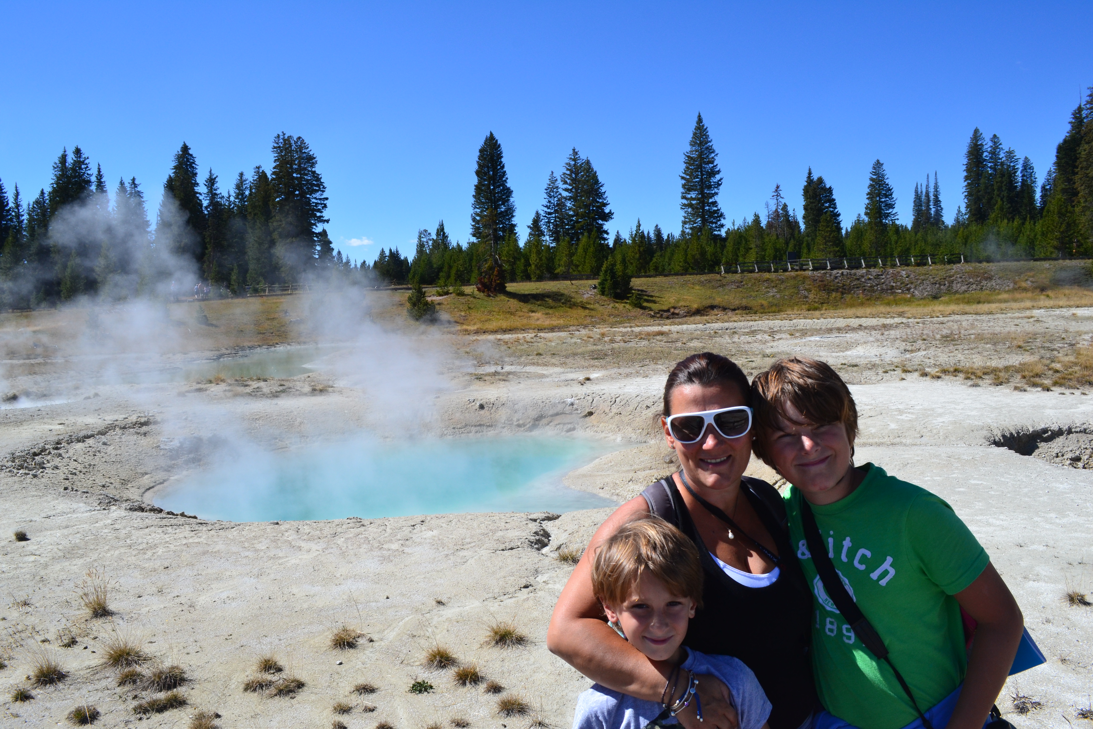 So anyway, Mud Volcano. Got our first sniff of that famous Yellowstone smell – yummy sulphur. Cue the first of literally hundreds of fart jokes, which we were to endure over the next few days. Our first proper glimpse at some of the incredible pools we were to see. Especially Sour Lake which although beautiful would melt your skin off were you to decide to take a swim in it – much like battery acid. Again, kids delighted at this idea and spent hours discussing what would have happened to us had we been in Frankie if / when our battery would have exploded.