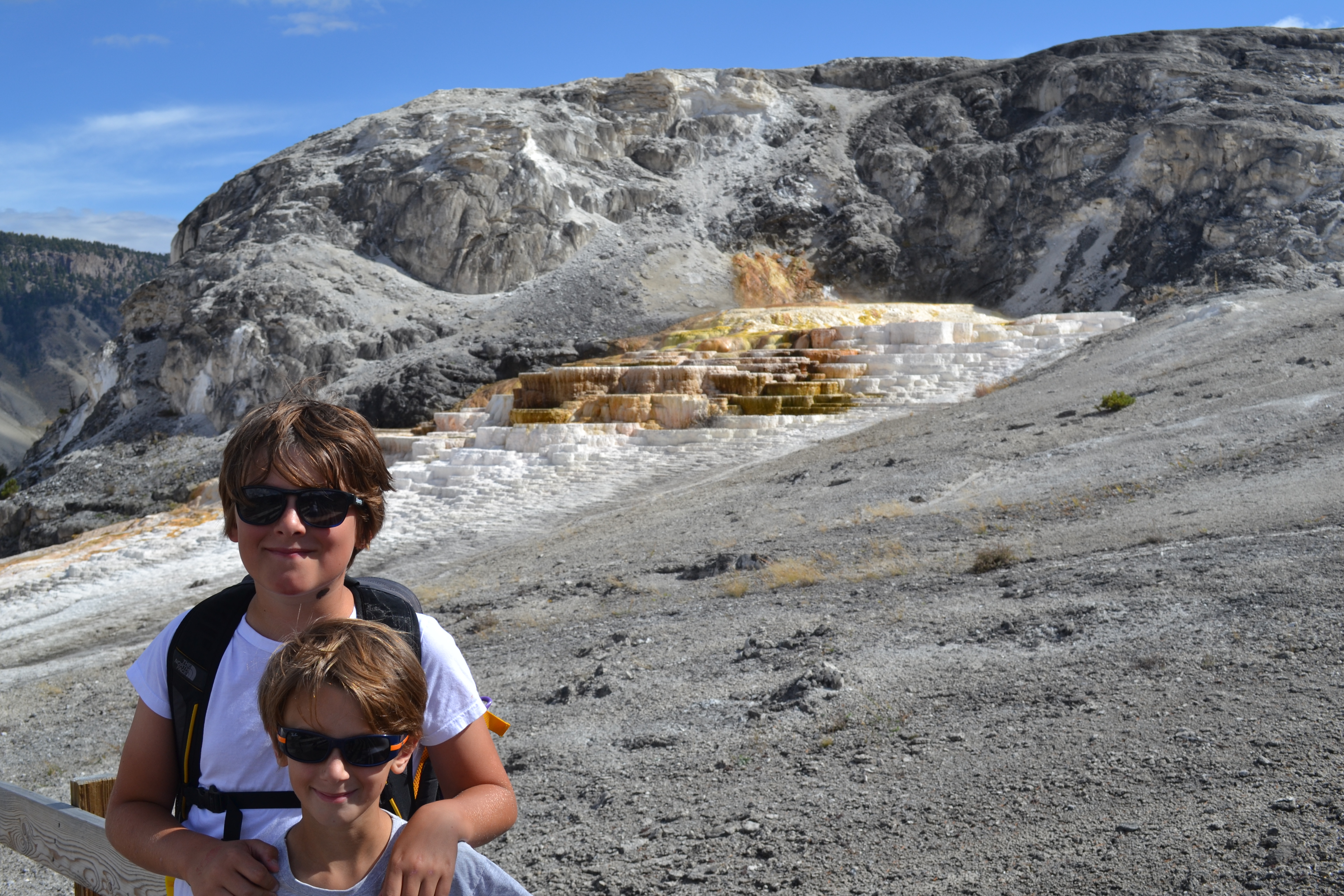 On Friday we joined a Park Ranger led tour of Mud Volcano. We were really glad we did. We learnt all about the make up of Yellowstone in that couple of hours and the kids got started on their Yellowstone Junior Ranger programmes. All the National Parks have these great programs for kids apparently. We will certainly be taking advantage of these fantastic resources. The kids loved doing them and were especially delighted with the fabric badges they got at the end of completing them. (Not sure who they think will be sewing those on for them – although actually as John successfully mended the seats in Frankie recently he appears to be the family tailor!).