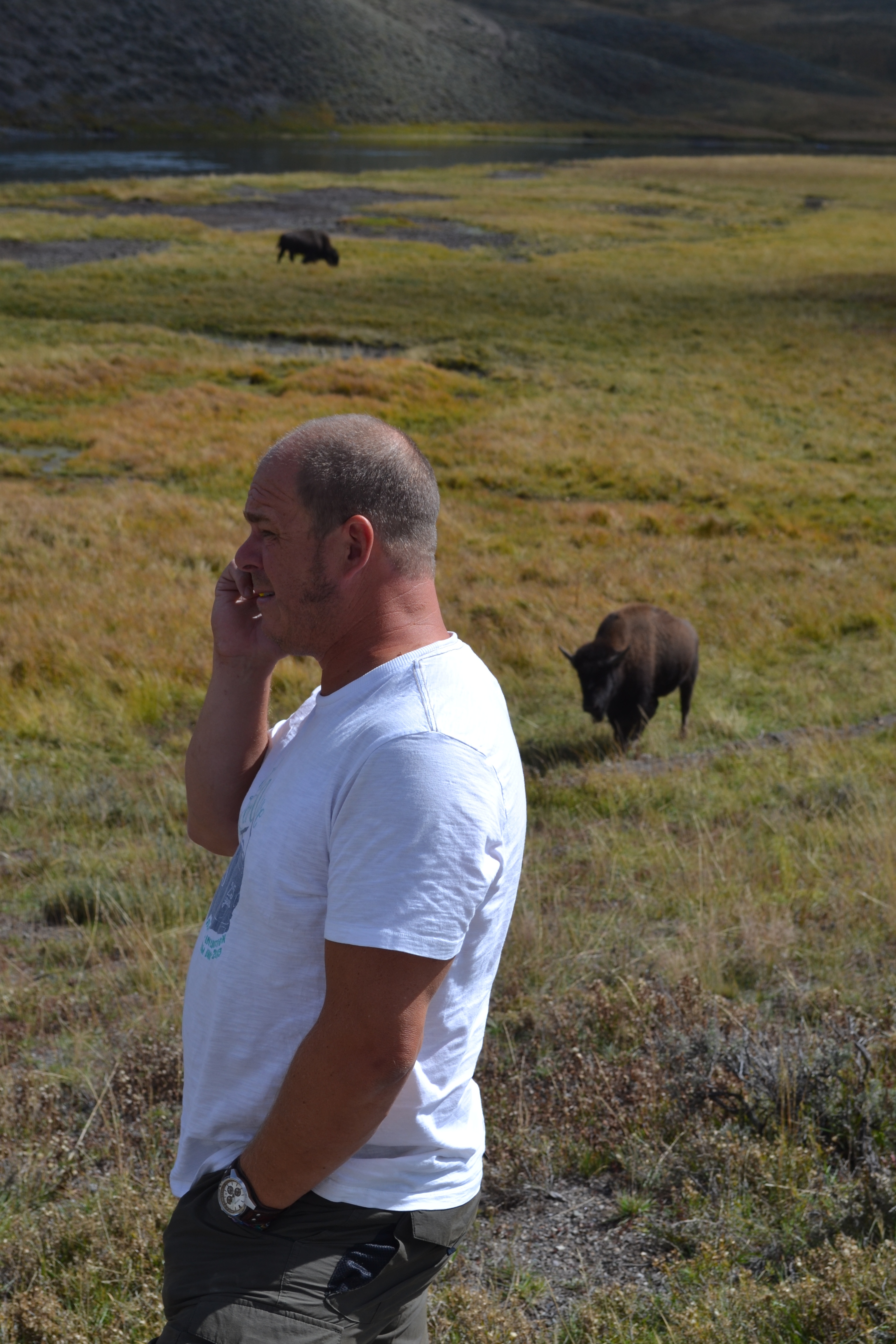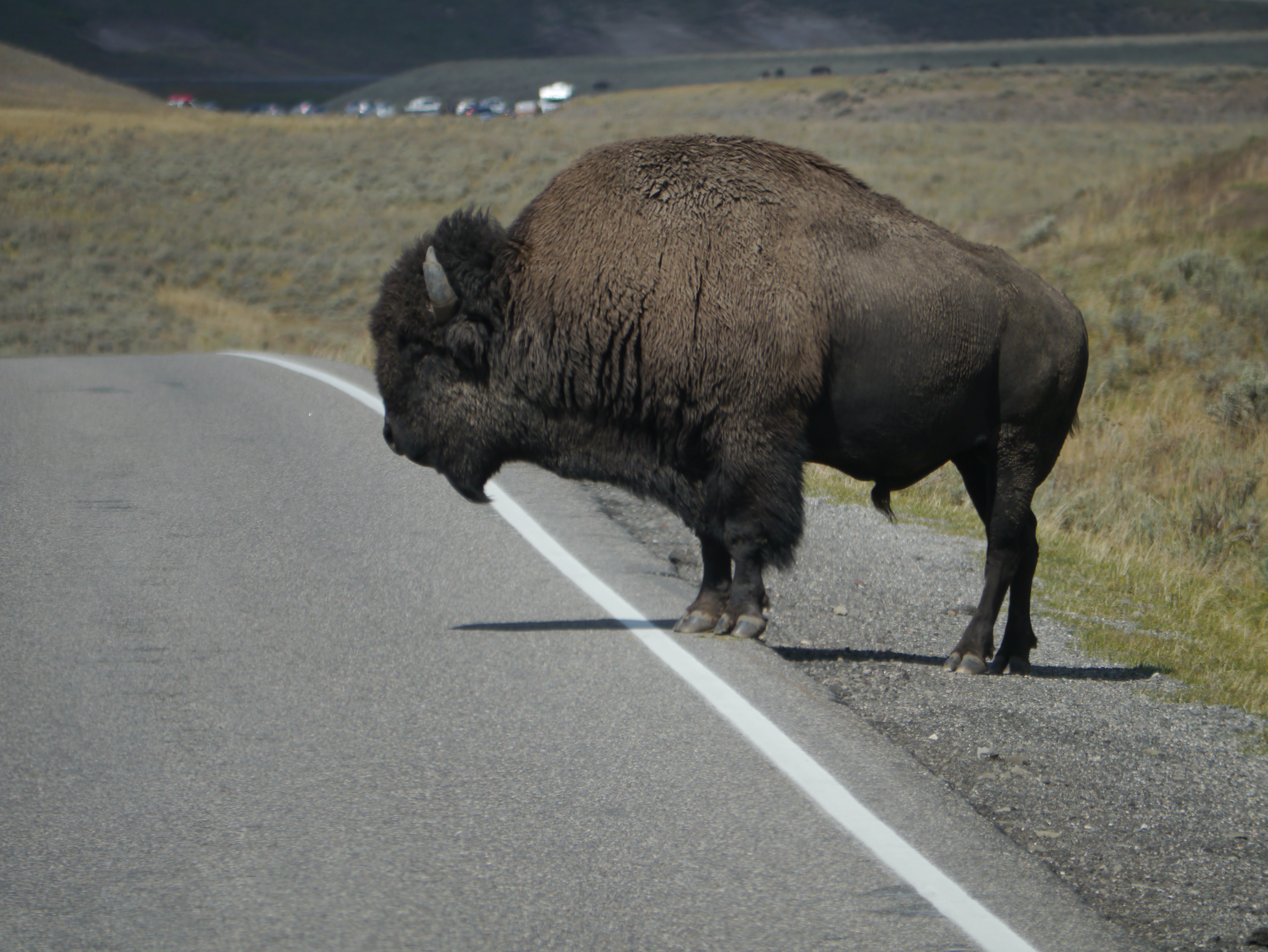 I mentioned the bison we were so excited to see on our arrival at the park. We had made a special trip in Canada to see bison and yet here were 100’s of them. I don’t think we made a single journey across the park withuot having to stop for a few dozen bison to meander across the road. But everyone loved them and stopped to take photos and get as close to them as possible. Despite endless warnings about how they are ‘wild animals’. We spotted so many people getting far closer than the recommended 100’. Sometimes it was impossible to be that far away from them as they wandered everywhere – in and out of the mud pools, at the edges of the hot springs (the rangers didn’t seem to be able to explain why they would chose to go so close). But at one stage when a group were being particularly annoying to one poor bison quietly minding his own business grazing at the edge of a carpark we saw him charge. Hmmm I wouldn’t want to be on the wrong side of an animal that weighs over a tonne and can run 30 mph!!