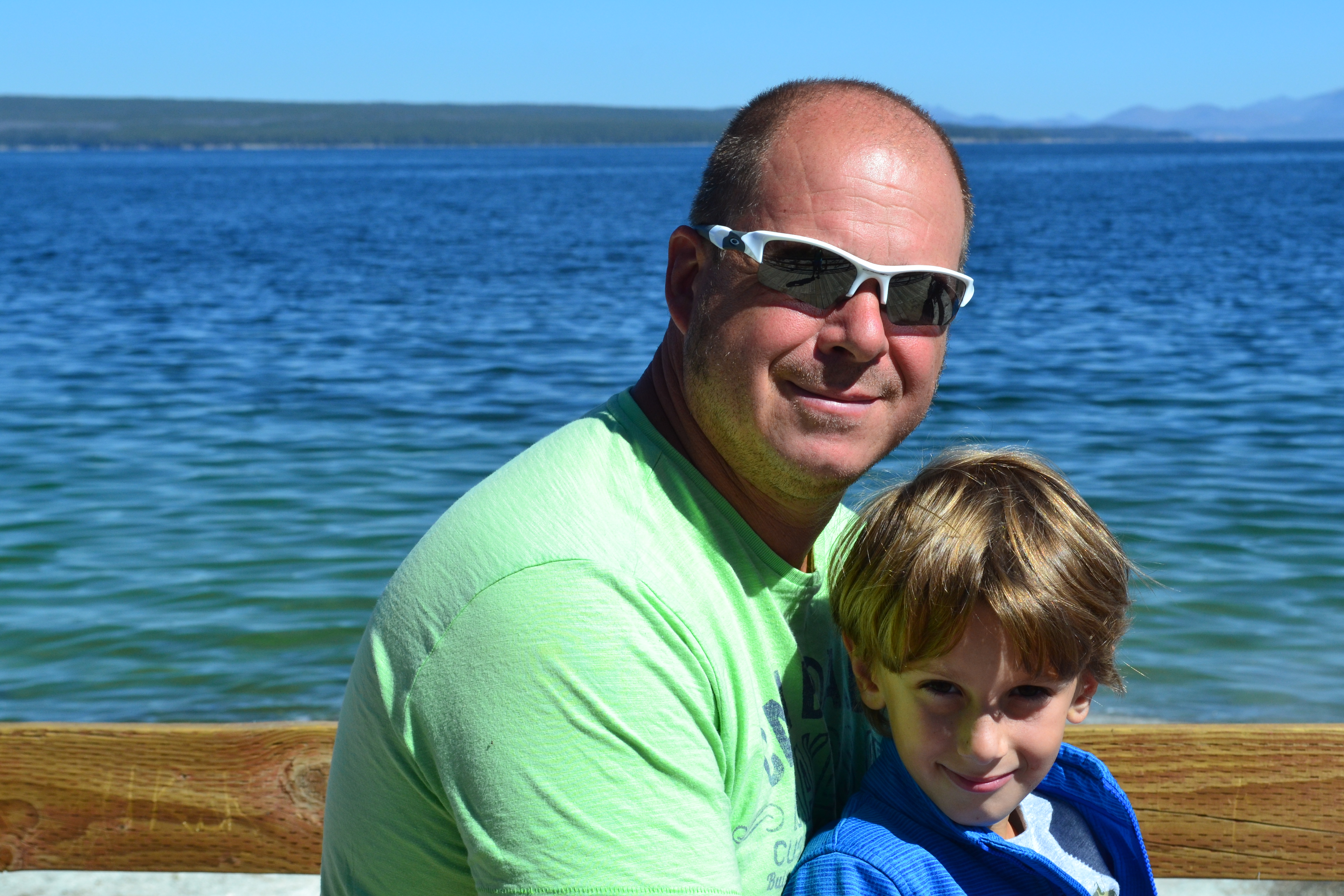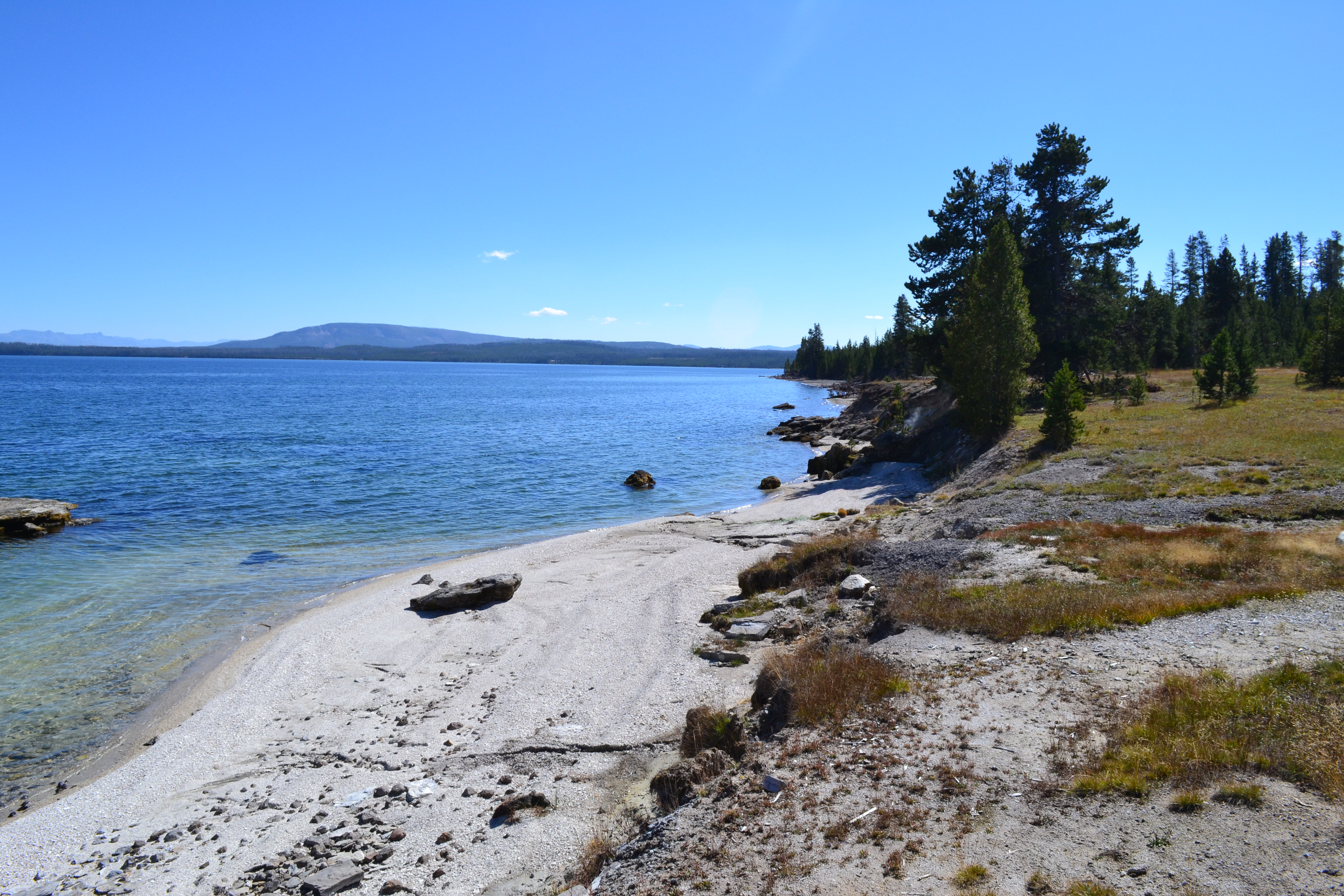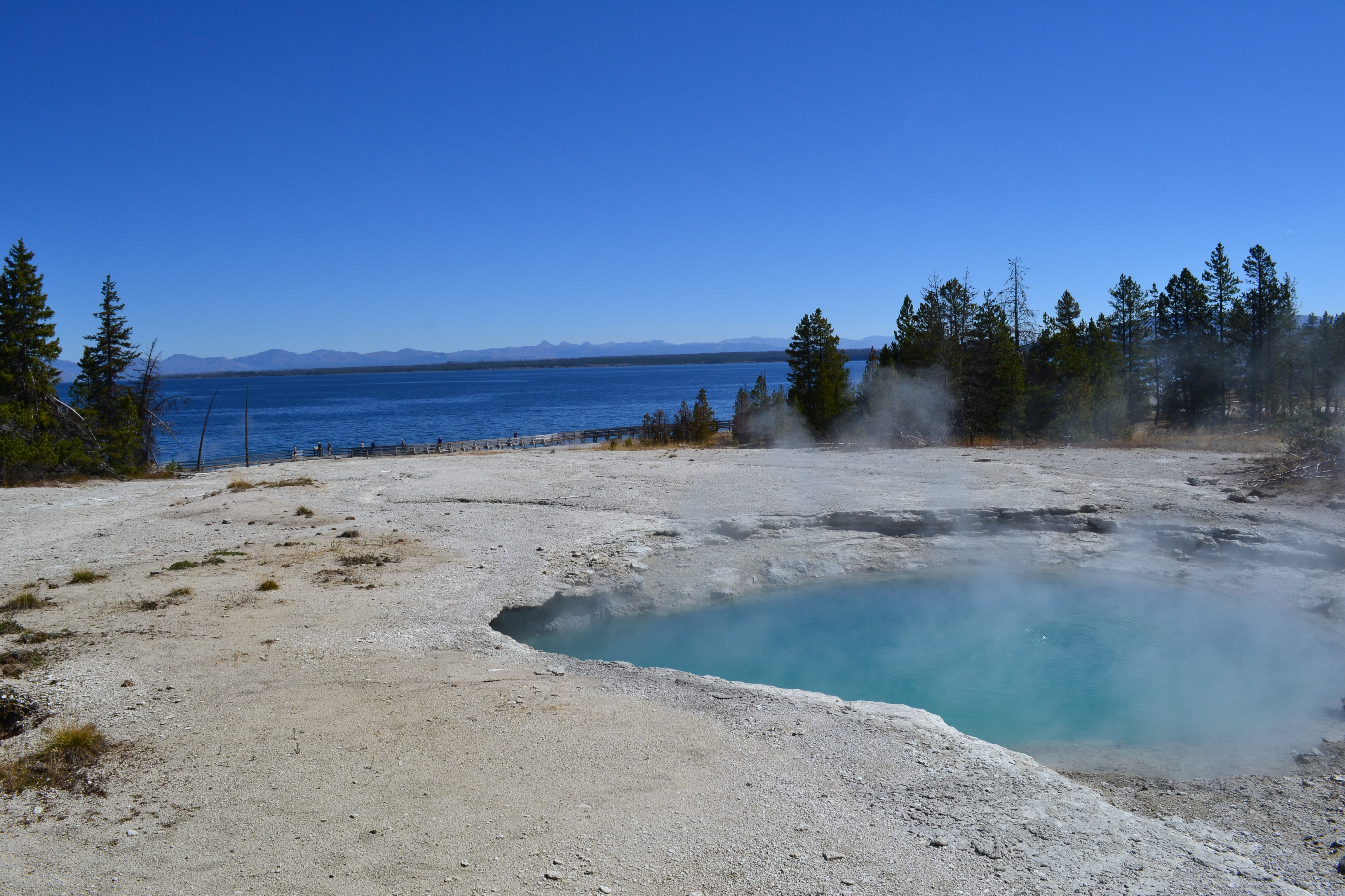 Day 2 we spent down at the West Thumb Geyser Basin. The pools were getting more and more colourful and beautiful. Seems like we chose the right order to visit the various different areas of the park as each place seemed even more beautiful than the last. These geysers and pools are all set on the side of Yellowstone Lake. Our favourite was the ‘fishing pot’ on the side of the lake. When they first brought tourists to the park nearly 100 years ago people could stand on the side of the geyser with a fishing rod, catch a fish in the lake and with the fish still on the hook drop it into the pot to cook. Classic.