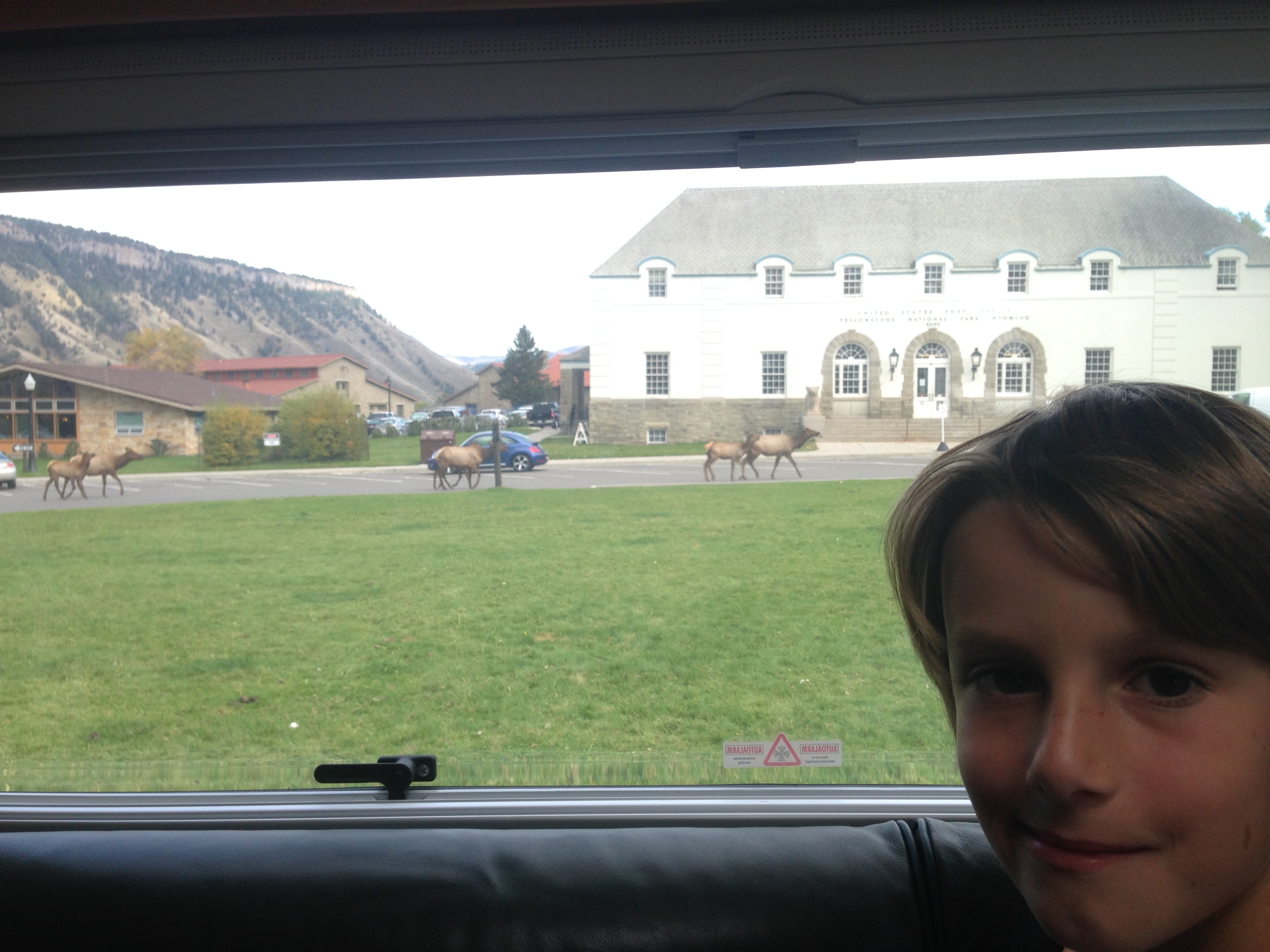 On our last day it was elk who were wandering around without any interest in the recommended wildlife spotting distance guidelines. Up at Mammoth Hot Springs (our last stop in the park) they were everywhere. Mammoth was another totally contrasting area. Bright white calcium deposits that have created ledges and pools that look like the design of a rather posh spa or the set of Frozen as Charlie observed!!