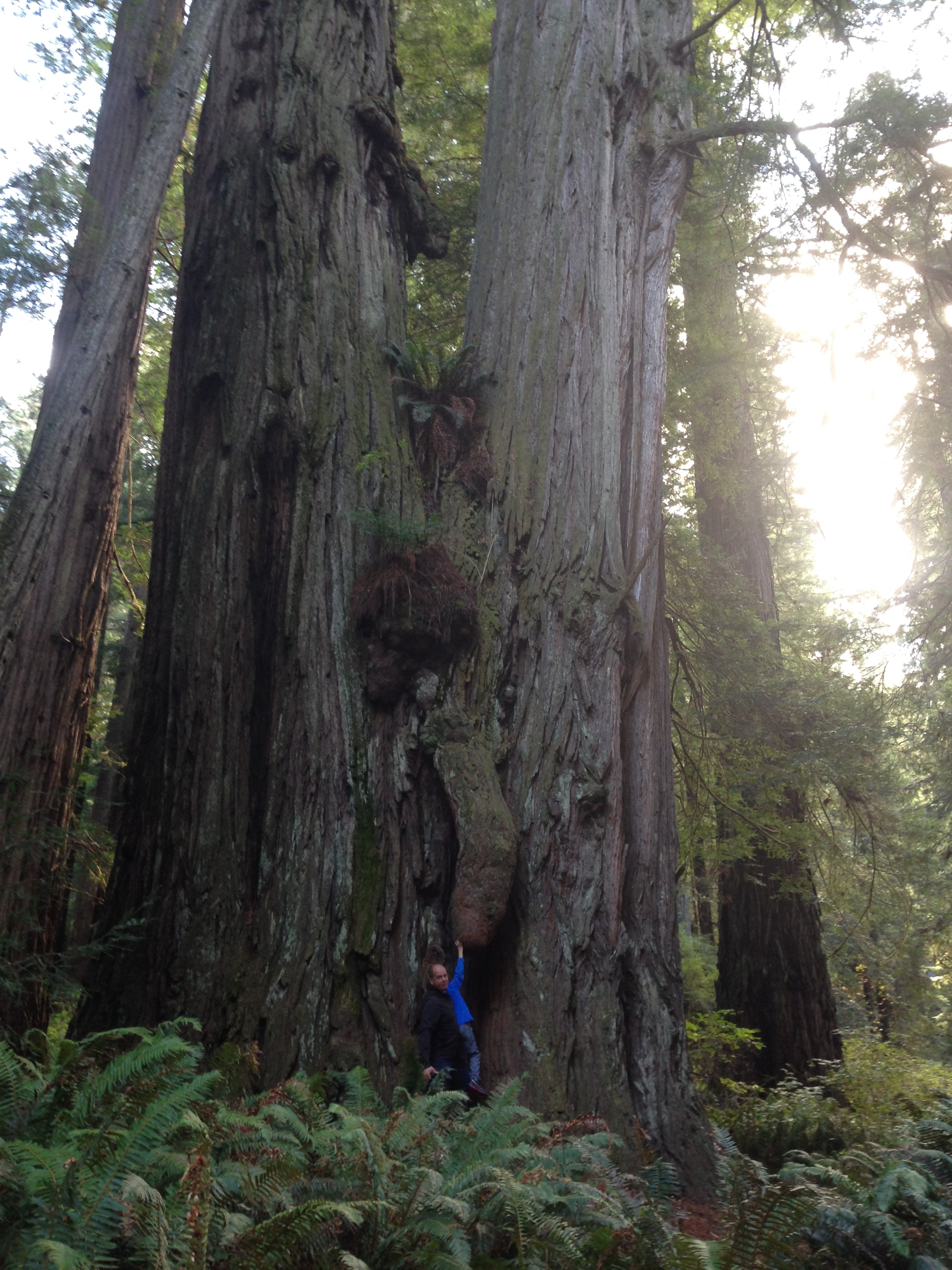 The redwoods are miraculous really. They grow from a tiny cone no bigger than an olive!! On the side of each tree they grow a burb so that if anything happens to the tree they are able to clone themselves and so a new tree grows!! Their roots are only 12’ deep which is incredible considering the enormous height they grow to. They help each other to grow by interlocking their roots underground and their branches above ground, hugging each other to make them stronger. Isn’t that lovely!! But most exciting of all the trees were used as filming location of Return of the Jedi when they flew on those strange cycle things…and Jurassic park was filmed in   parts here.