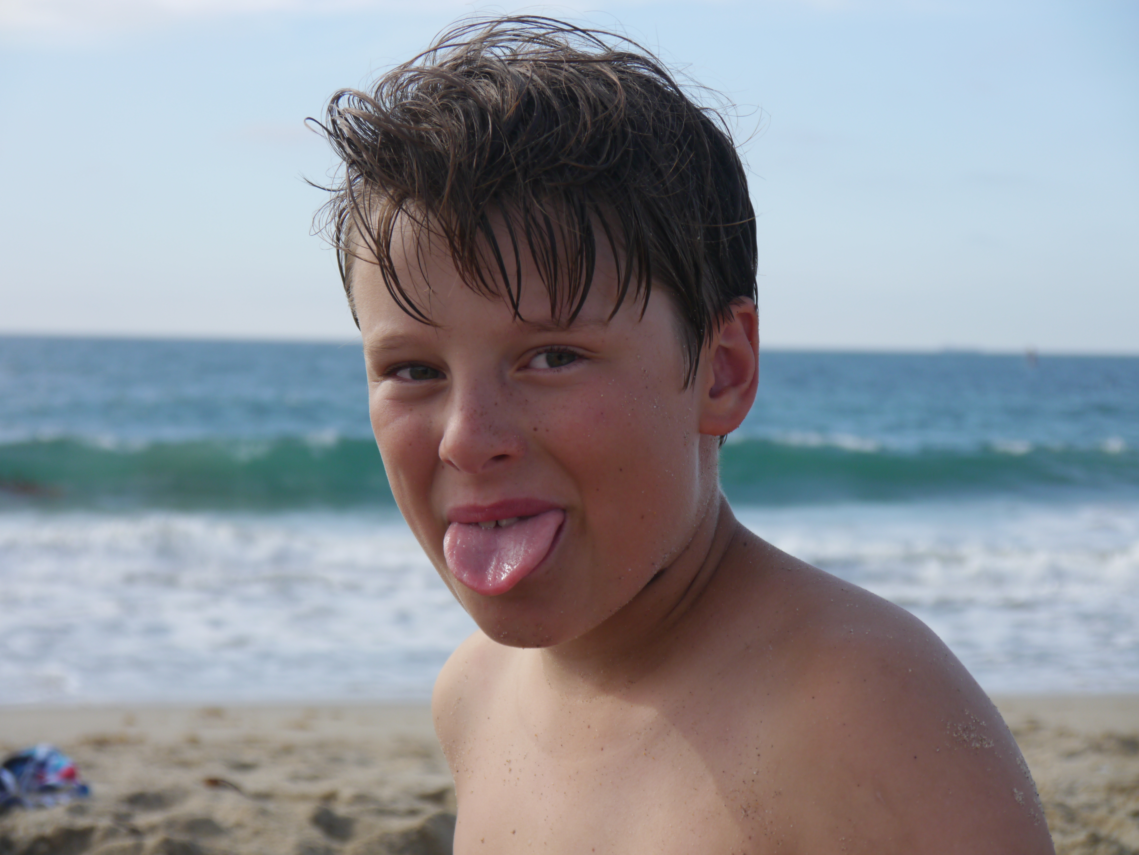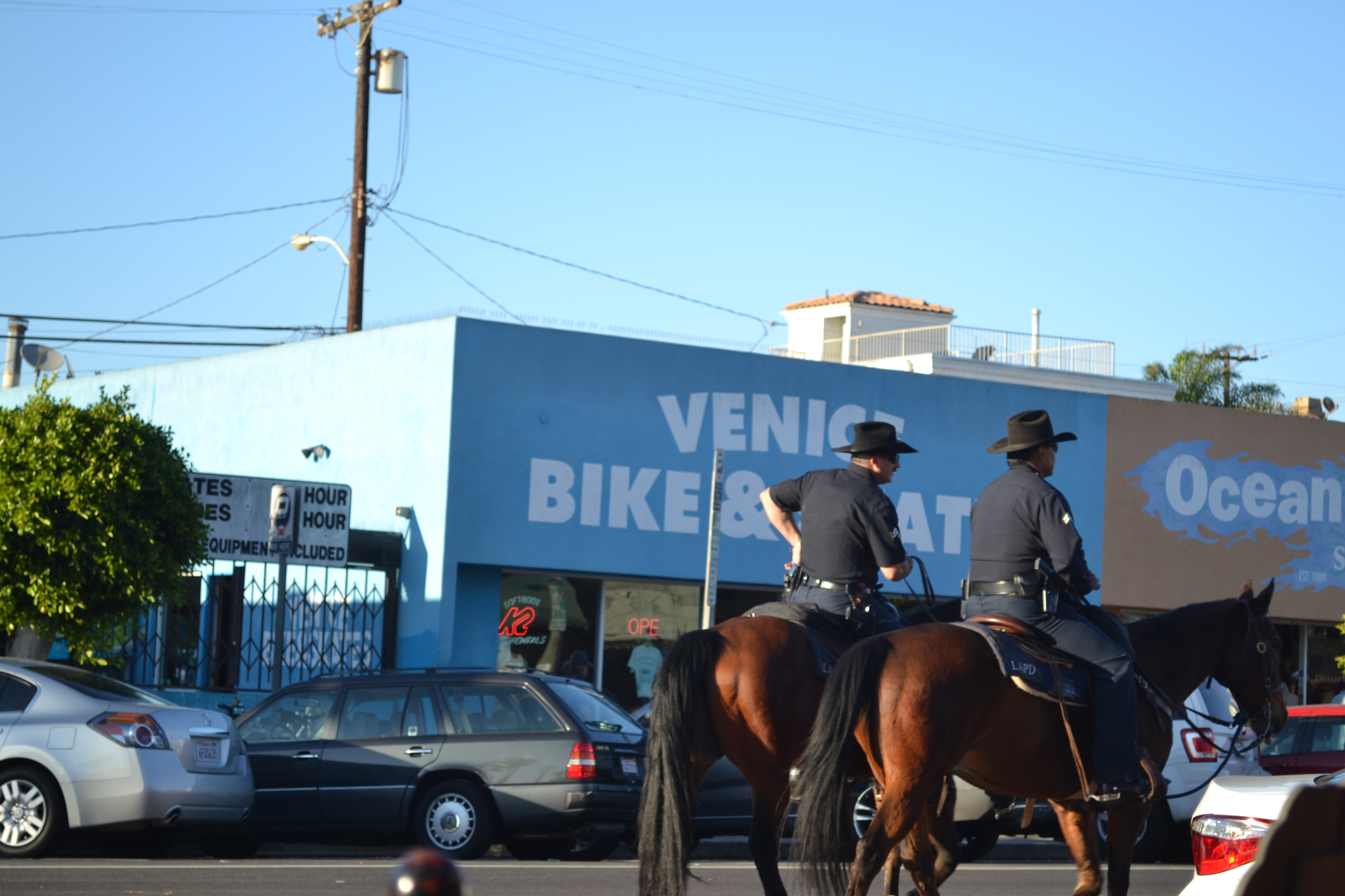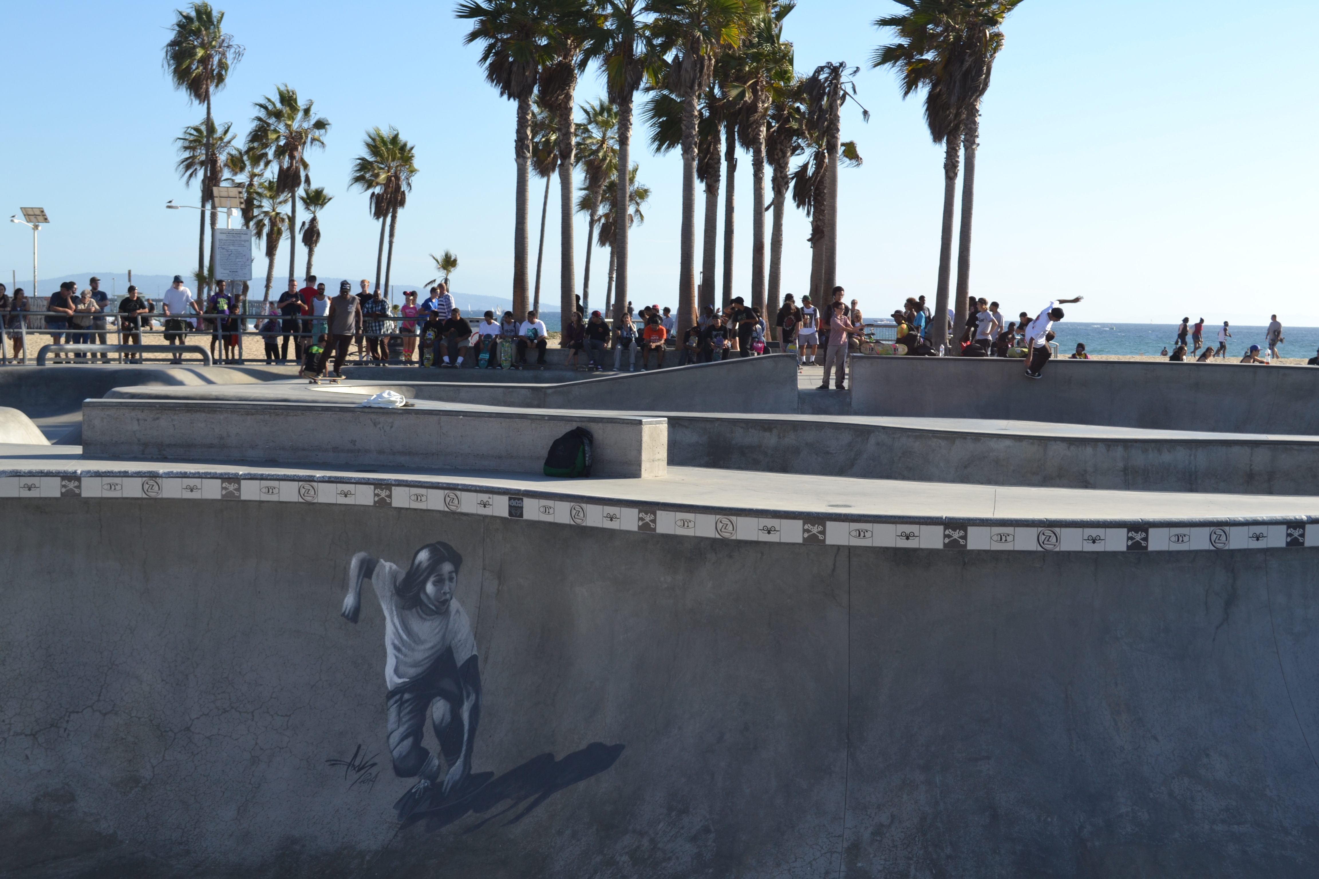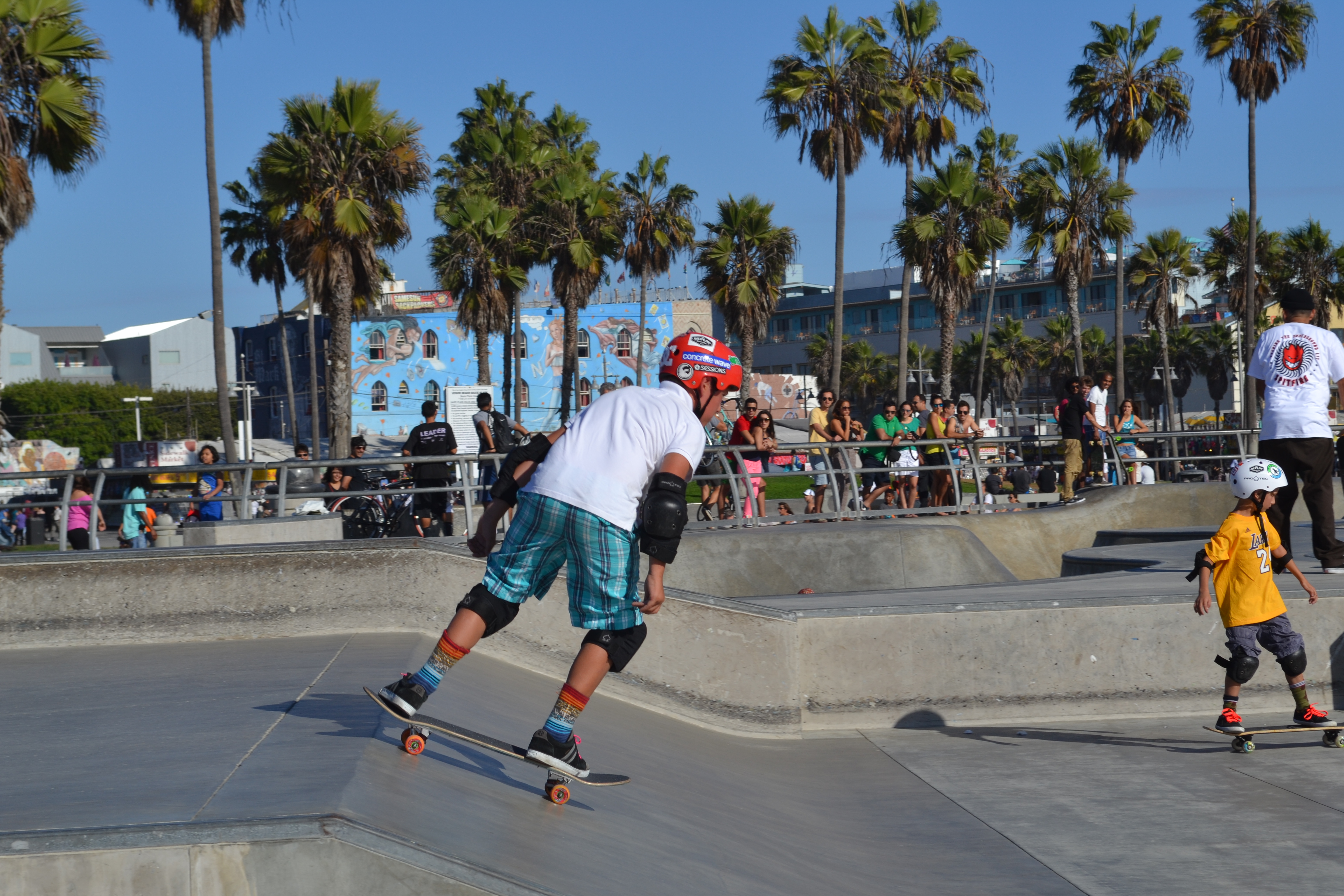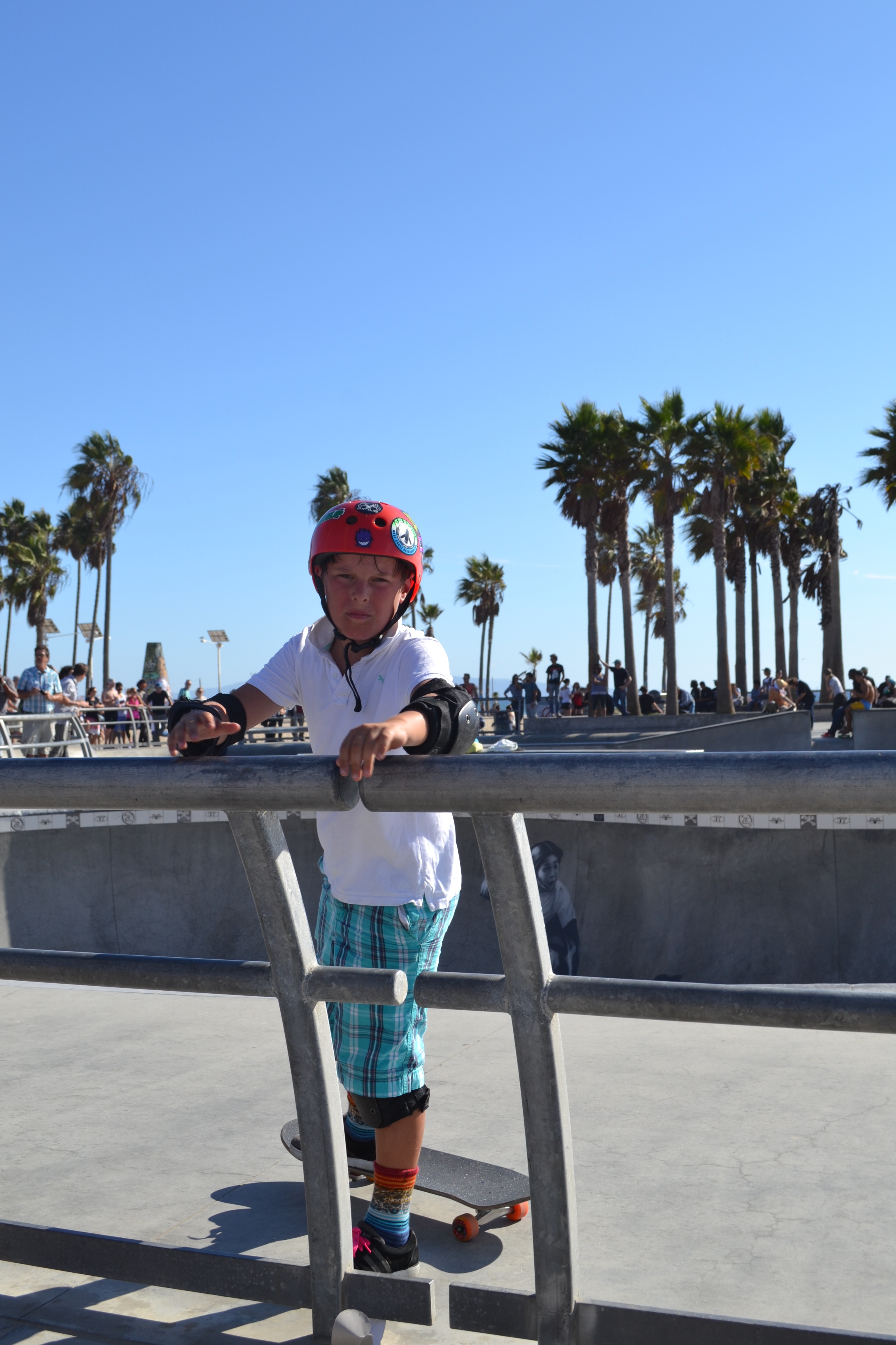Saturday a little the worse for wear we got back on our bikes again and headed north this time to Venice Beach. Skateboards strapped onto our backs we delivered the kids to the Skateboard haven they were looking for. This place is absolutely as crazy as it is billed. The kids didn’t bat an eyelid but mine were out on storks at some of the sights and I don’t shock easily as I’m sure most of you know…. We spent most of our time at the skate park on the beachfront. We arrived there and it was completely full of what must have been professional boarders. And a huge crowd of people just hanging off the railings observing. I was intimidated but not the kids. The ‘star’ of the park appeared to be a young man who due to his deep tan and very defined six pack and the fact that he boarded in bare feet led us to believe he probably could handle a surf board fairly well too. Despite this the kids dutifully strapped on their knee and elbow pads and fastened their crash helmets and got right in there. I truly do not know where they are getting their confidence. If that had been me I would have crawled away with my tail between my legs. But no. There went our brave boys and we could not have been more proud of their few hours pushing themselves round the park while avoiding the pros who flew through the air around them.