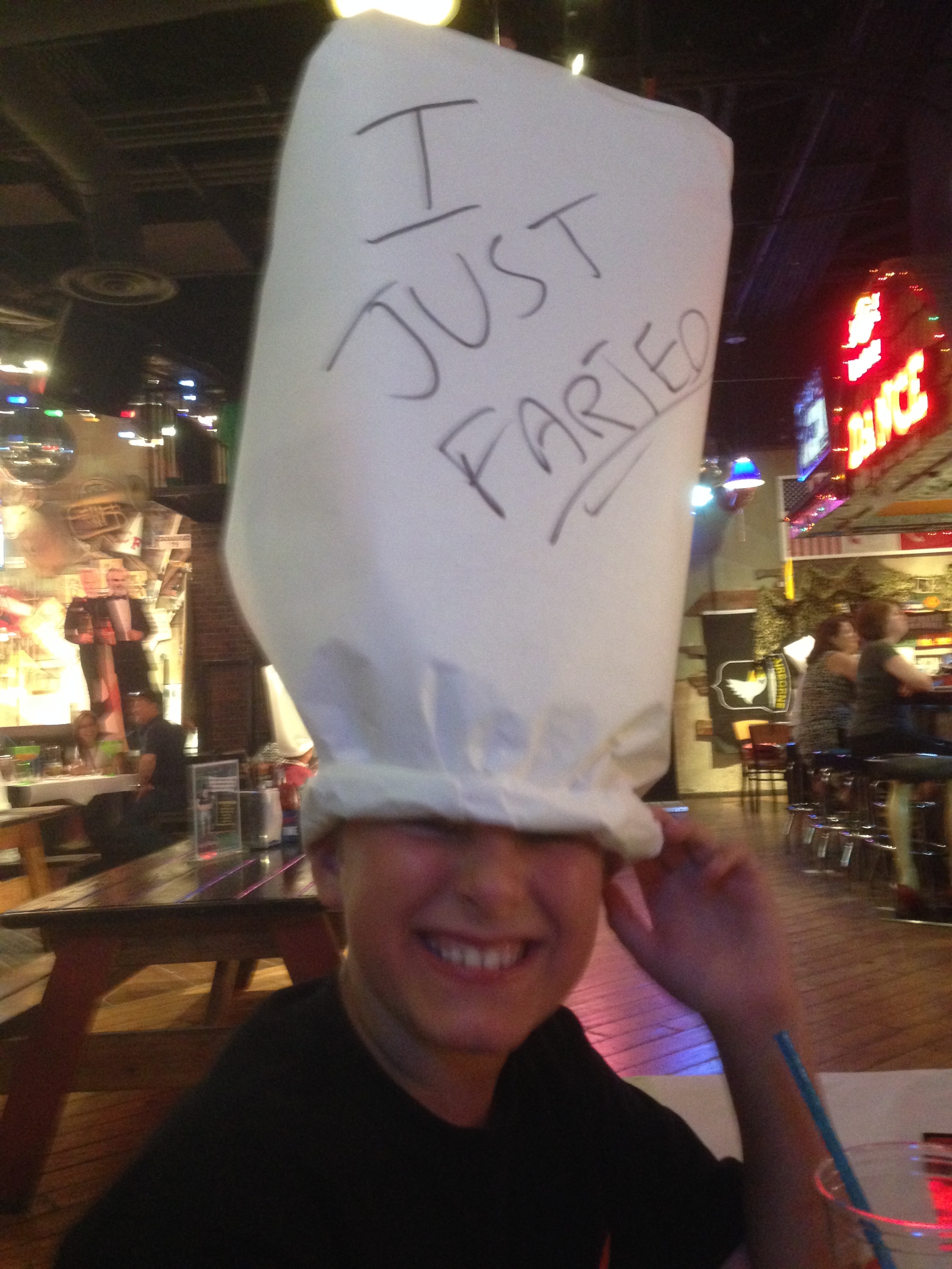 The kids absolutely loved being insulted and roared with laughter the whole time we were there. A group of girls on the table next to us got some really very rude messages on their hats and the waiter stole her camera and took photos of half the restaurant including this shot we recreated again because William thought it was so funny. The waiter took our orders starting with William and saying “You first Princess” which he loved. I don’t know what it says about our kids that they enjoyed being insulted and ridiculed so much. Maybe it’s a good thing they can laugh at themselves or maybe they get too much sarcasm at home!!