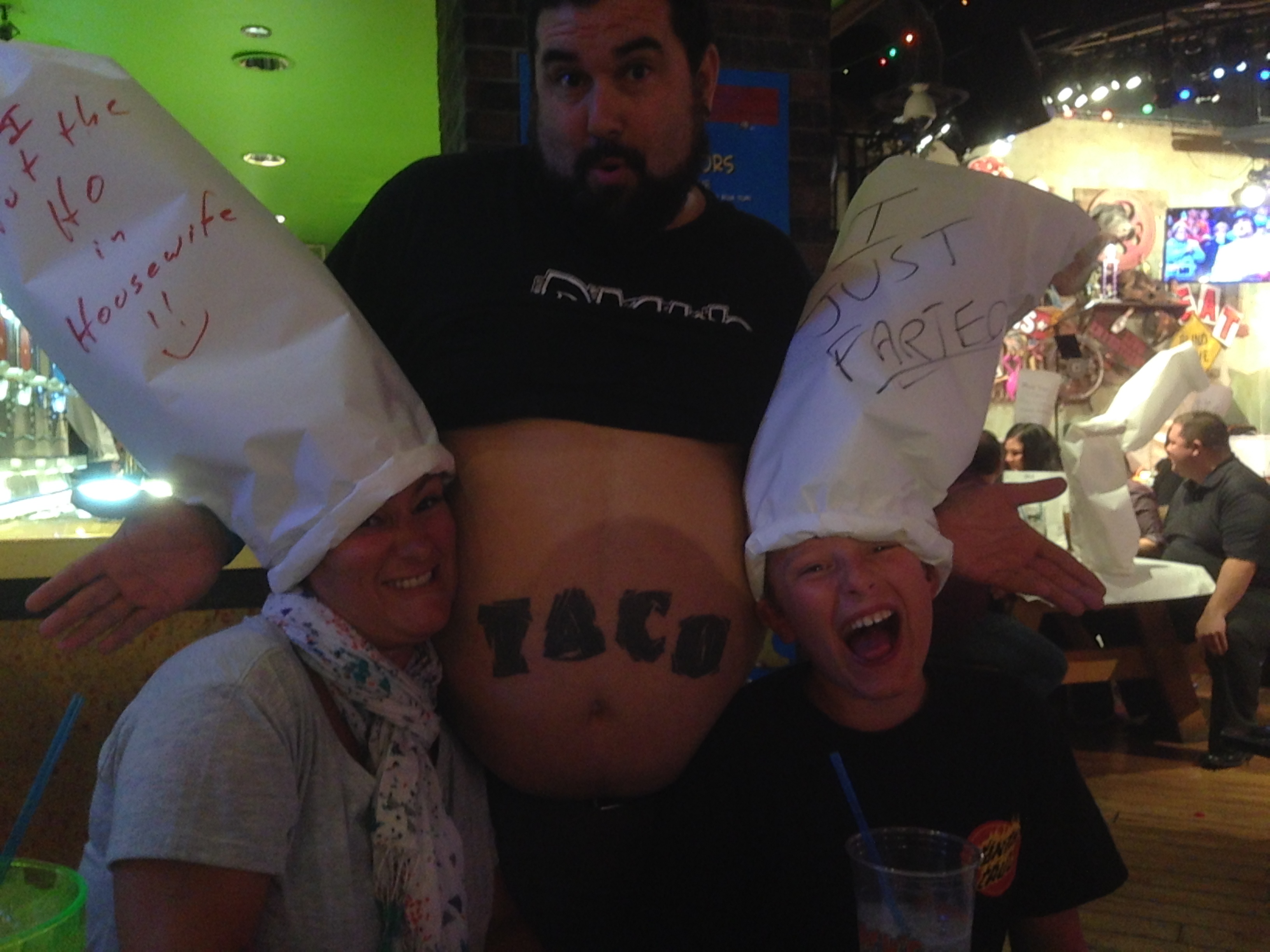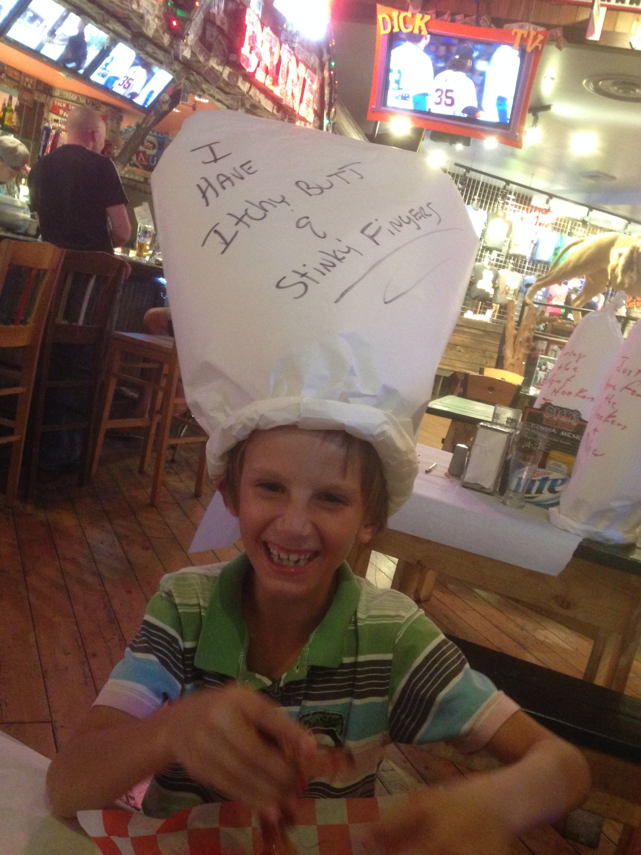 One meal out we had was in a restaurant in Excalibur hotel called Dicks Last Resort. As we walked past it seemed like everyone was having a good time, singing along to Sweet Caroline and wearing funny paper hats with writing on them. The lady at the front desk did warn us that the waiting staff are liable to ‘cuss’ you but we thought the kids could cope with that.