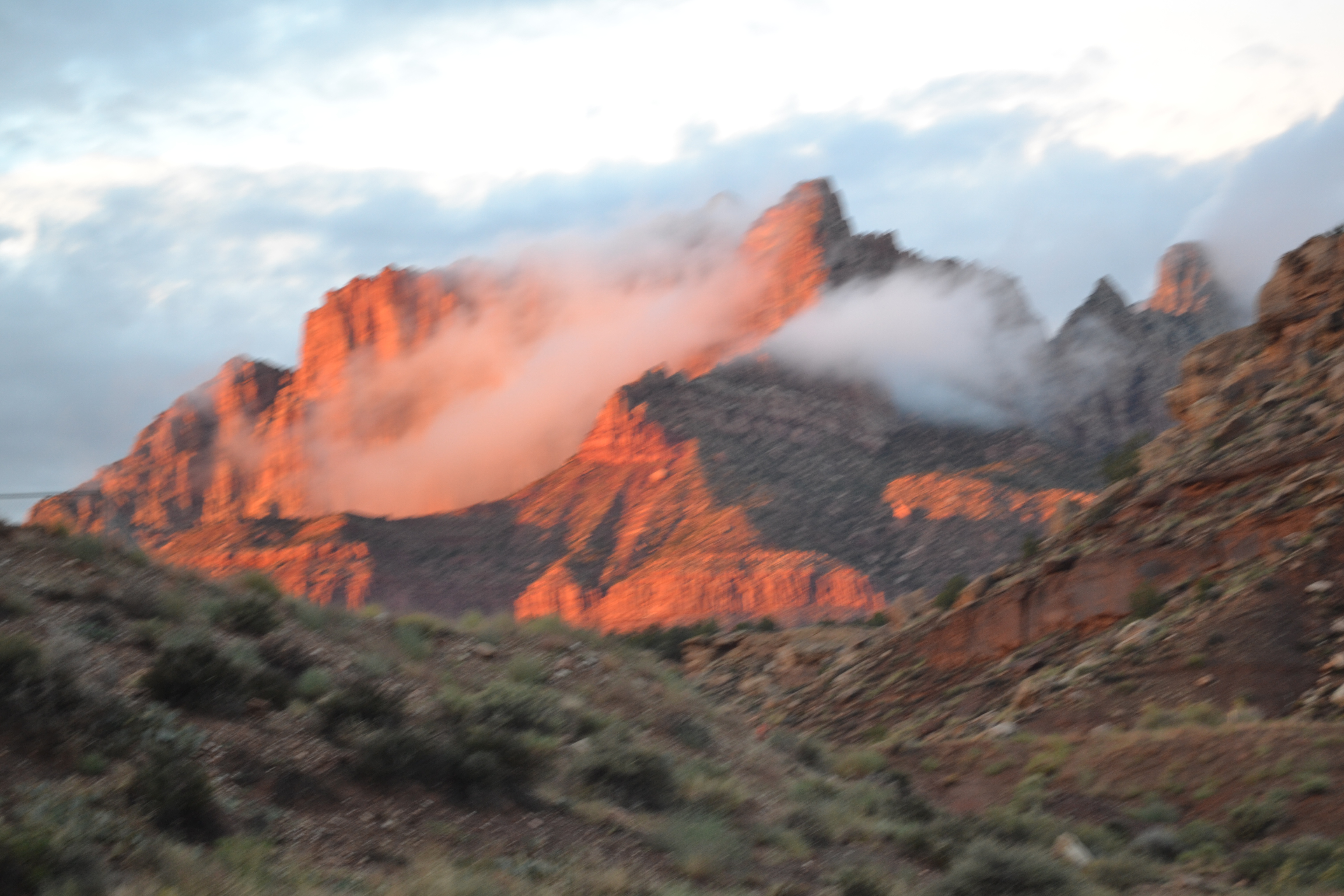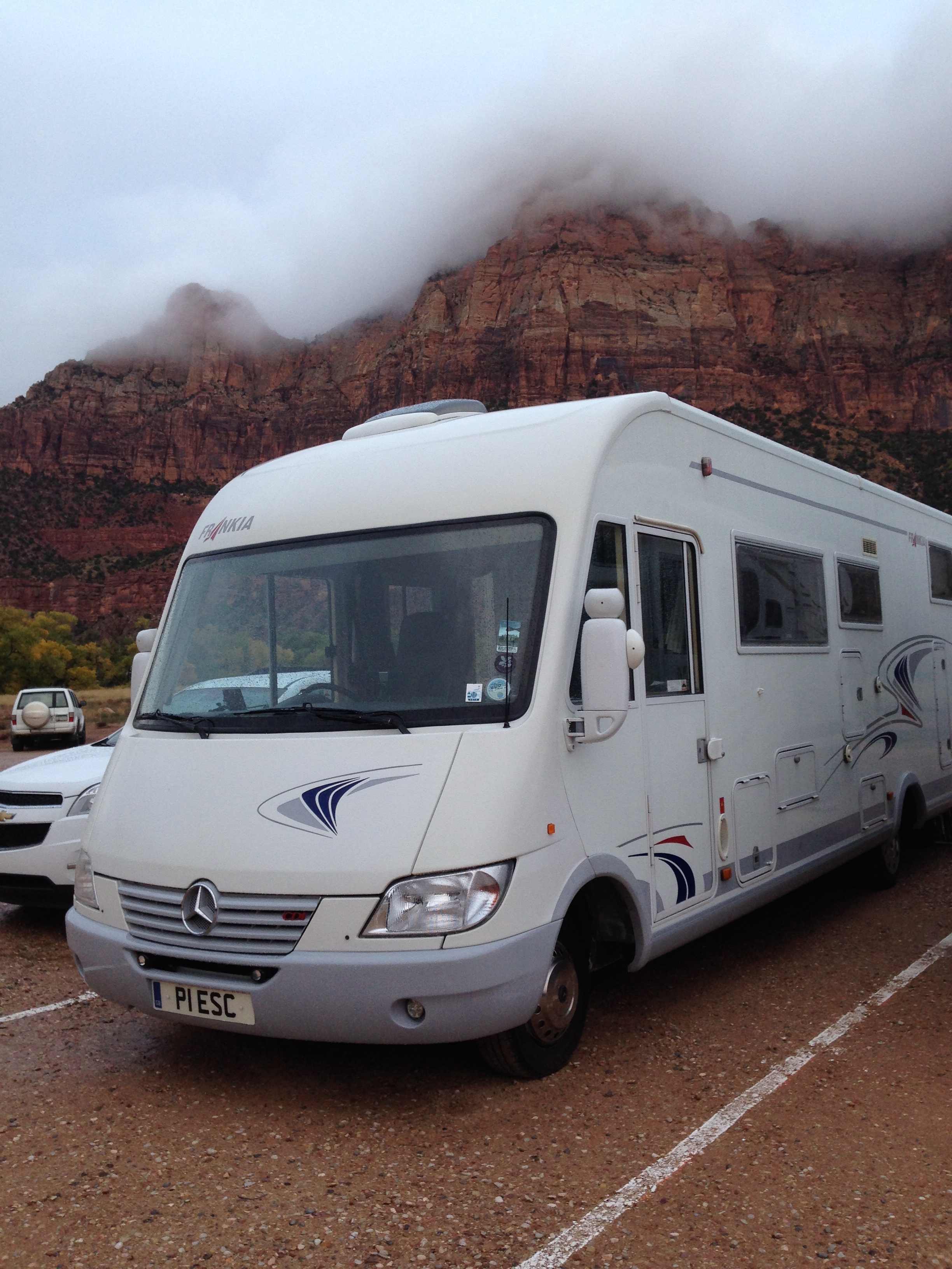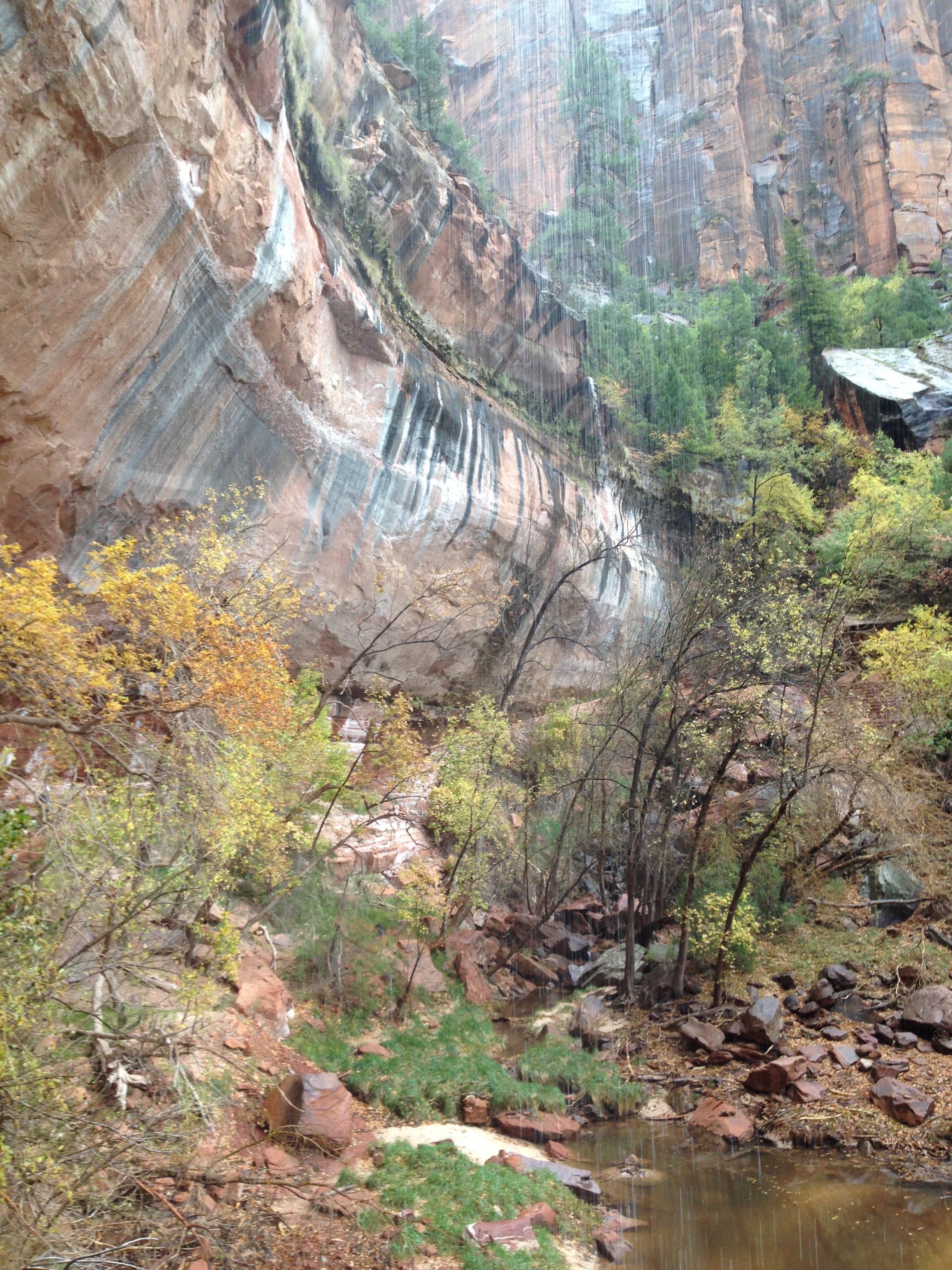 We left the sunshine of Vegas on the morning of Saturday 1st November headed towards the first of the National Parks we had on our itinerary for the next few weeks – Zion. When we woke on Sunday morning in Zion it was pouring with rain. Hard to believe we were lounging round the pool 2 days ago and now were layering up with jeans, waterproofs etc.