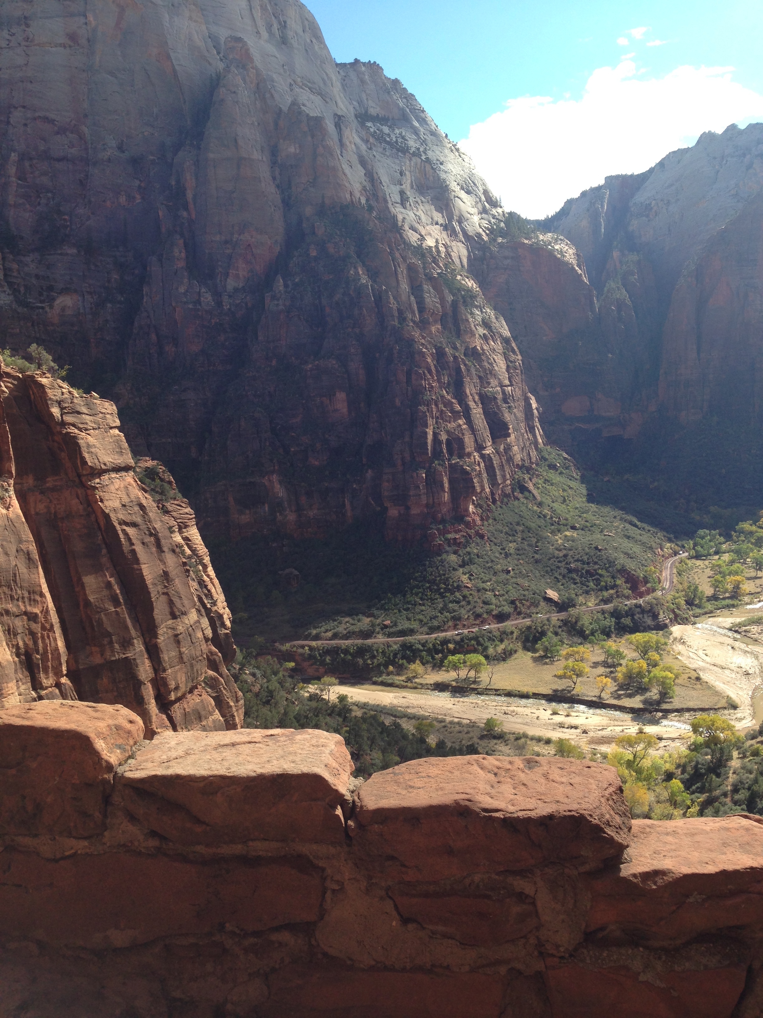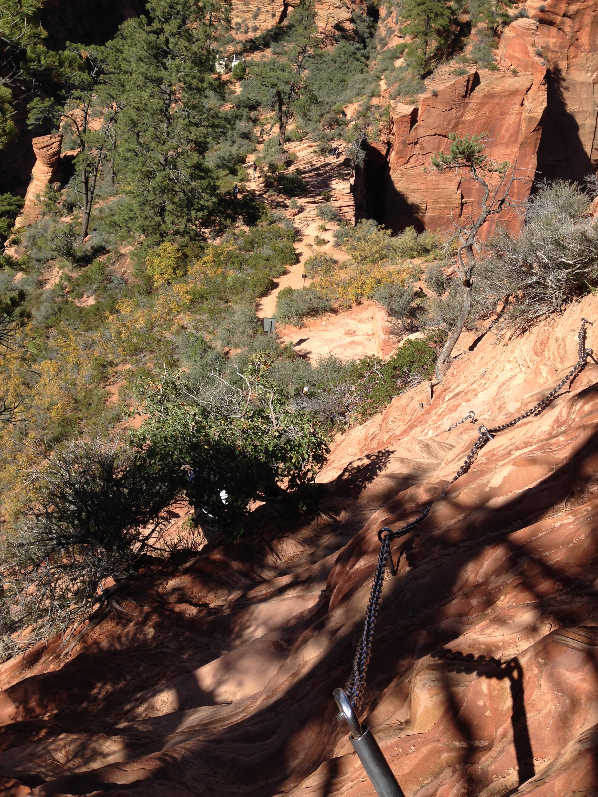 So the hike is only a 6 mile round trip. But it crosses the river, hugs a towering cliff on a series of incredibly steep switch backs all dangerously close to the edge, then squeezes through a narrow canyon before taking you up Walters Wiggles then finally traverses a razor thin ridge where steel chains are the only safety net. It climbs 1400’ in all.