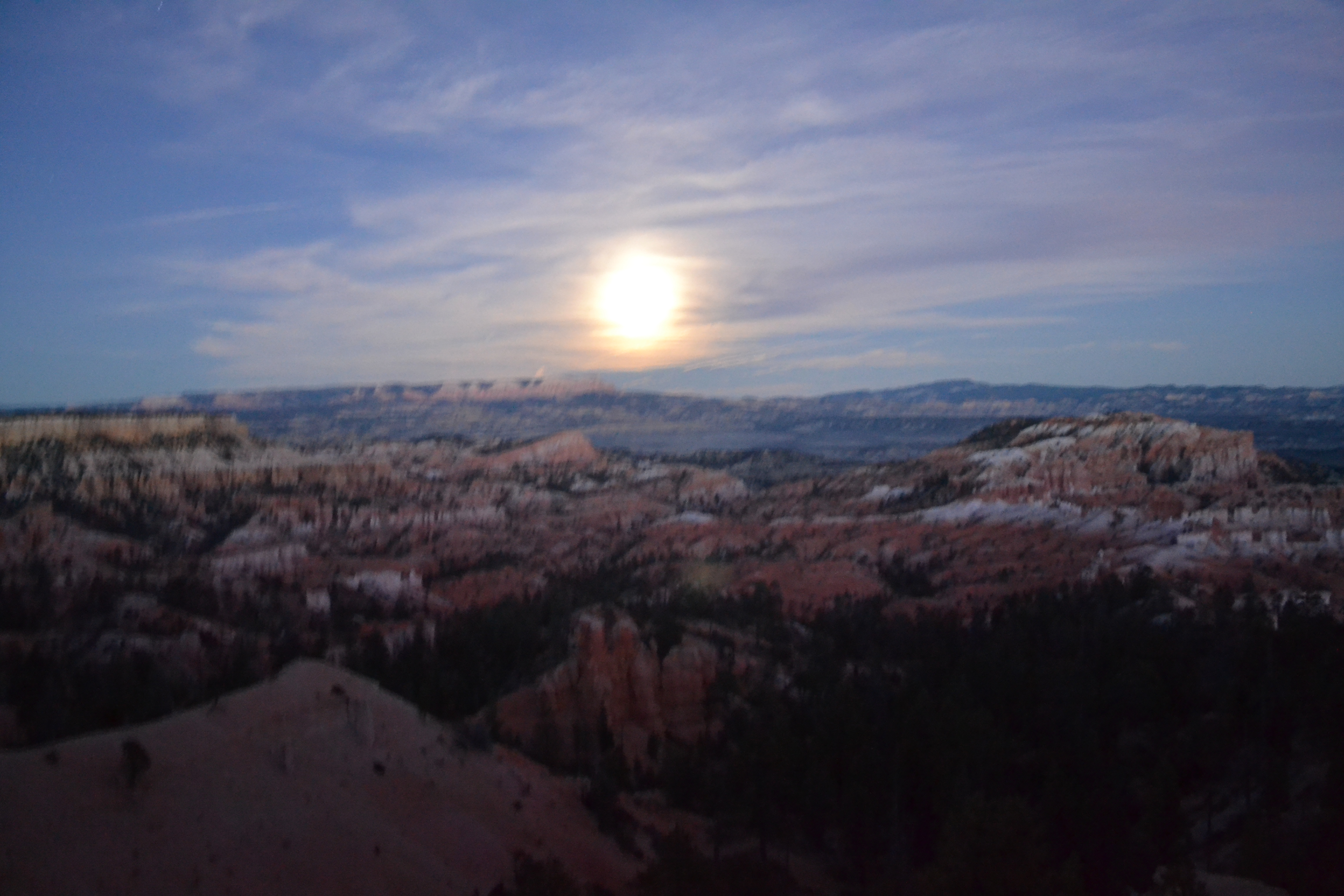 That evening we went on the Moonlit Hoodoo Walk. The poster said no torches or headlamps allowed. We couldn’t believe that it would be possible to descend into the canyon without any source of light. We were of course forgetting the moon!! Wow.. Please don’t judge us on not actually considering that incredible source of light. So it was we descended 500’ or so down narrow paths on cliff edges with only the huge glare of the moon to go by!!