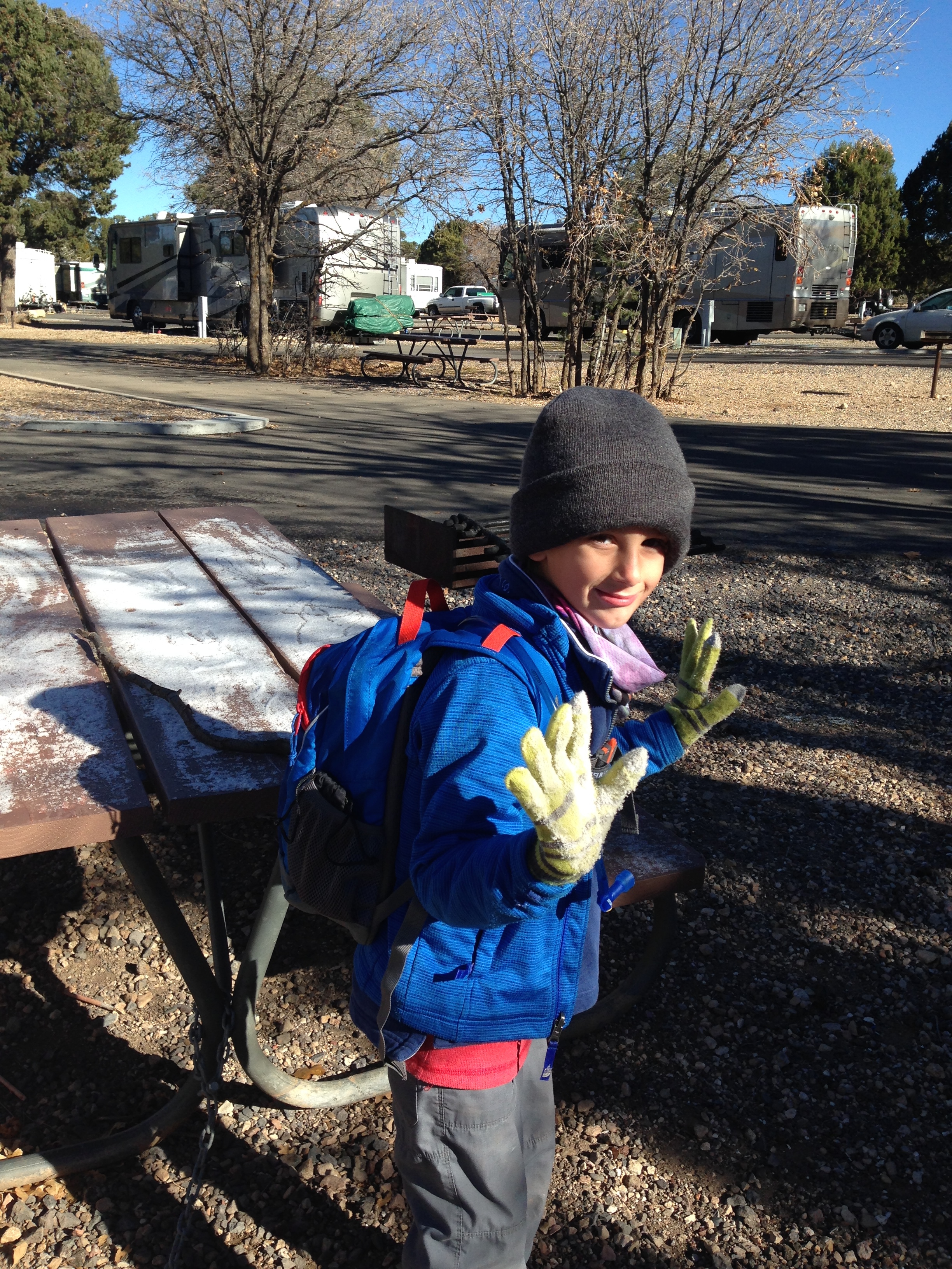 The temperature was truly unbelievable given how warm it had been in Moab not all that far from here just 5 days ago, let alone how balmy Tubac was. So when we woke to snow we were very glad we’d purchased those woolly hats a few weeks back!! So we got our hats, scarves and gloves on as well as at least 4 layers and headed off for our first sight of the Grand Canyon.