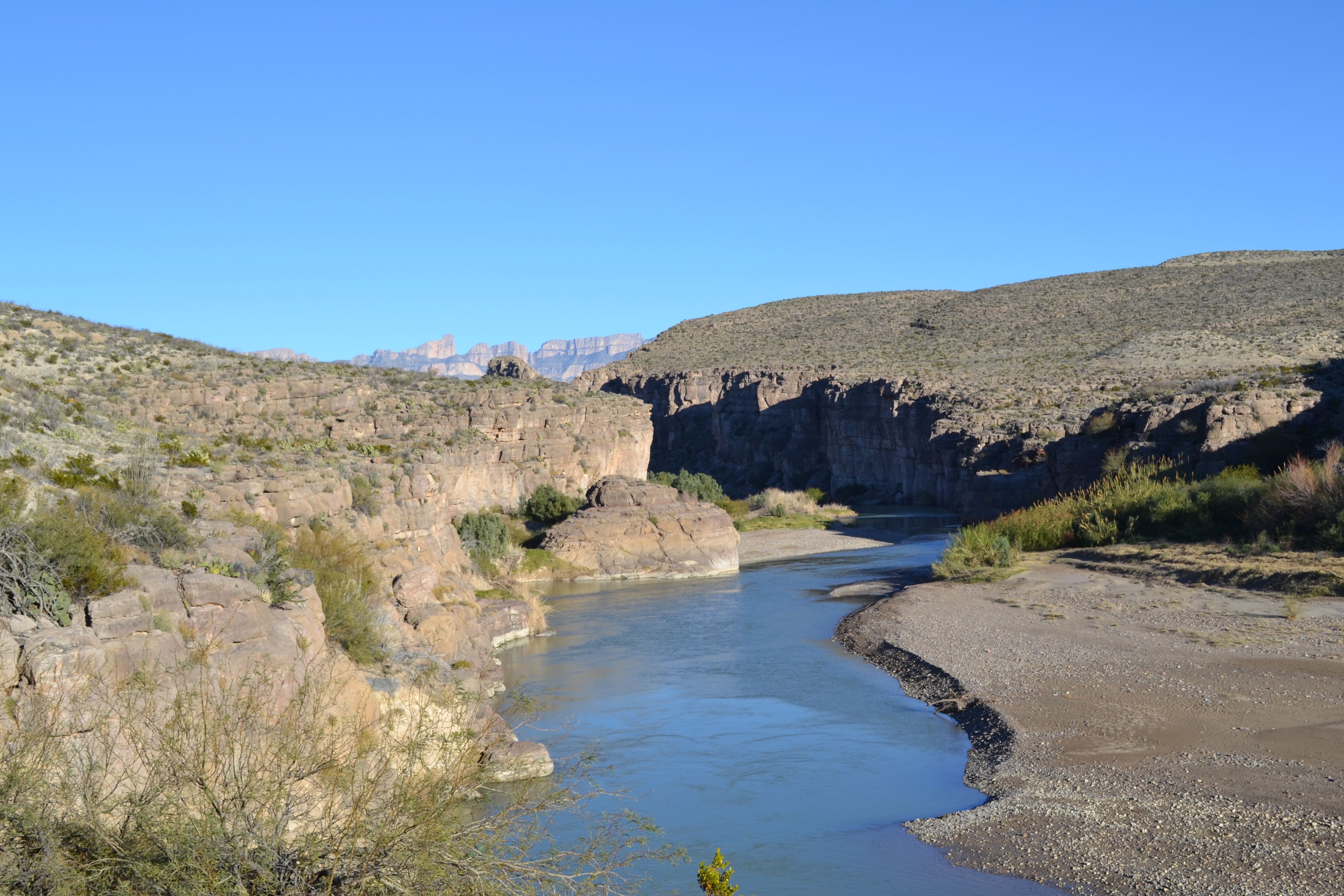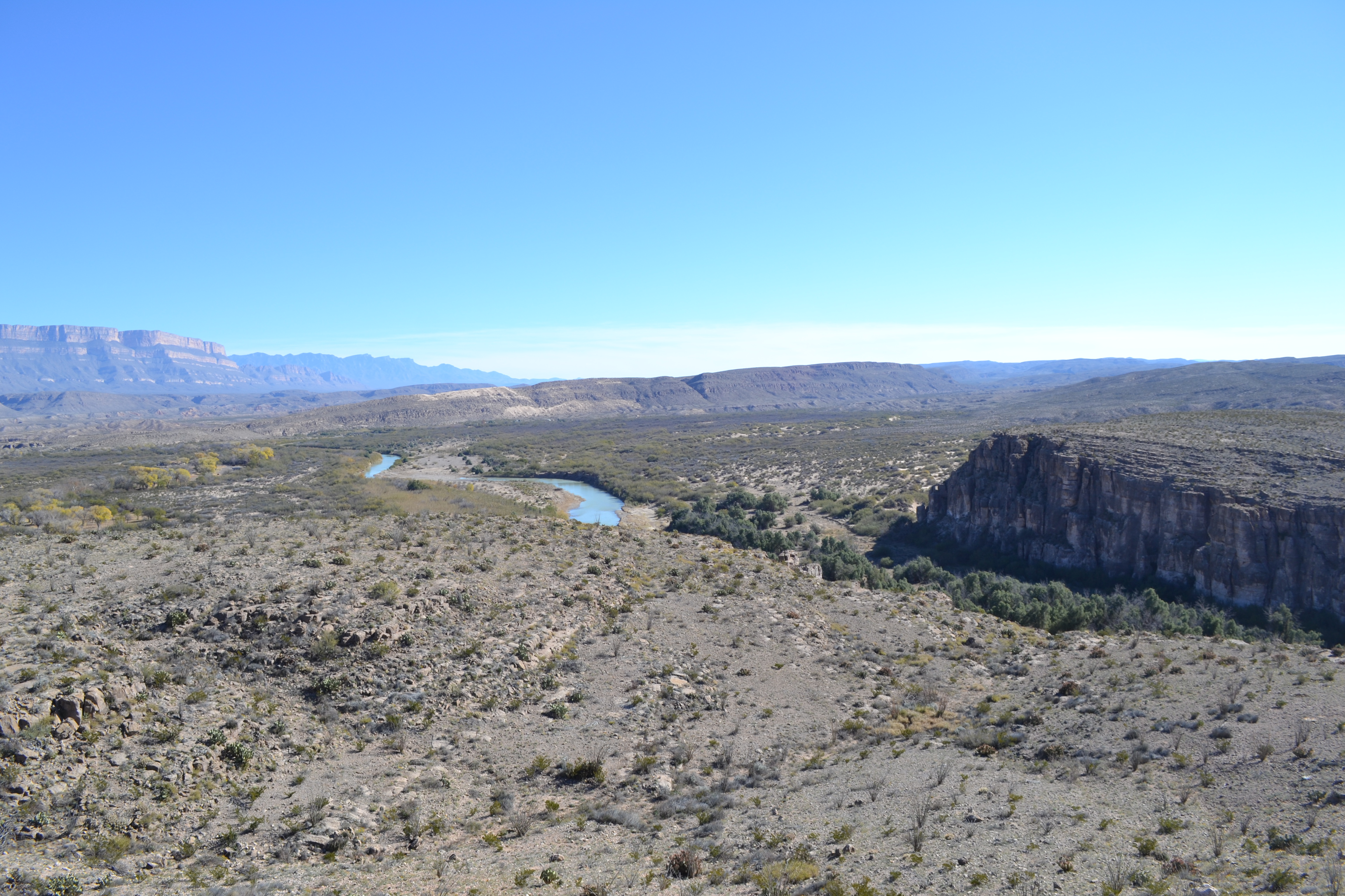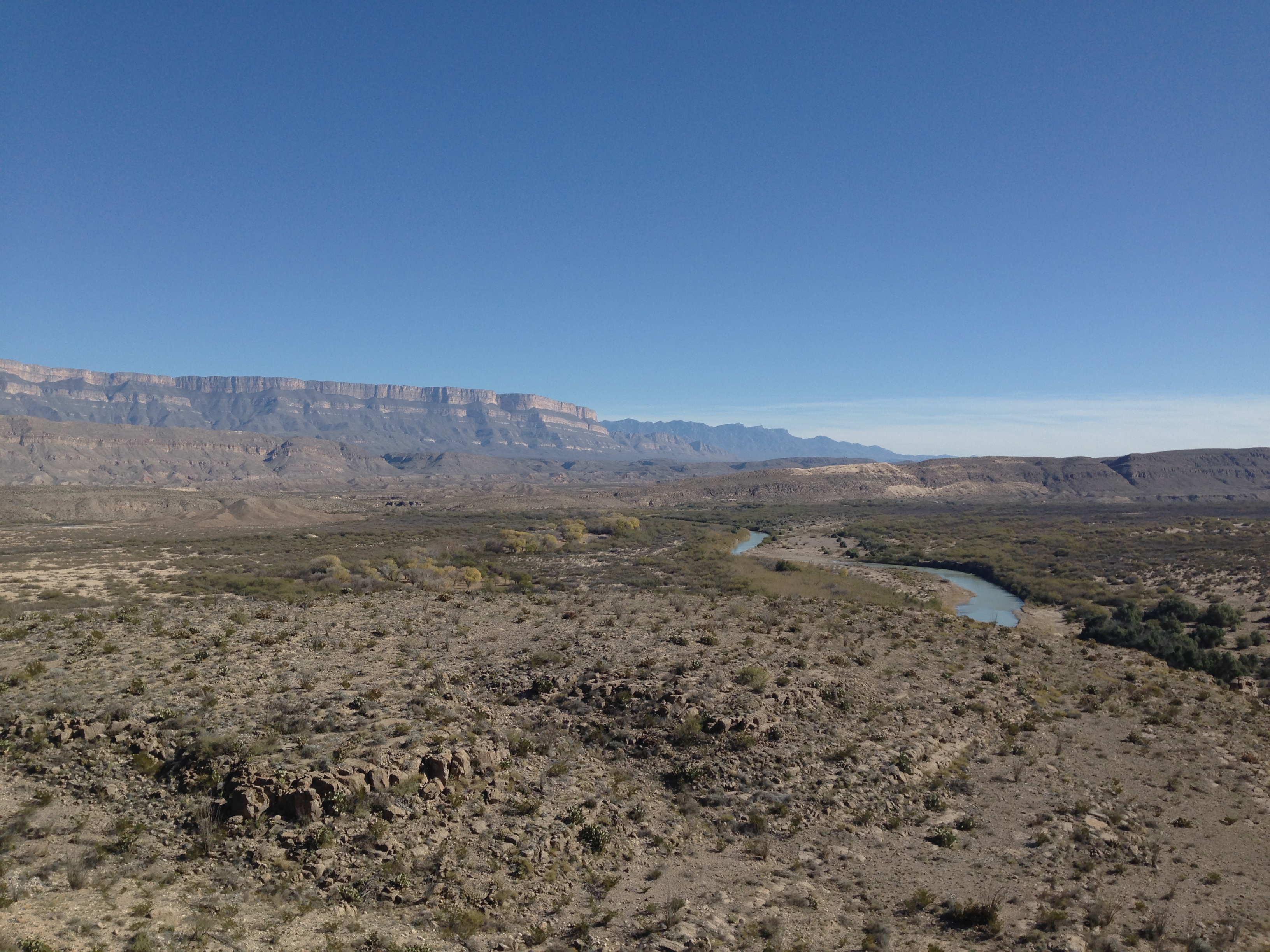 As the forecast had predicted we then had several days of clear blue skies and sunshine. We dug out our shorts again and dusted off the sun loungers and had a lovely few days. Big Bend National Park is situated on the boundary with Mexico along the Rio Grande. The park covers 801,000 acres of very different environments from desert to mountains at a place where the Rio Grande makes a sharp turn – The ‘Big Bend’ – and is the largest protected area of the Chihuahuan Desert. One of the reasons for the huge diversity is the contrast in the elevation within the park – from only 1800’ along the river to nearly 8000’ in the Chisos Mountains.