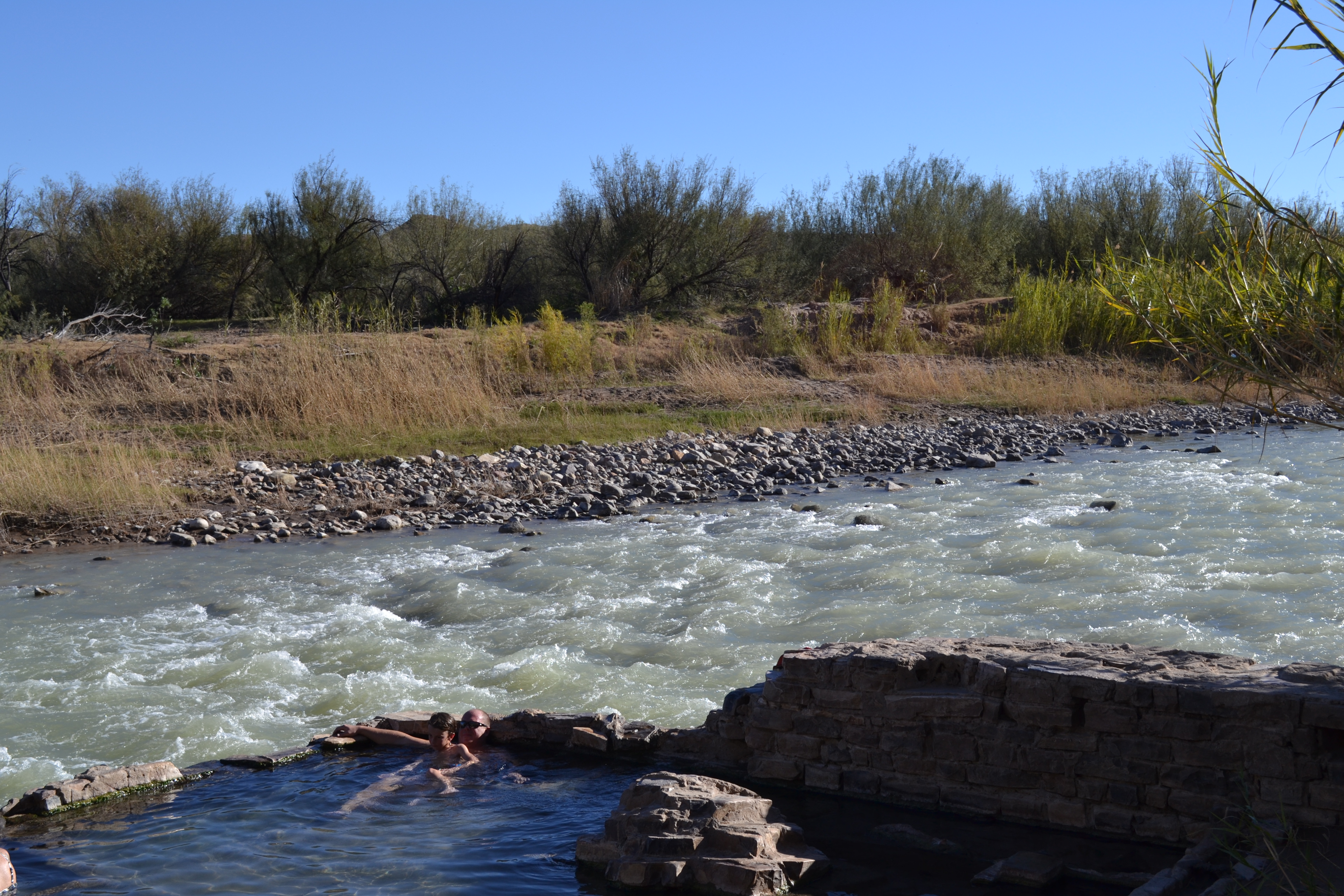 Sunday we woke up to clear blue skies once again!! So warm that I could sit outside and drink my coffee and read my book. End of having to shout “Shut the door!” to anyone going in or out of the van! No jackets required. Woop de woo! We couldn’t believe just 2 days before we were in freezing rain and minus temperatures!! We headed out in shorts and t shirts – very exciting! – on the Hot springs Trail. A really lovely hike that took in the canyon, rocky outcrops, cottonwood forests and finally led down to the river and the hot springs. This natural spring fills up a small bricked in ‘pool’ on the edge of the river. At 105 degrees it was lovely to have a ‘bath’.
