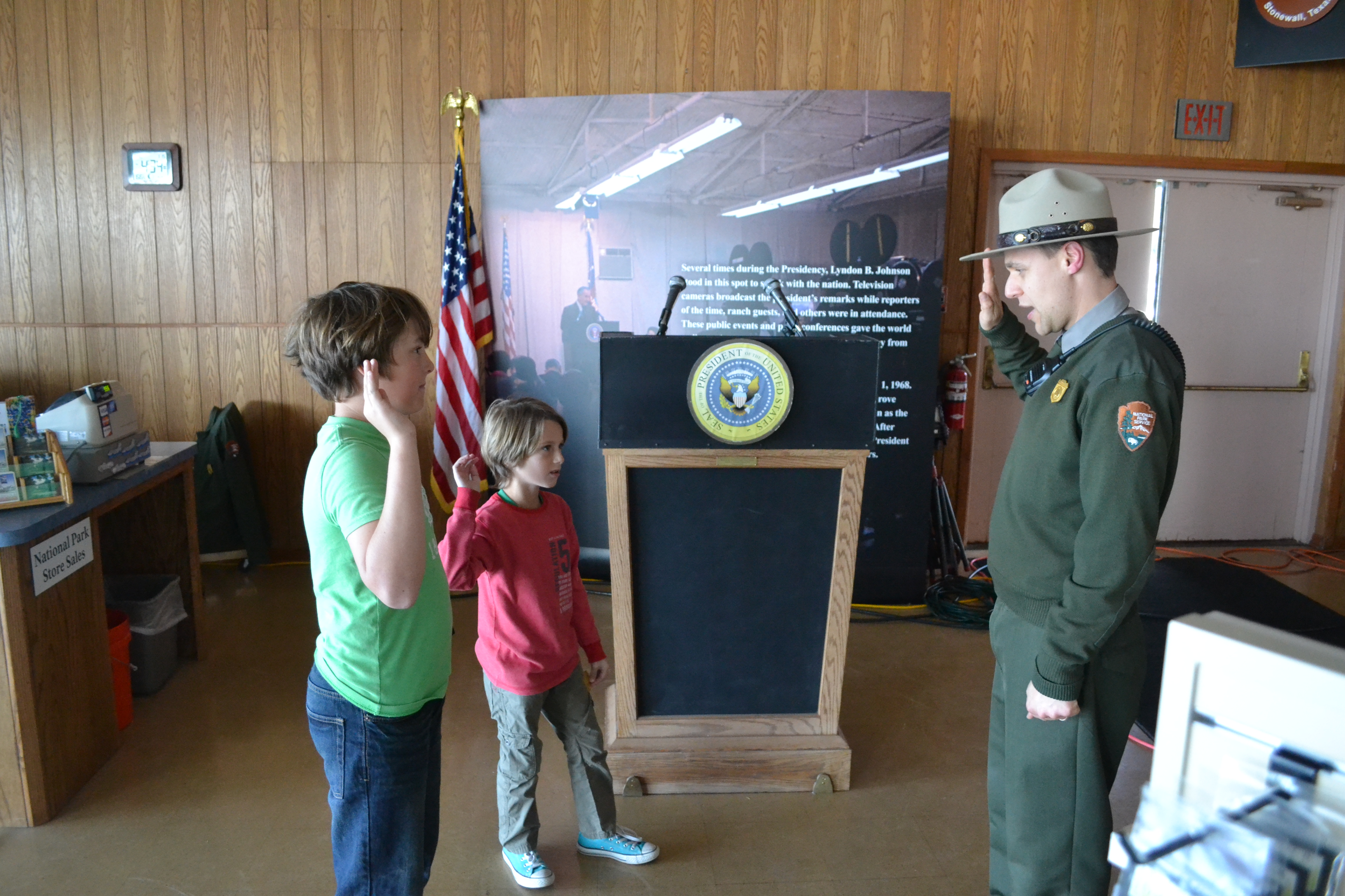 We left on Sunday 11th to head into Hill Country. But first made a stop at the San Jose Mission. It is one of a chain of Missions established along San Antonio River in the 1700’s (one being The Alamo). A reminder of one of Spain’s most successful attempts to extend its’ dominion from New Spain (Mexico). We thought we should at least see one of them. It was established in 1720. We saw the National Parks Service very poignant film about the natives that were driven into the missionaries by disease and Apache attack. At one time 350 people lived in the mission here. It struck me that having lived free on and from the land for the natives it must have been a not too pleasant experience to be ruled by the tyrany of the mission bell. Calling them to prayer three times per day then punctuating each part of their day. Farming agriculture instead of the hunter-gatherer life they’d been living. It indeed must have felt like a prison. Apparently 70% of them were dead within 10 years, which is sad as well as not very surprising. Run by the National Parks Service the kids qualified for yet another Ranger Badge. Even that didn’t improve the day for Will. I read over his shoulder while he was writing up the visit in his journal “Today we visited a really boring Mission”. Good to know the kids are really benefitting from the trip!