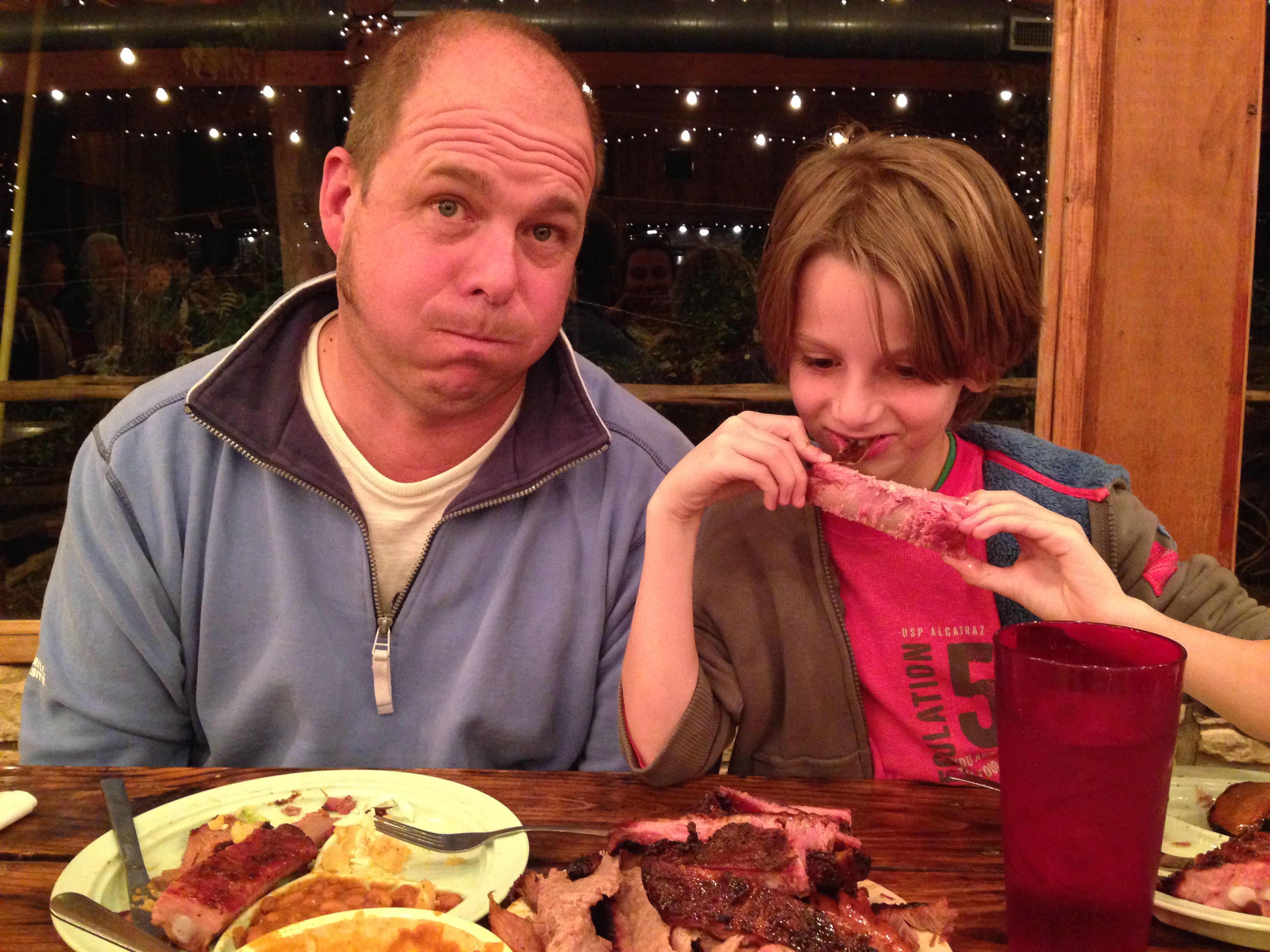 That night we ate at the World Famous (not completely sure about ‘World’ famous, maybe ‘Nation’ famous) Salt Lick BBQ restaurant at Driftwood. The history of it is that fed up with having to travel for work Thurman Roberts wrote down 54 things that the family might be able to do to allow them to stary in Driftwood full time. The idea for Salt Lick was number 14. So he and his 2 sons built a huge barbeque pit and each week on a Thursday night they would start slow cooking the meat and he would stay there, sleeping on a camping bed, until it had sold out. It got so he was getting away earlier and earlier so they built a small porch around the pit and the restaurant grew from there. That was in 1967 and the original pit is still there but they now serve literally thousands of people each week. We opted for a family platter that they kept refilling until we admitted defeat. Charlie was the last to stop chewing his way trhough the ribs and brisket beef on aobut plate 5. Even then they filled up a ‘To Go’ box for us which we used to stock our freezer. Delicious!