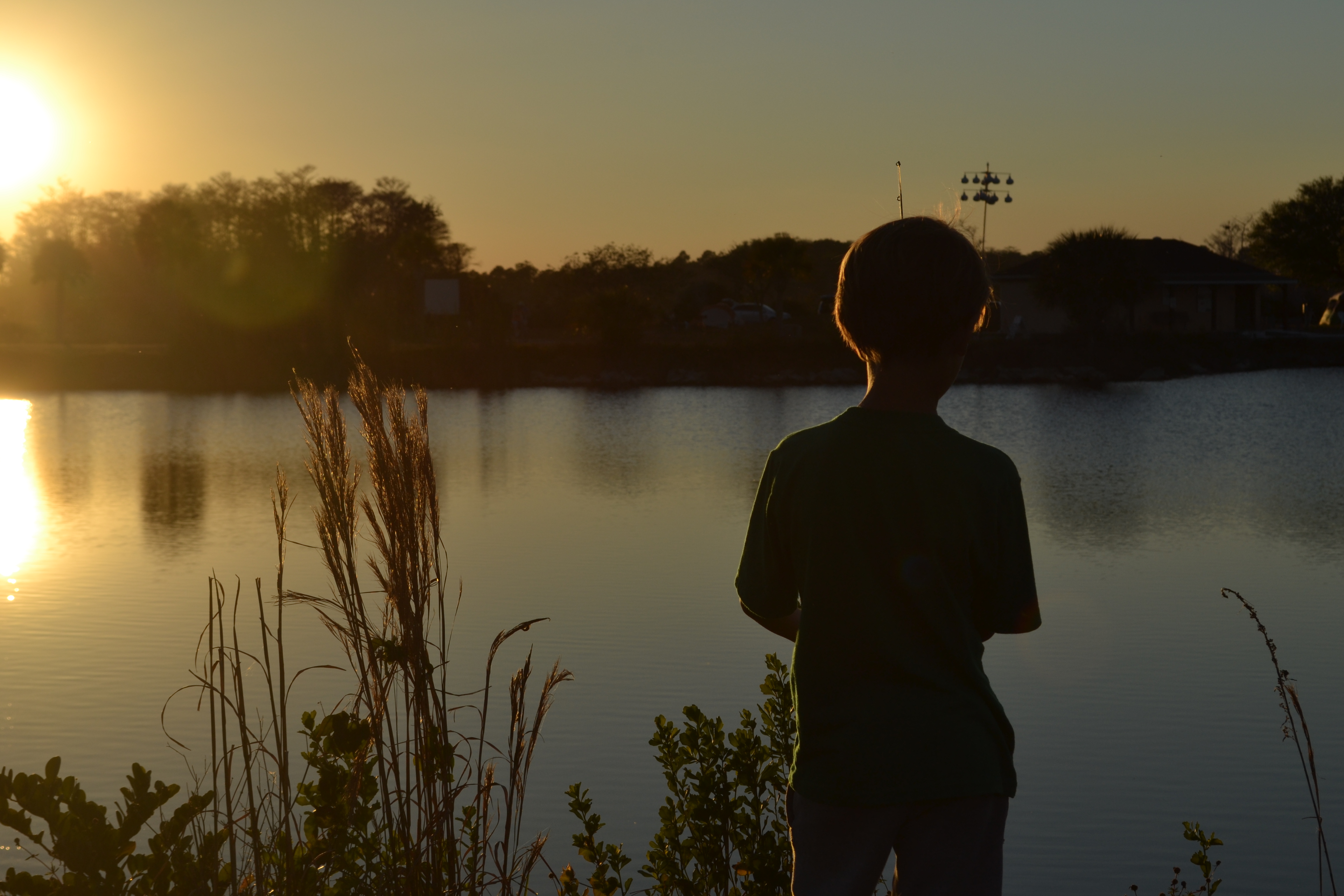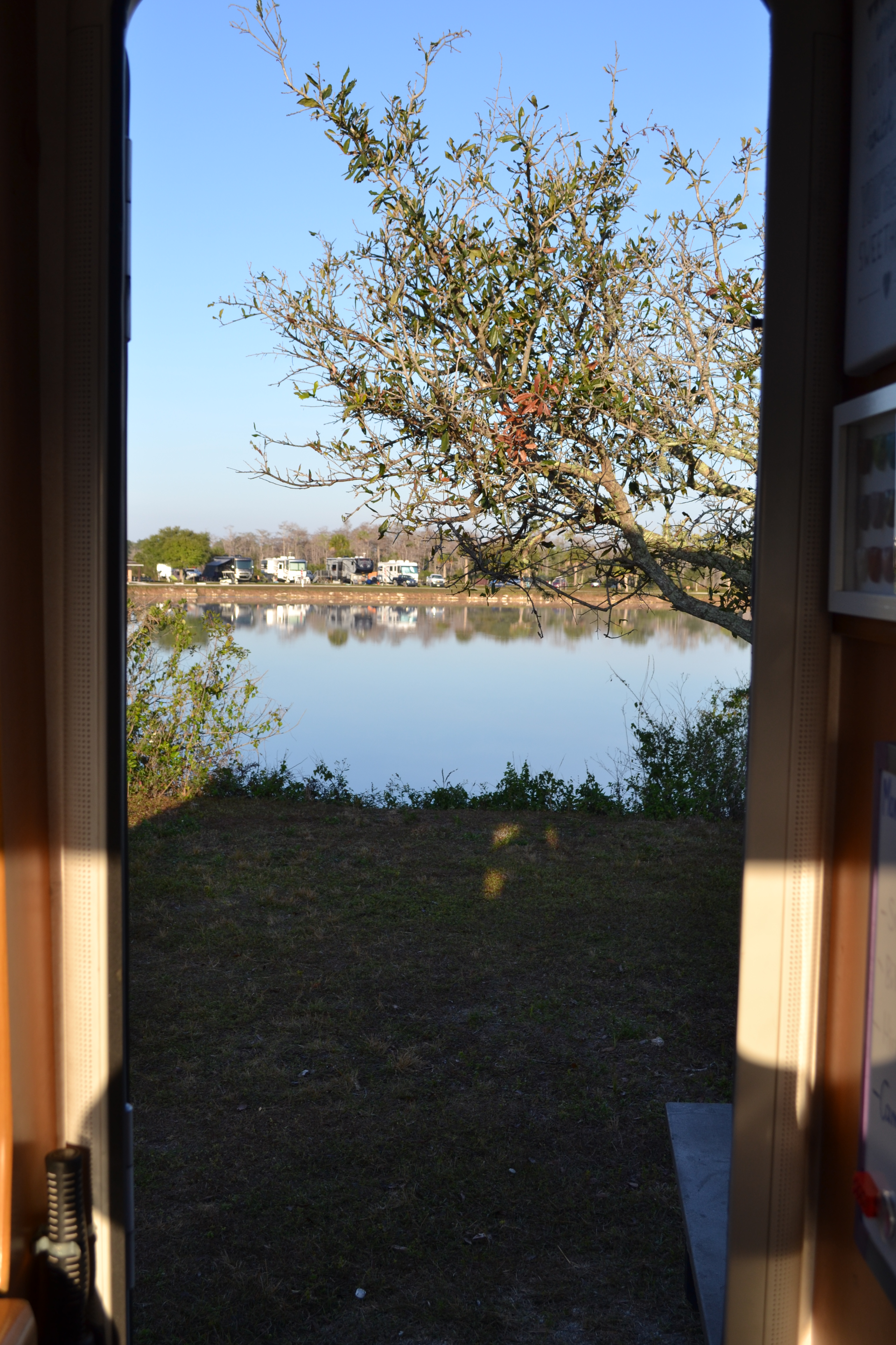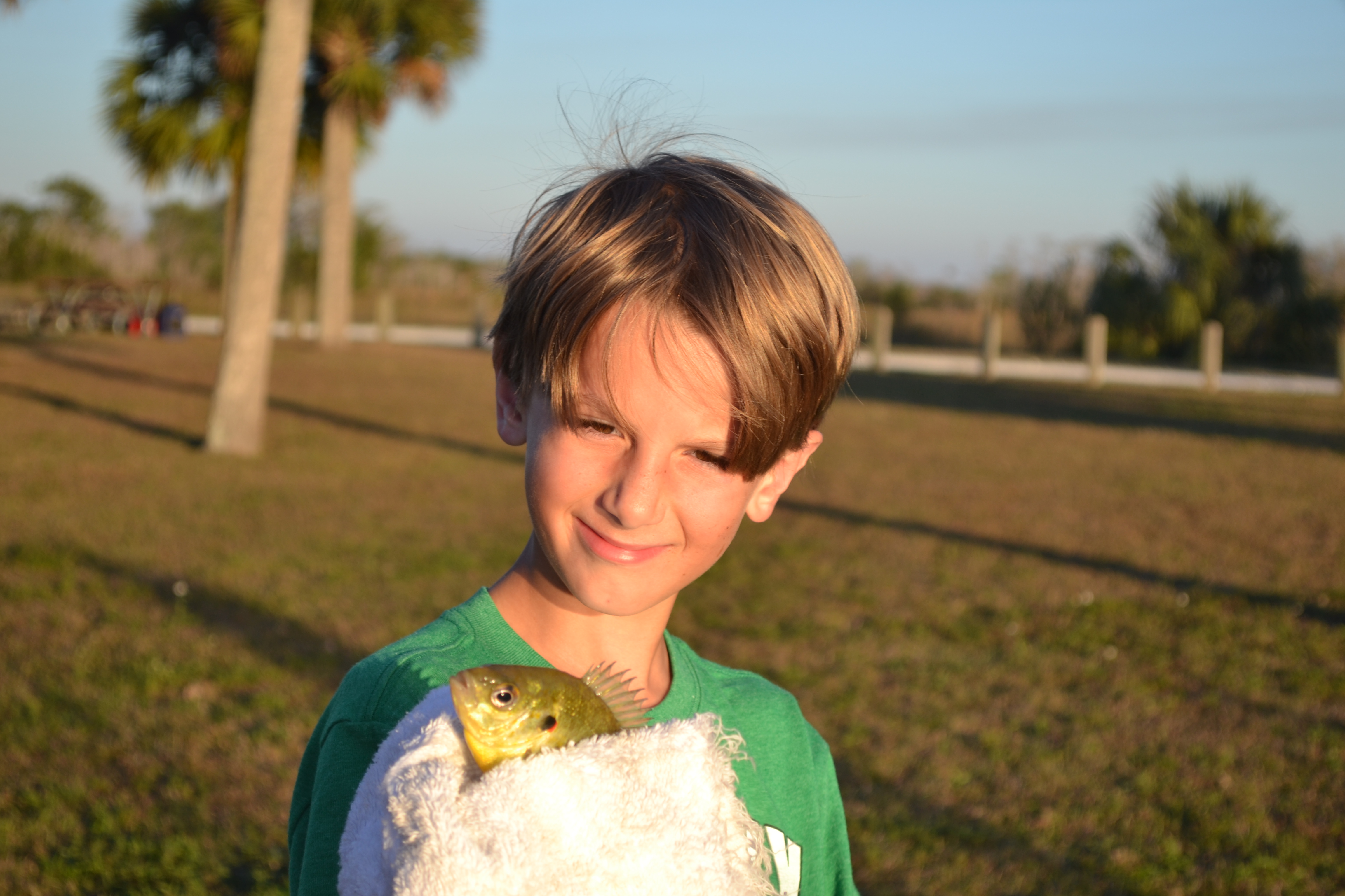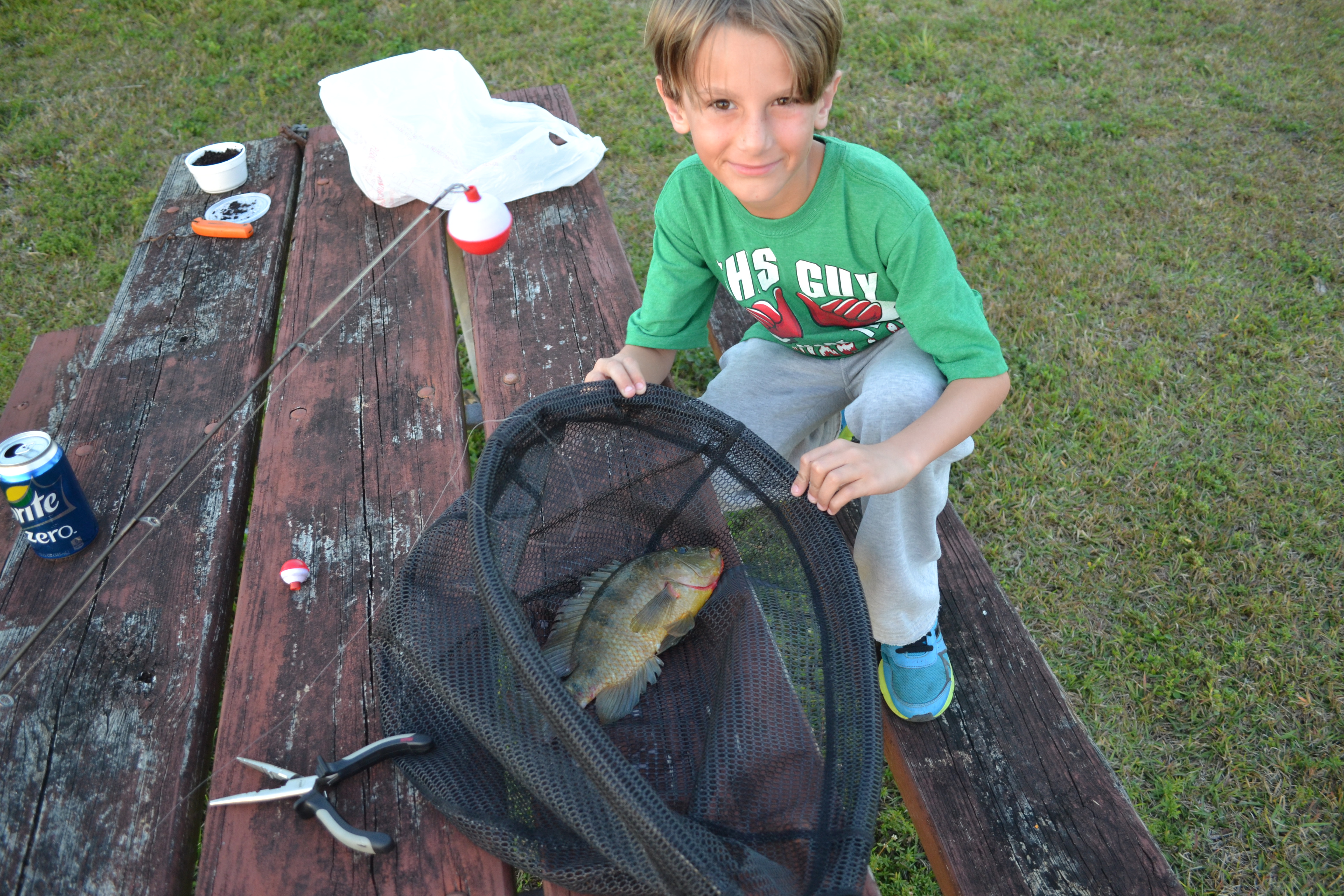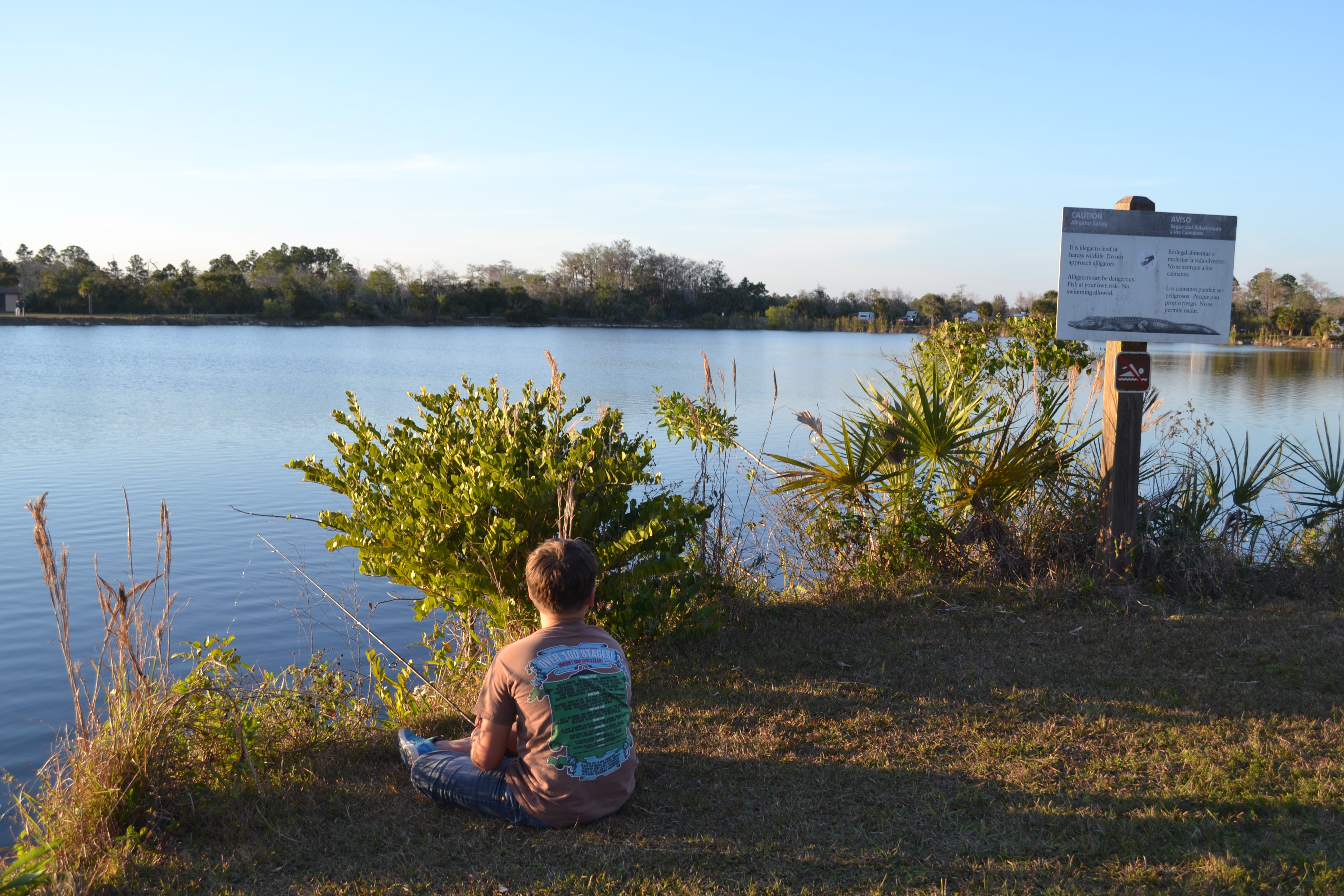 There was a huge alligator sunbathing on an island in the middle of the lake but more exciting was the little 5’ one sat on the bank at the side of our pitch. (Interesting fact. If you want to know how long an alligator is… Take the length of his snout in inches and turn that into feet – i.e. 10” long nose means he’s probably 10’). He ignored us and we ignored him. But we did make the kids fish a bit further along as apparently they often go for the fish on the end of people’s lines as they reel them in!! Great evening on this lovely quiet and beautiful campsite watching the sunset. Boys happily fishing catching sunfish and bass. We actually ate OUTSIDE. Can’t remember the last time we did that at a campsite. Lovely – well apart from being ever so slightly anxious about our toothy neighbor…