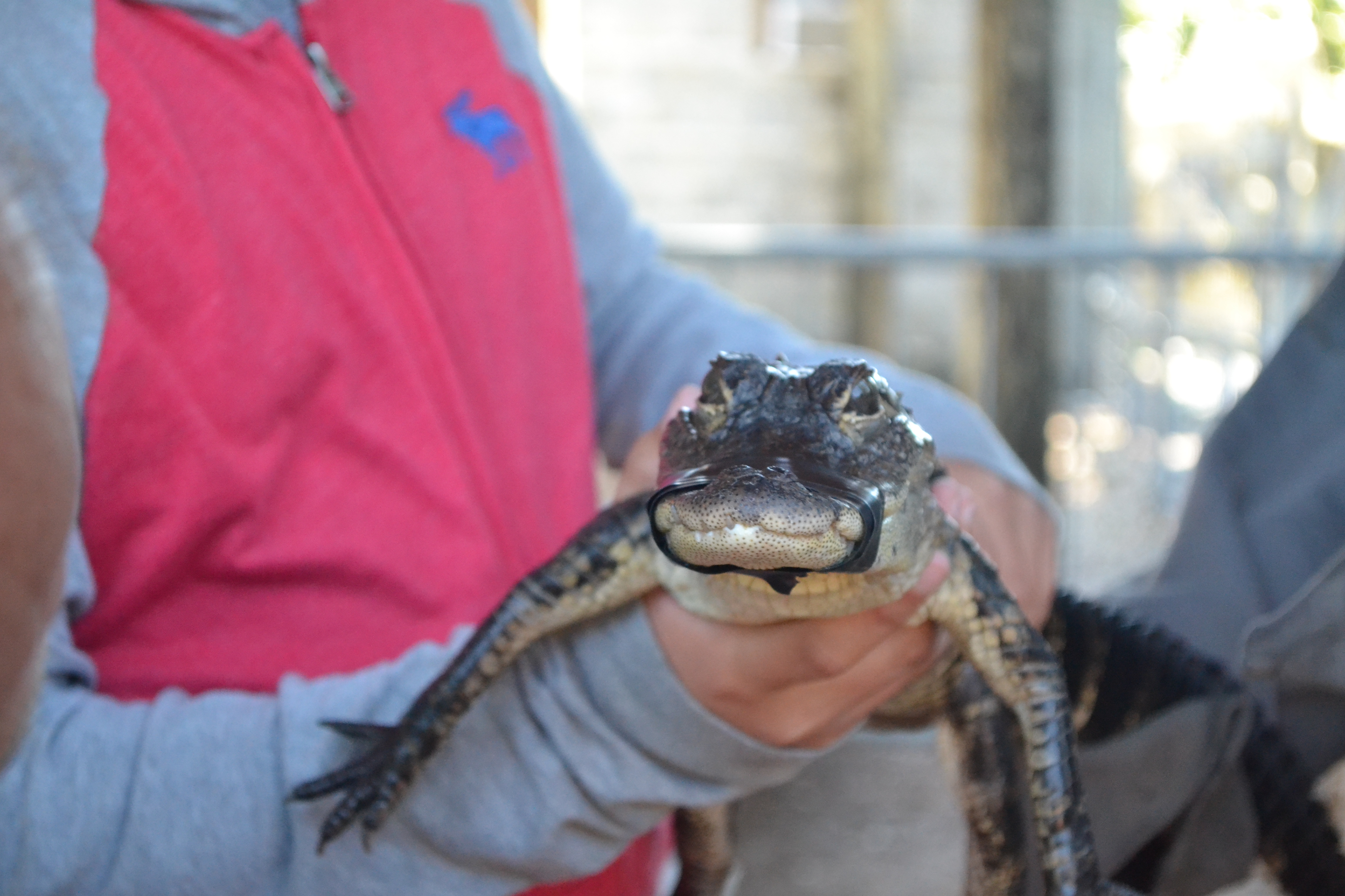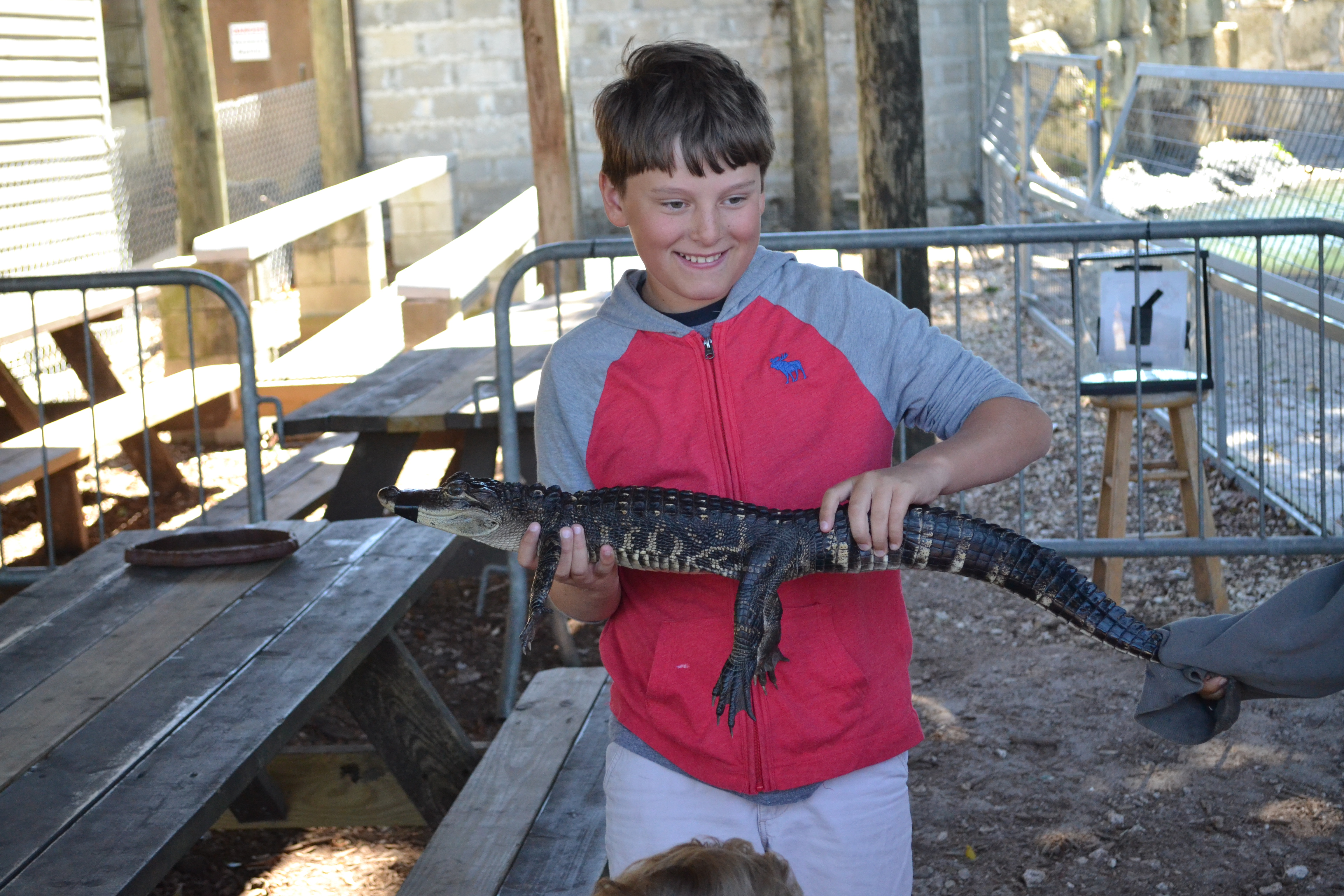We saw a tank of tiny baby alligators all of them about 6” long which looked very sweet. The same slightly strange girl from the ticket office suddenly appeared and asked us if we wanted to hold a baby alligator. Thinking those were the ones she meant we all readily agreed, including Jacob. She disappeared and came back with one about 2’ long – list of volunteers immediately went down. She had taken the precaution of taping its mouth shut, but that still wasn’t enough to persuade some of us it was a good idea. William, John and Jon held it while the rest of us took pictures.