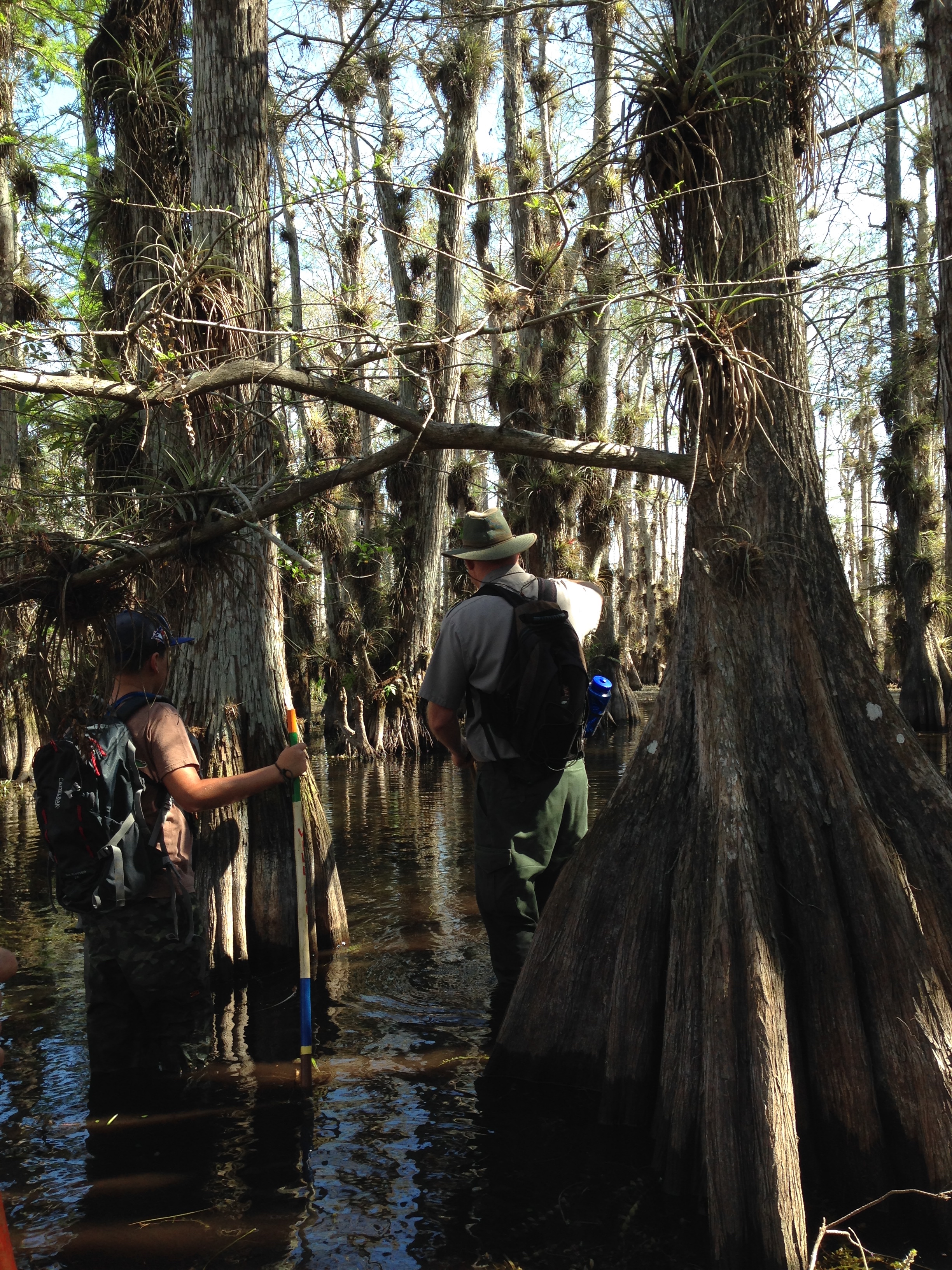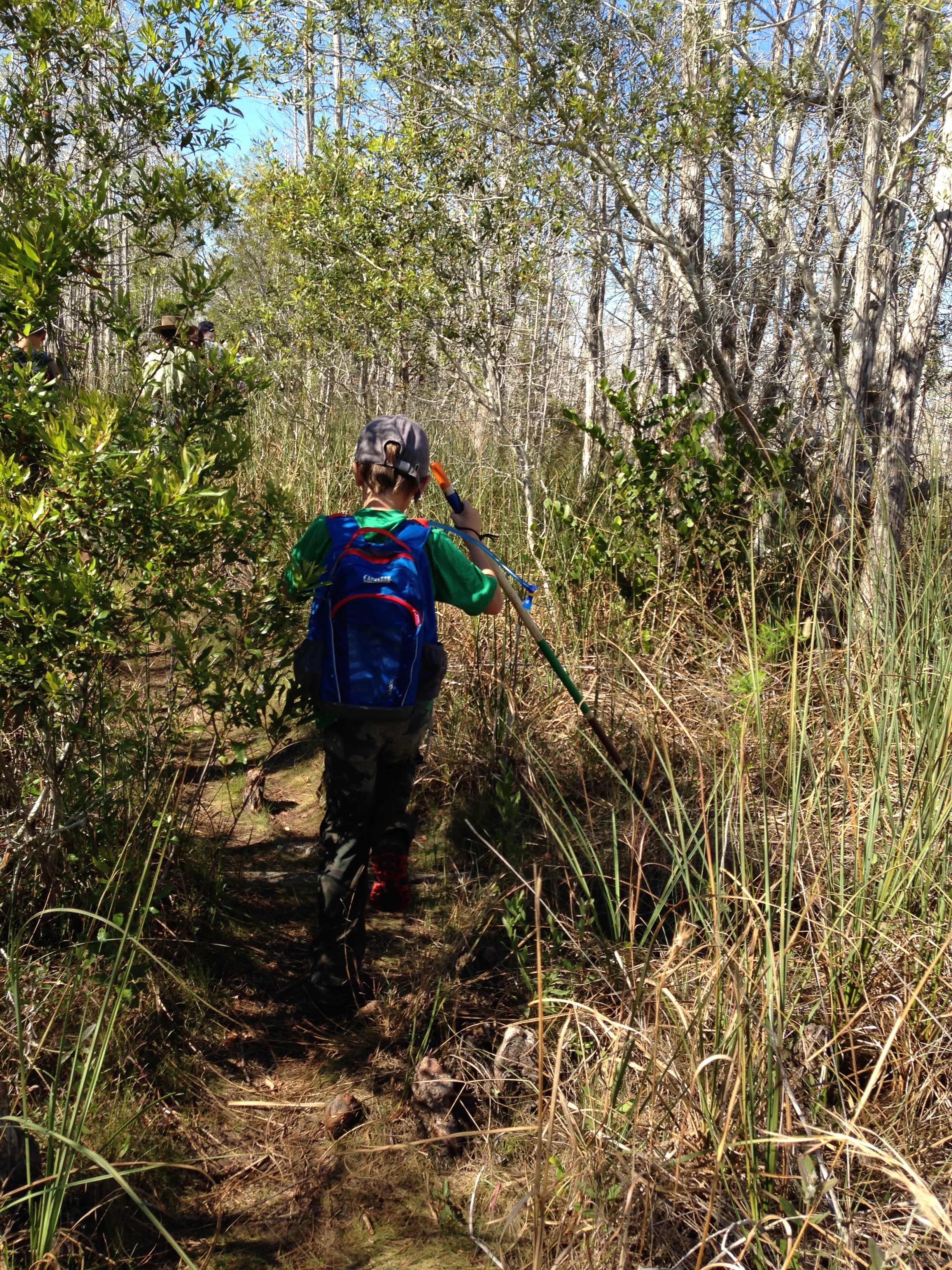 We had booked onto a Ranger Led program to learn more about it and most importantly get wet wading through the swamps!! As we were here in winter the swamps are more salty and silty as the water level drops. Whereas in the summer rainy season the levels are much higher. So we were told we would only be wading in water up to our mid thigh – which is waist high for me and chest high for Charlie. Called a Gator Trail Swamp Hike we hoped we wouldn’t actually come face to face with a gator in water – they can only manage 10mph on land but 20 mph in water – didn’t fancy our chances. The ranger did little to comfort us when he said most alligators wouldn’t take on anything larger than them so the only person who needed to worry was “the little guy” – Charlie!!