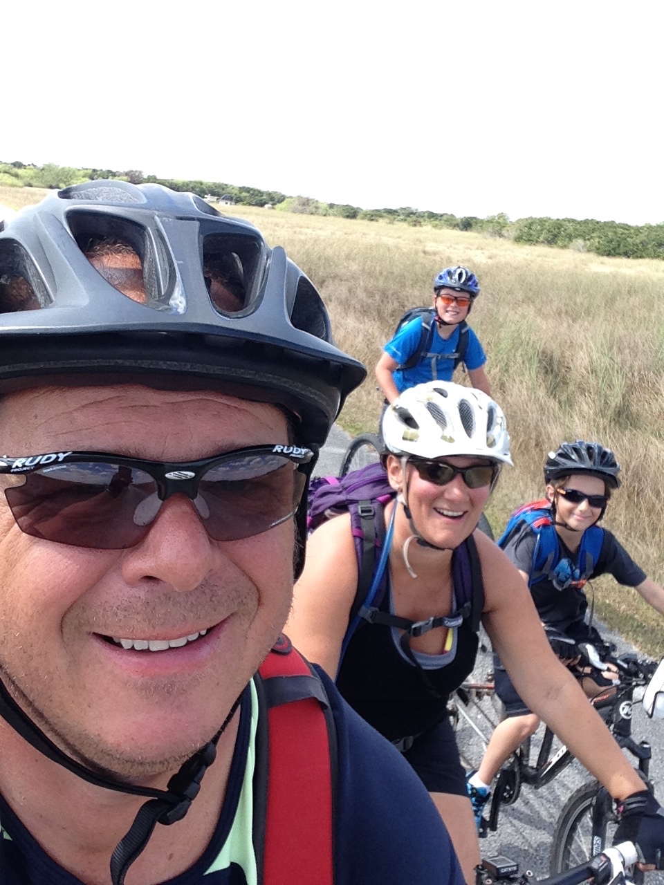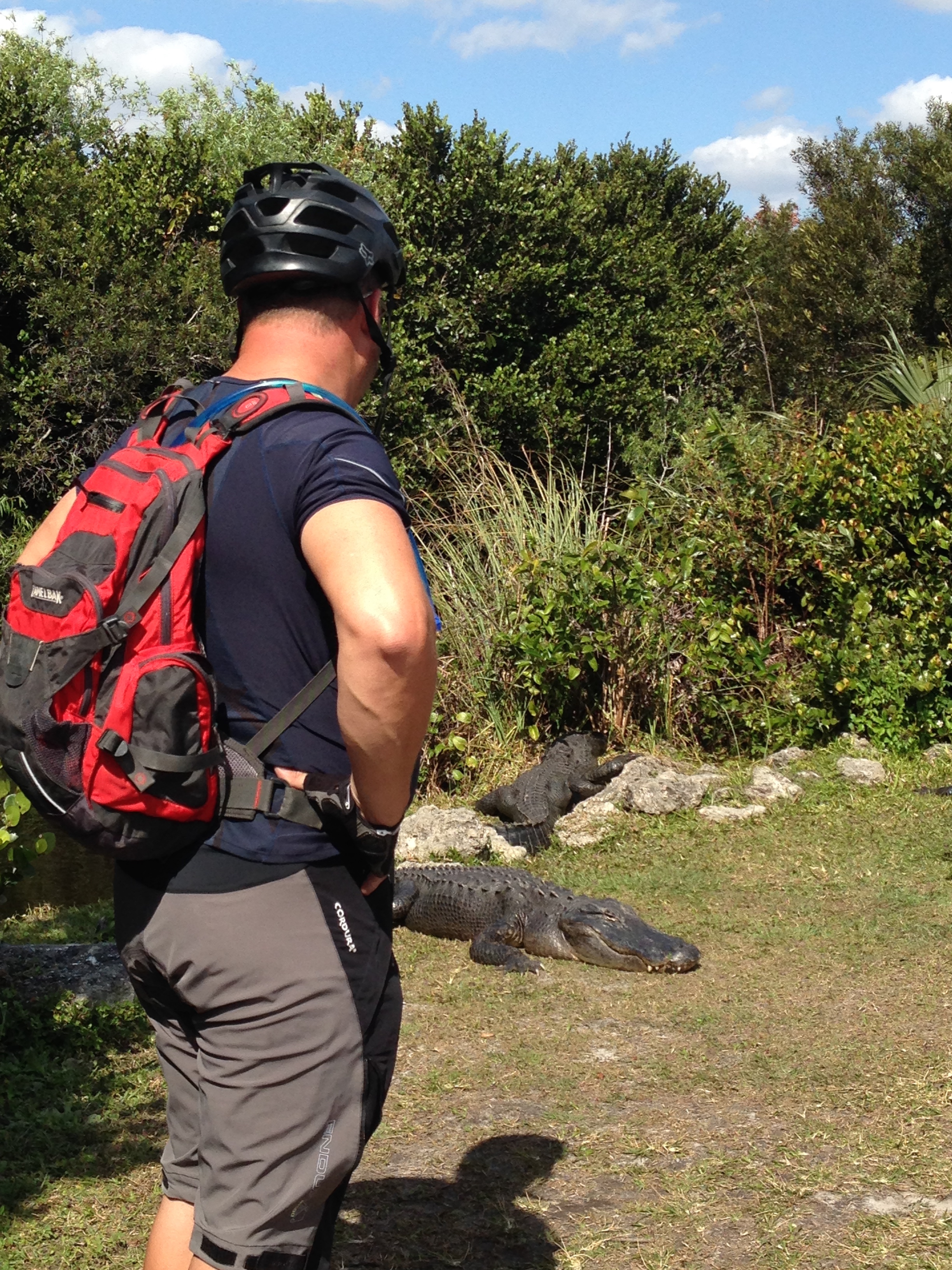 So…. We biked the 15-mile trail. It was all paved so not that challenging for the hill lovers amongst us but ran parallel with a waterway that was absolutely teaming with alligators and birds and turtles. We stopped pointing them out after about miles 3 as there were sooooo many. Truly we must have seen 200 alligators, all no more than 10’ from where we were. A couple were actually on the edge of the pathway. Surprisingly it wasn’t at all scary. They seemed completely disinterested in us (or the other 100 or so people on their bikes) so we got braver about how close we got to them. By the time we got to the observation tower at the middle of the loop and parked our bikes up we were fearless. There were 3 gators sunning themselves 3’ from us and we slowly backed up towards them to take a ‘selfie’. Well 3 of us did. The small one was still convinced he was the perfect sized prey for an alligator so stayed well away.