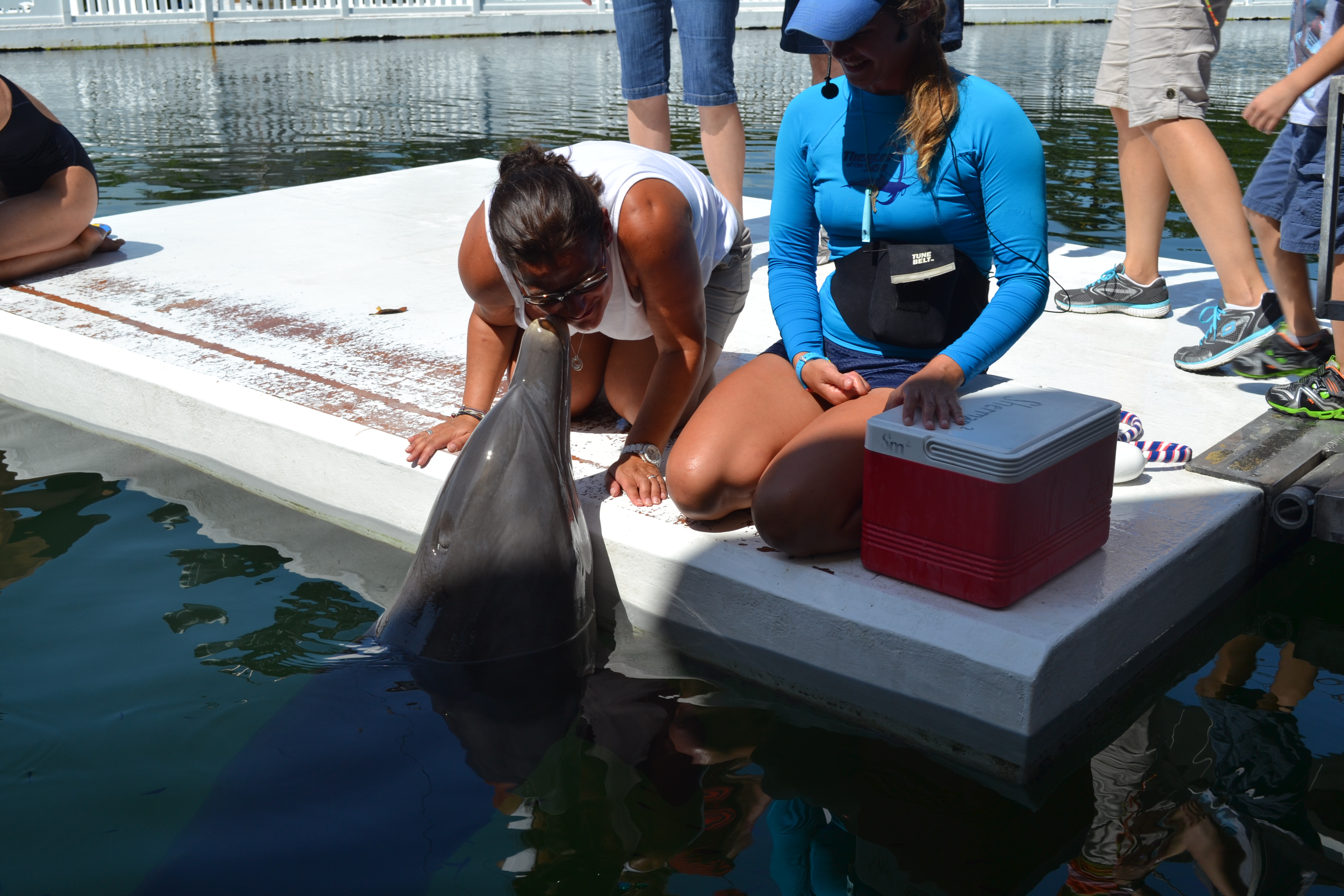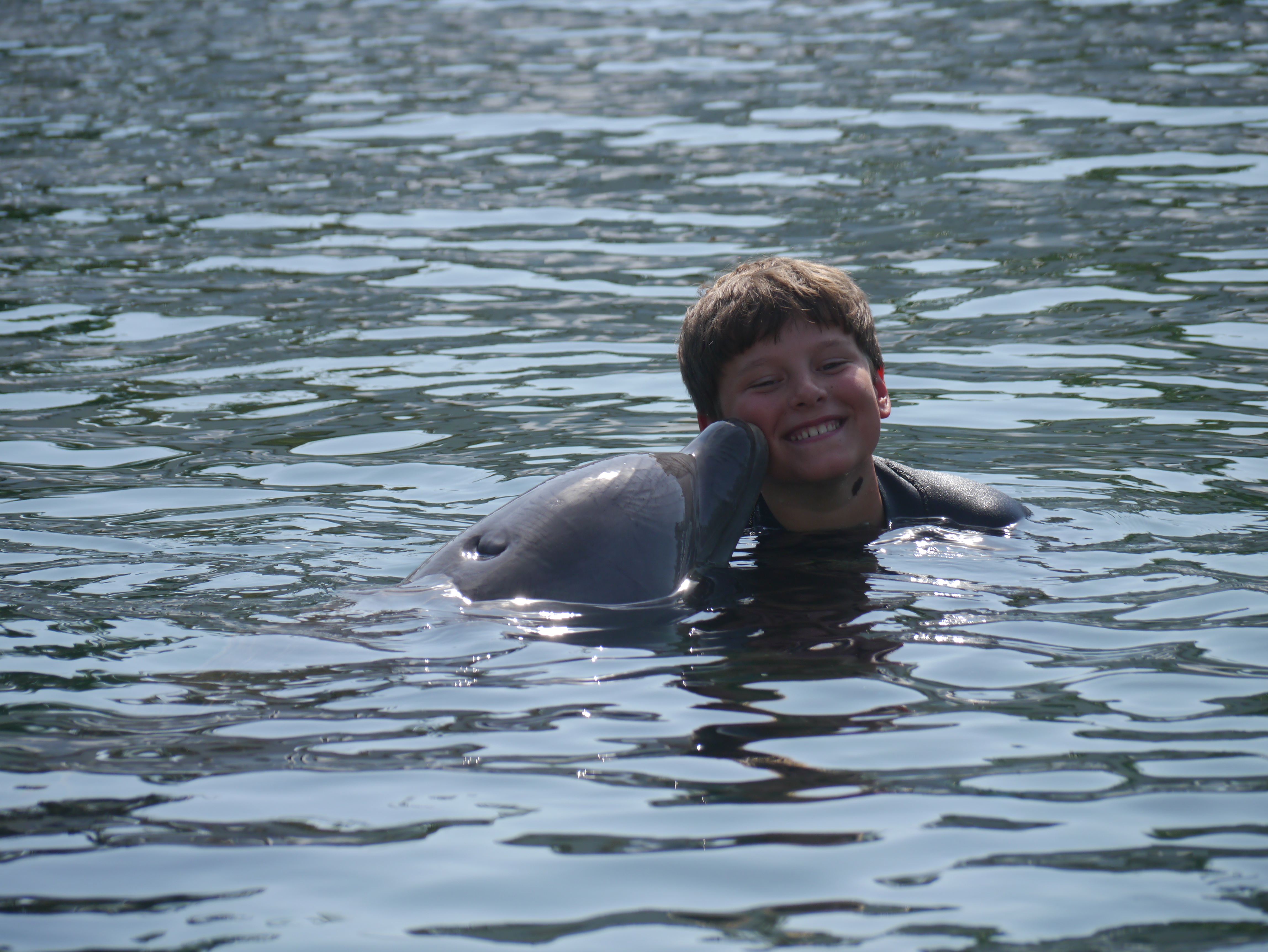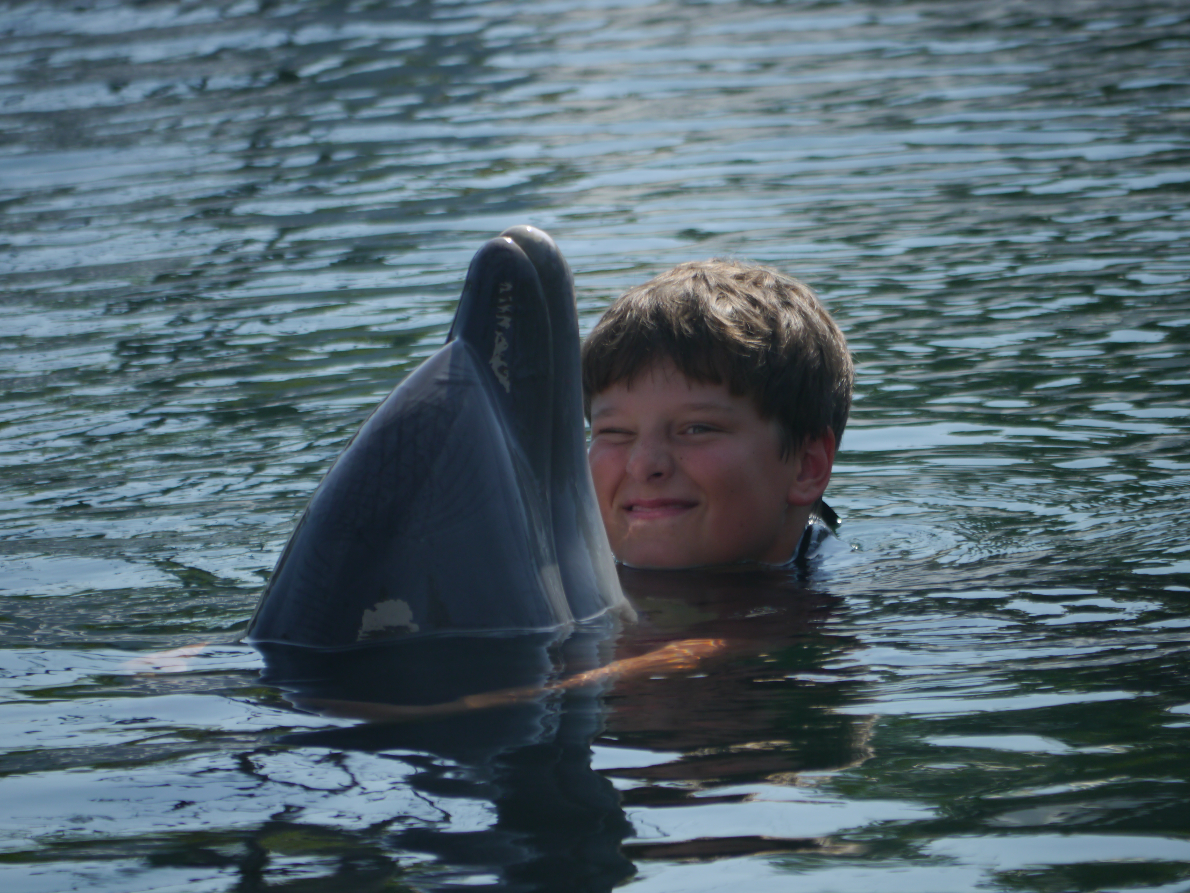 The kids were incredible – so very brave! Their dolphins were called Stormy and Daffy and the boys hugged them, kissed them, caught a ride on their fins, swam underwater with them and just loved it all. It was really incredible. And I did get my own little encounter with one of the dolphins after all. During one of the brilliant shows we saw there they asked if anyone wanted to come and meet the dolphins and if so they should put their hand up to be given a pass to come forward. I put my hand so far up in the air I nearly knocked Charlie out. I was bouncing up and down on my seat and the kids were staring at me in utter disbelief. I must have looked half crazed but it worked and Valerie the bikini clad trainer picked me!! I thrust my phone at Charlie and told him to video it and ran to the front pushing aside small children. I GOT TO KISS A DOLPHIN!!! See photo below – unfortunately I have no video evidence as apparently Charlie was just stood, jaw dropped at how crazily his mother was behaving and didn’t manage to hit record on my iphone.