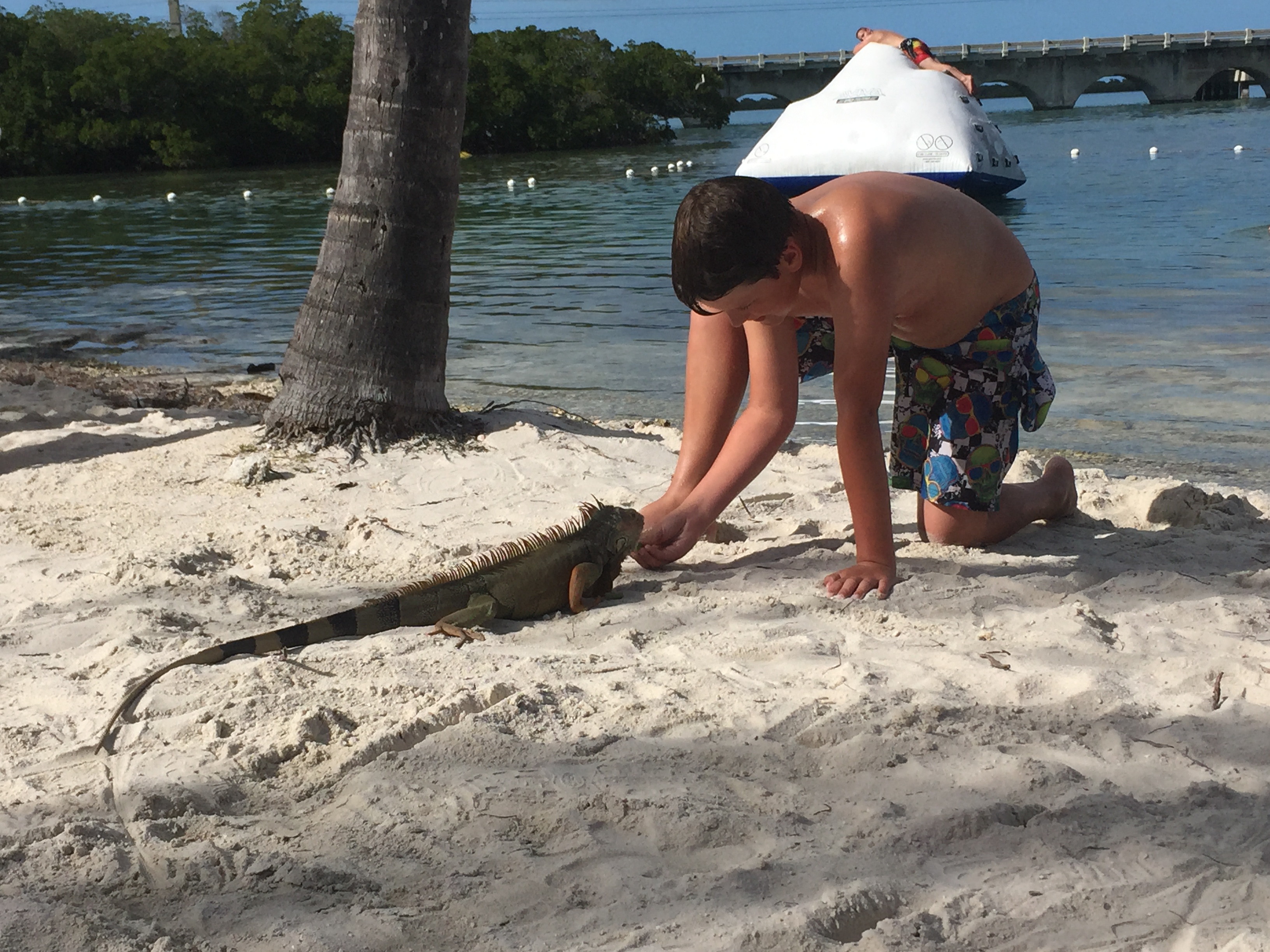 We made the most of the campsites private beach and had a day sunbathing and swimming. Kids were delighted with the huge floating trampoline. Crystal clear water, palm trees and white sand – bliss. We saw a huge huge huge lizard wandering off the beach and a bit later I went into the sea, came back and sat down and one walked out from under my chair at which pointed I screamed very loudly. William however fed it with bananas and green beans (weird mixture) and wasn’t the least put off by it’s sheer size and sharp tail.