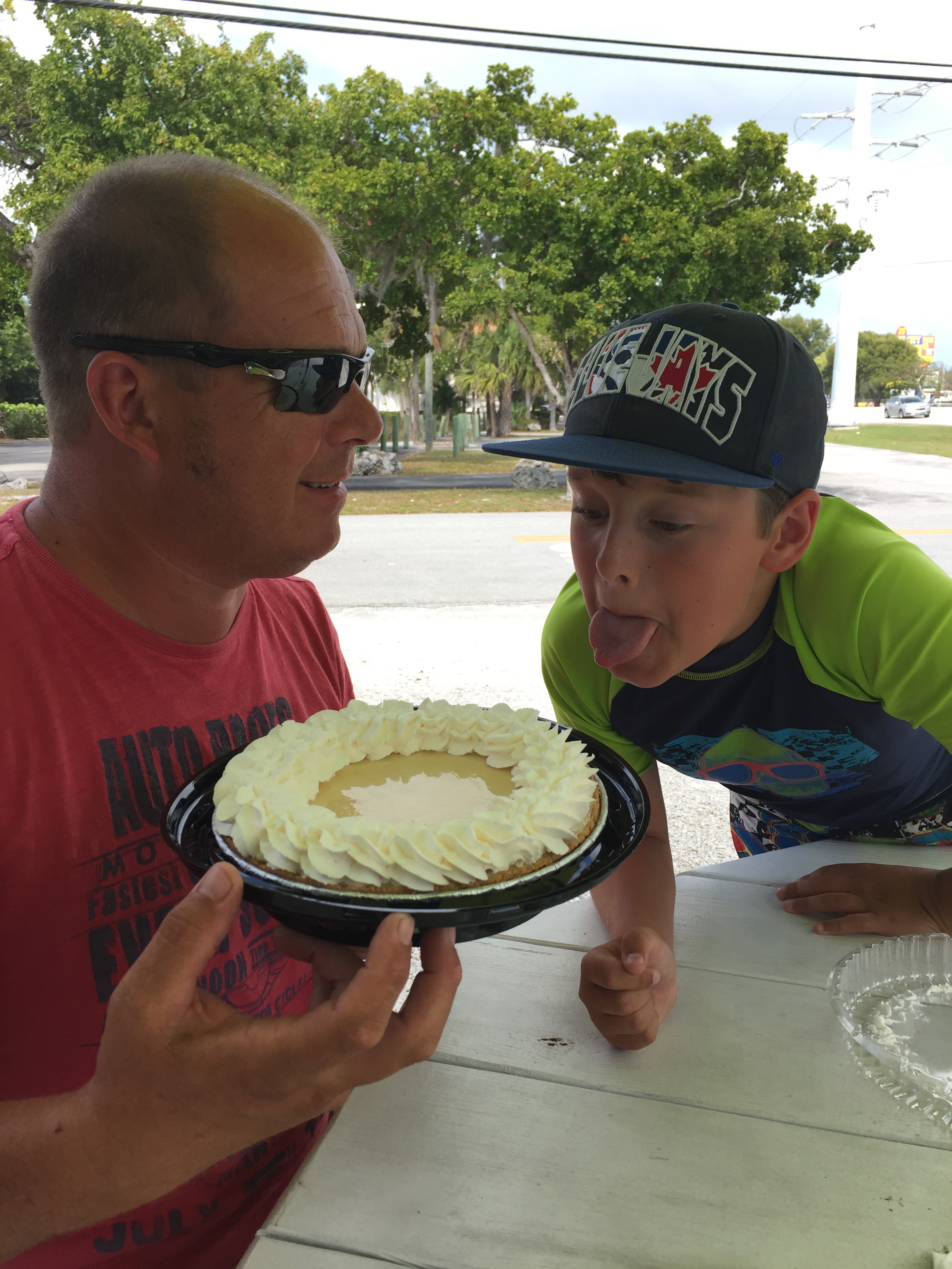 Our second to last stop on the Keys was at the Key Lime Pie Factory. Dad and Carol had been there the week before to pick up desert for us on their way back. They’d told us the server would’nt sell them one as they didn’t have a cool box in which to transport it back. But we wonder if maybe it was the price that put them off!! Blimey!! I asked the server if we could possibly freeze it and wondered how long it would last in a fridge. She looked at me a bit strangely and 24 hours later we understood – no one in their right mind would leave that pie uneaten in a fridge for any length of time. It was the most delicious creamy limey pie we had ever eaten. Worth every single dollar!!!