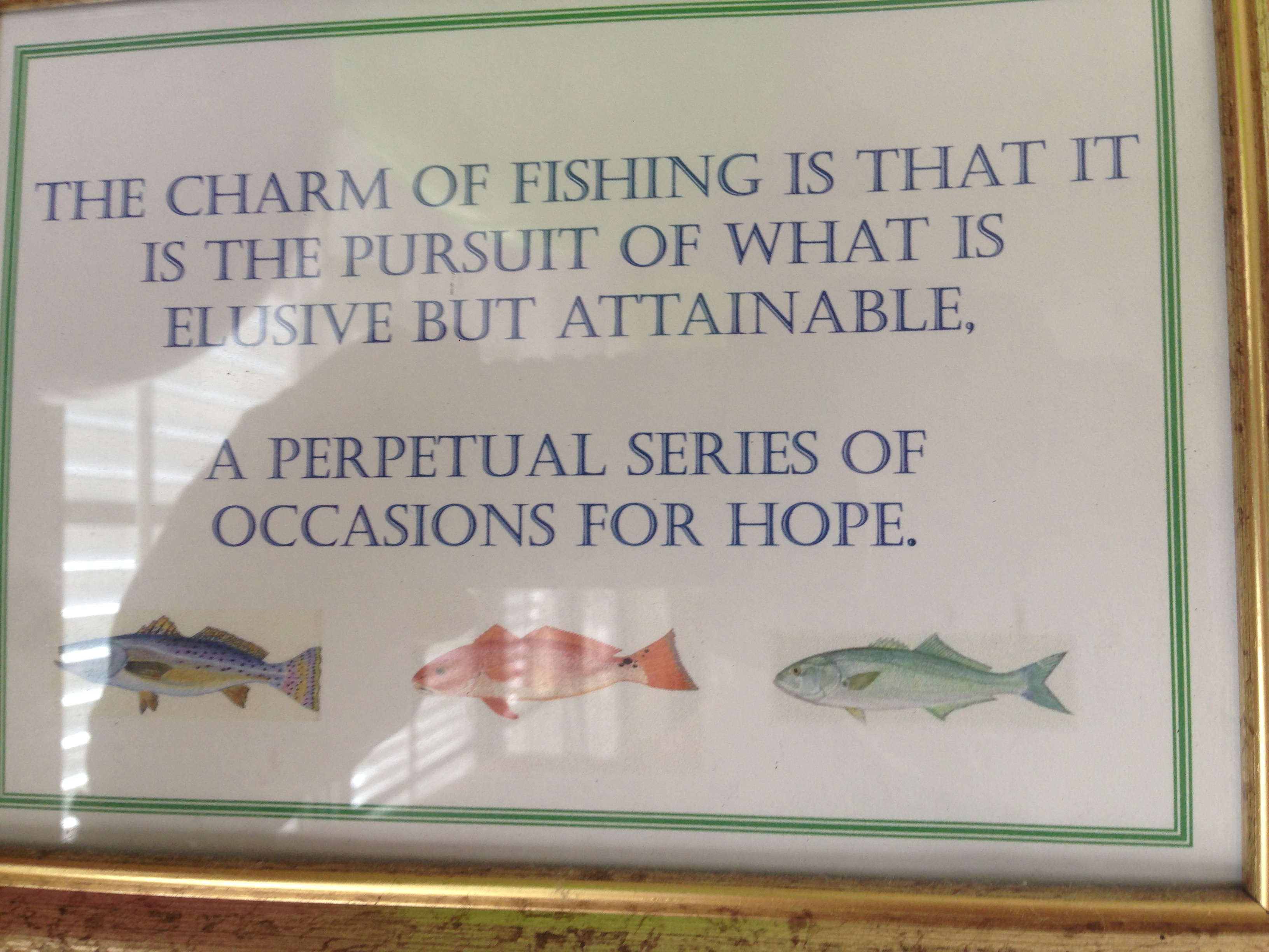 “The charm of fishing is that it is the pursuit of what is elusive but attainable. A perpetual series of occasions for hope.” I read this sign in Florida somewhere and it is so very true!!