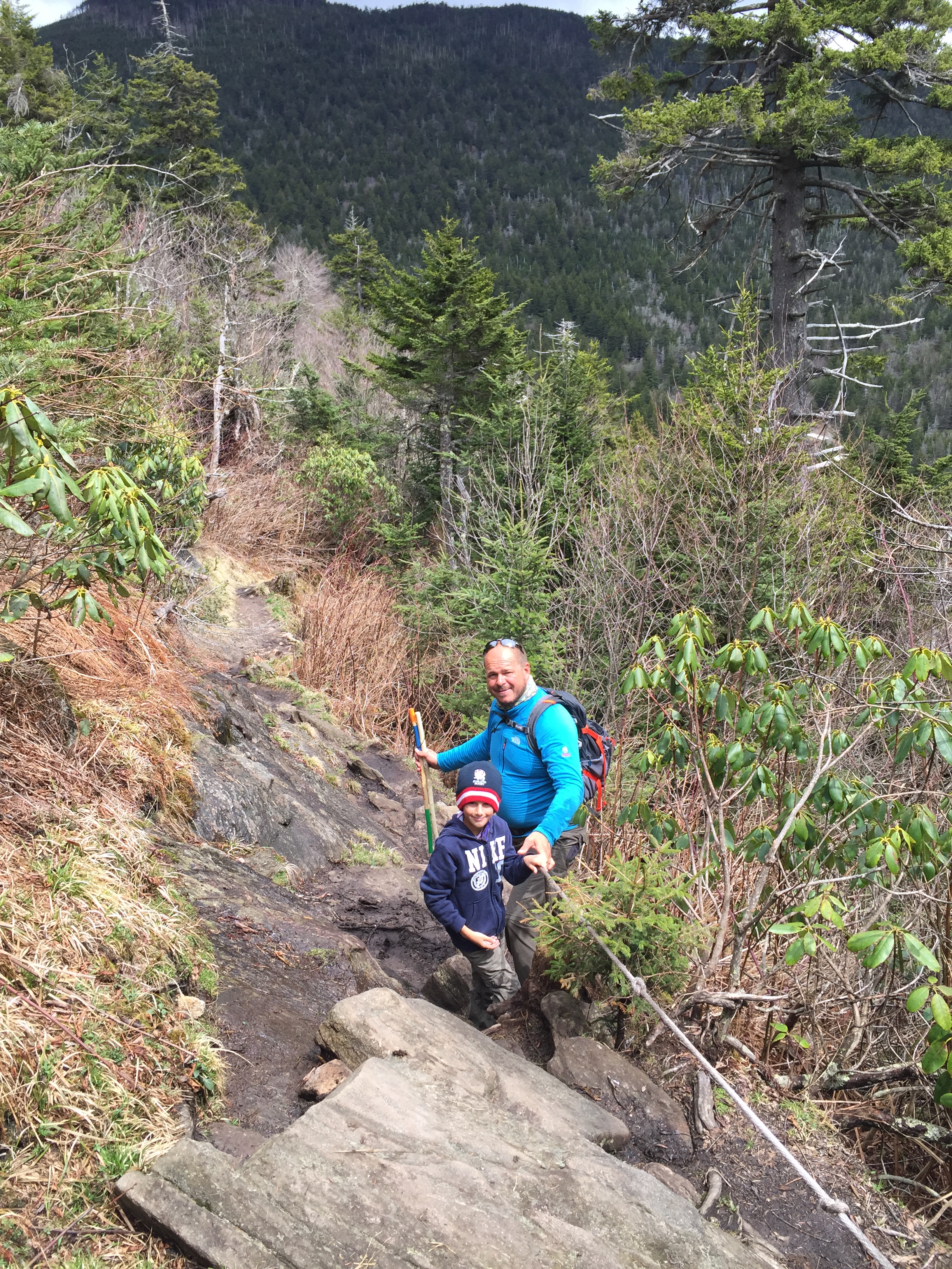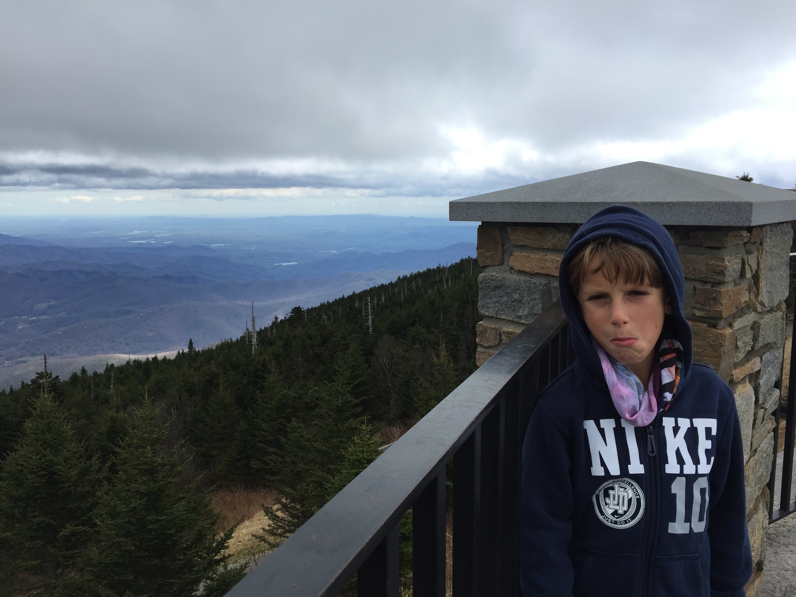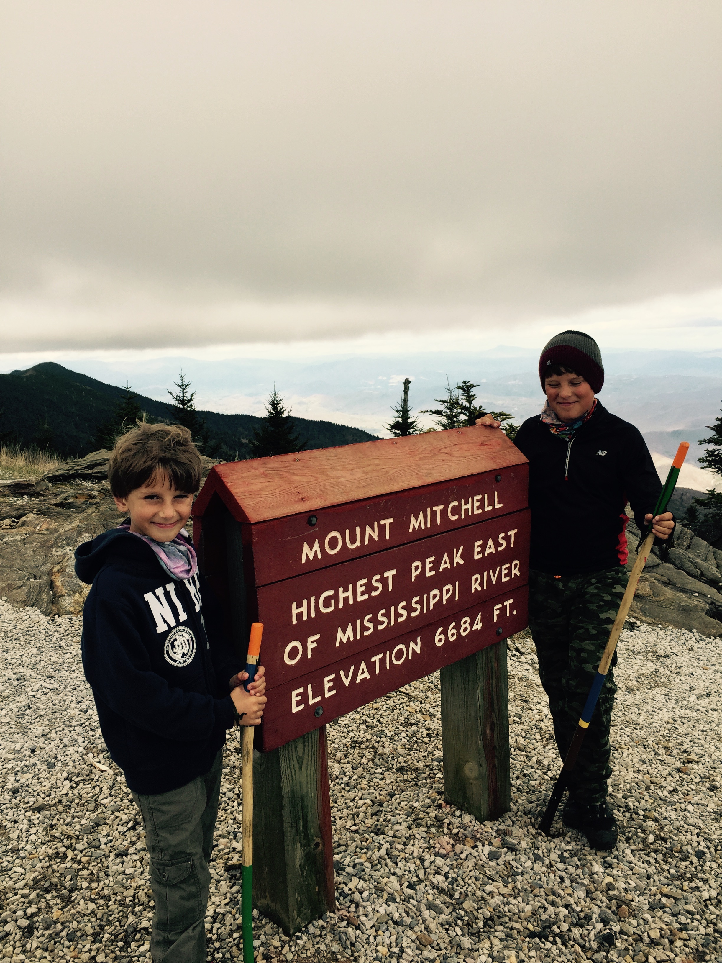 We carried on southbound along the Blue Ridge Parkway past the Black Mountains (they really were!) and some hilarious places (well hilarious if you are 11 and nearly 8) like Bald Knob trail and Big Butt Trail to Mt Mitchell State Park. Named for Rev. Mitchell who died on the mountain in 1857 while trying to verify it’s height – his gravestone sits at the summit. It is 6684’ above sea level, which makes it the highest mountain east of the Mississippi River. The weather was looking pretty threatening but we hiked to the top, up over and along the mountain. Just the kind of hikes the kids like – rocks to climb over, ropes to help you down rocky outcrops, slippery and not a gravel path in sight (which is the epitomy of a terrible hike as far as the kids are concerned). We got back to Frankie just as the heavens opened.