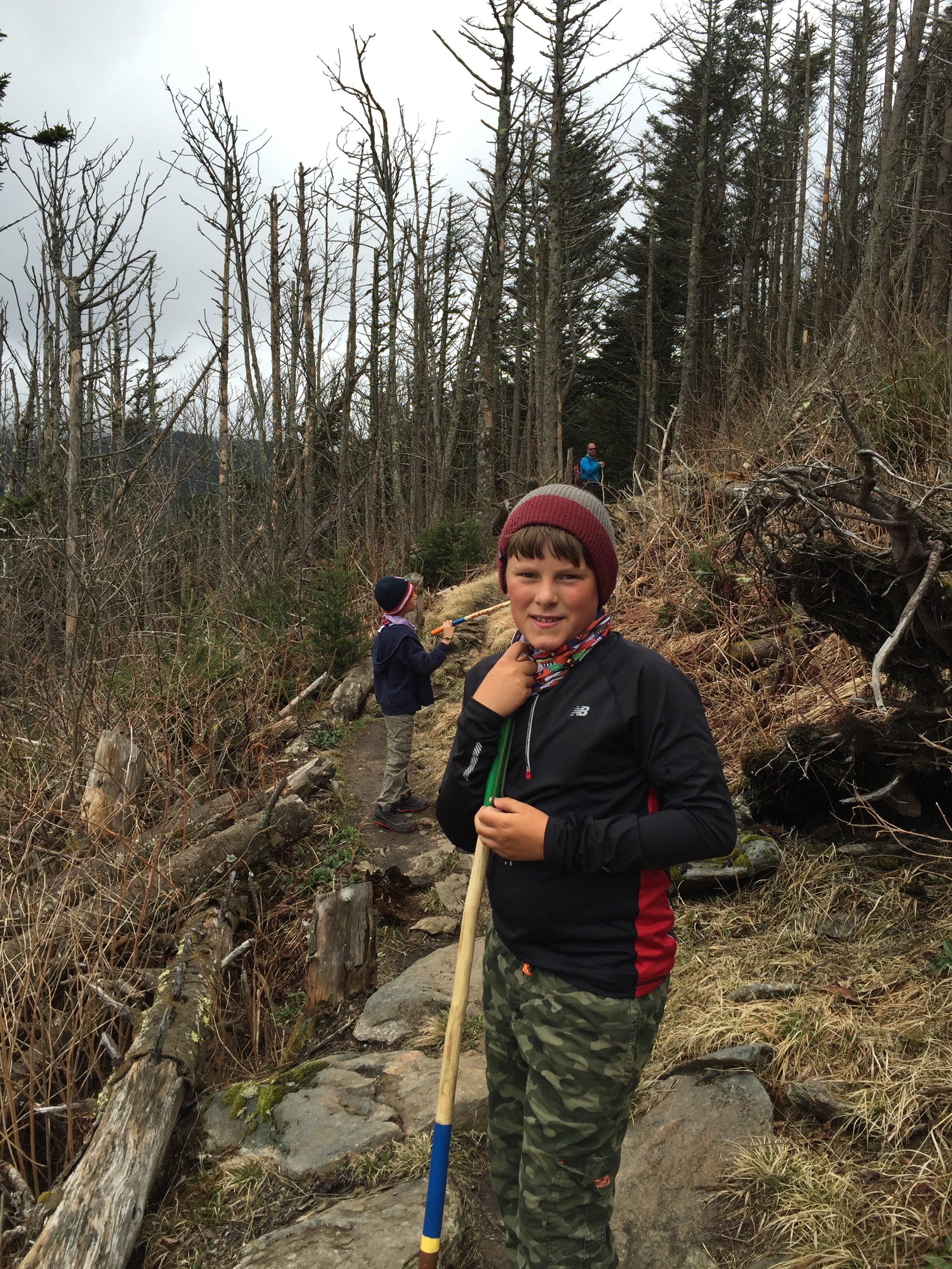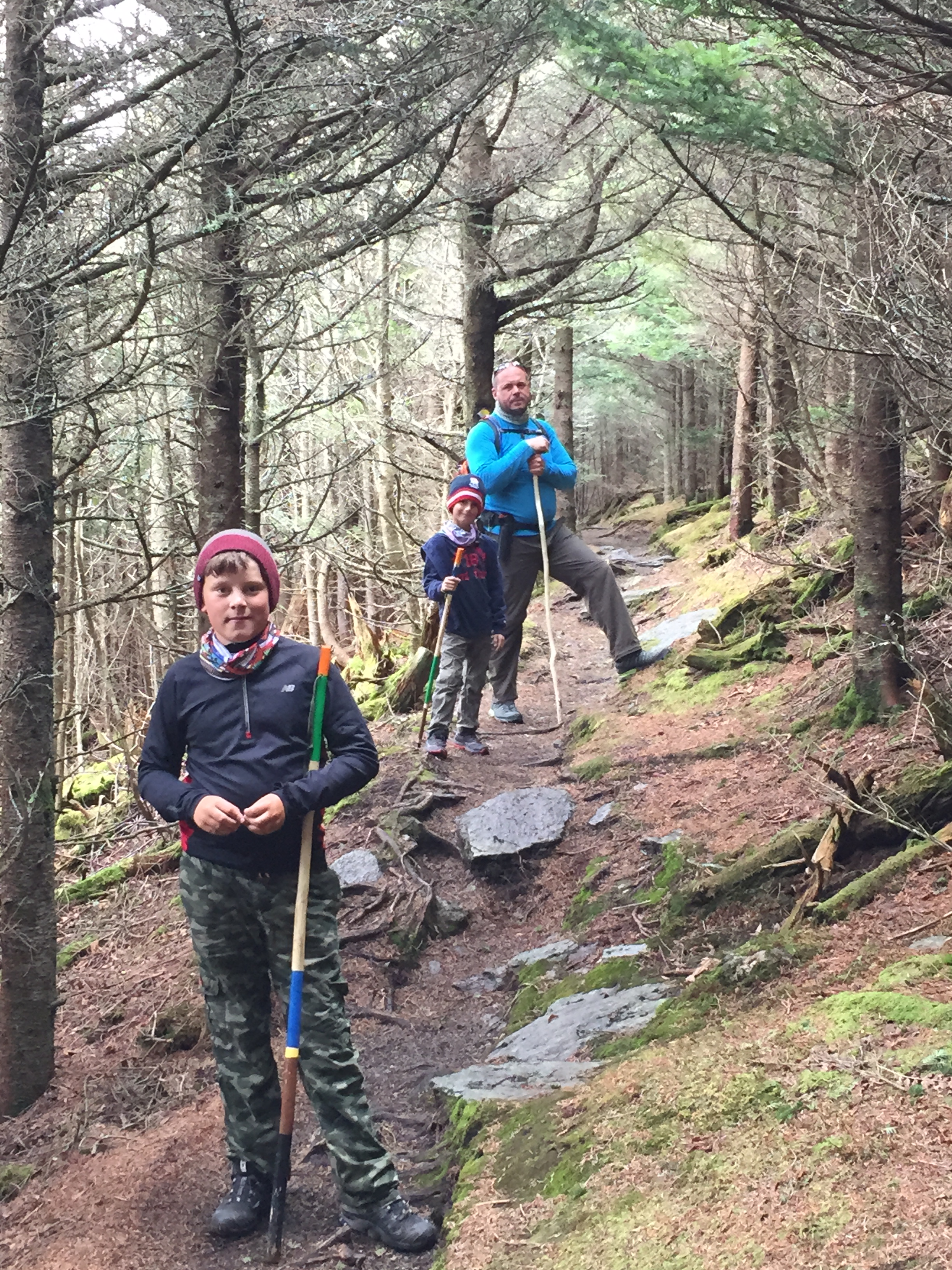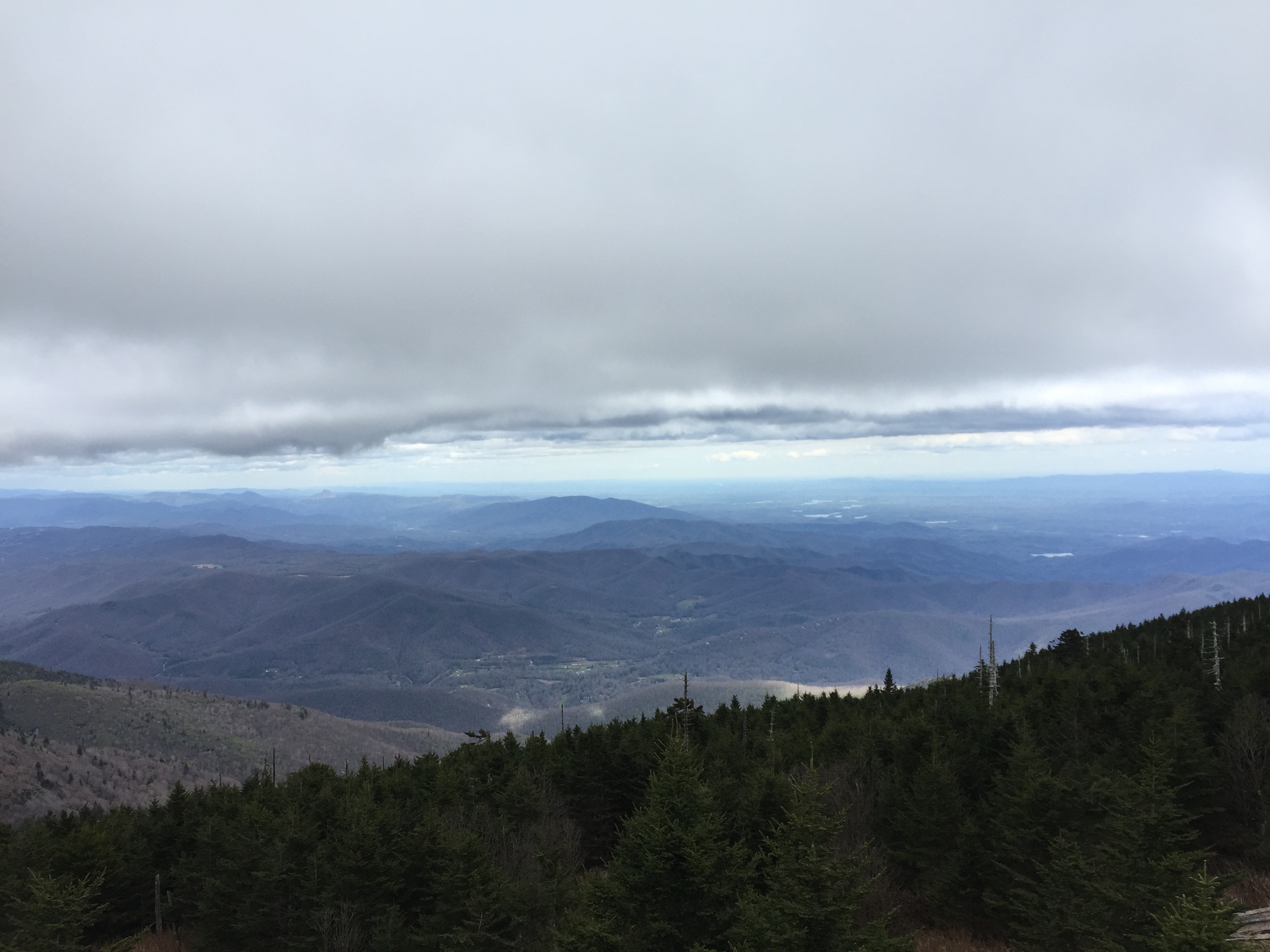We carried on southbound along the Blue Ridge Parkway past the Black Mountains (they really were!) and some hilarious places (well hilarious if you are 11 and nearly 8) like Bald Knob trail and Big Butt Trail to Mt Mitchell State Park. Named for Rev. Mitchell who died on the mountain in 1857 while trying to verify it’s height – his gravestone sits at the summit. It is 6684’ above sea level, which makes it the highest mountain east of the Mississippi River. The weather was looking pretty threatening but we hiked to the top, up over and along the mountain. Just the kind of hikes the kids like – rocks to climb over, ropes to help you down rocky outcrops, slippery and not a gravel path in sight (which is the epitomy of a terrible hike as far as the kids are concerned). We got back to Frankie just as the heavens opened.