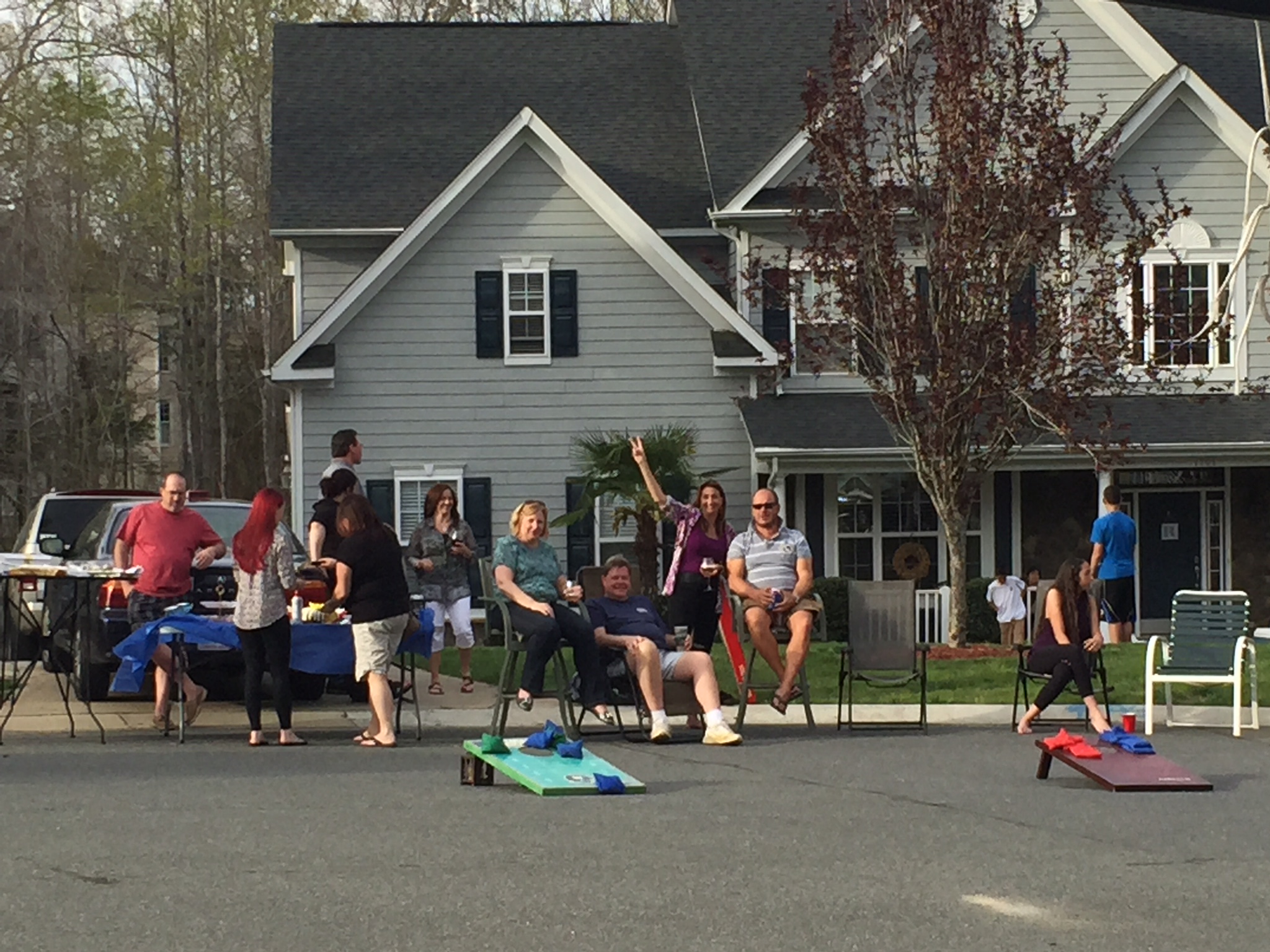 We wandered out onto the cul de sac for deserts and drinks with their lovely neighbours – most of whom seem to be retired NY police officers. Sharon and Vince and Laura and Joe were really welcoming and their kids played with ours all afternoon. They all have huge houses, which we got to tour. Once John visited Vince’s cinema on the 3rd floor we started talking about whether there were perhaps any other houses for sale on the cul de sac!! We ate, drank and played corn toss – which apparently means you know you’re in North Carolina!