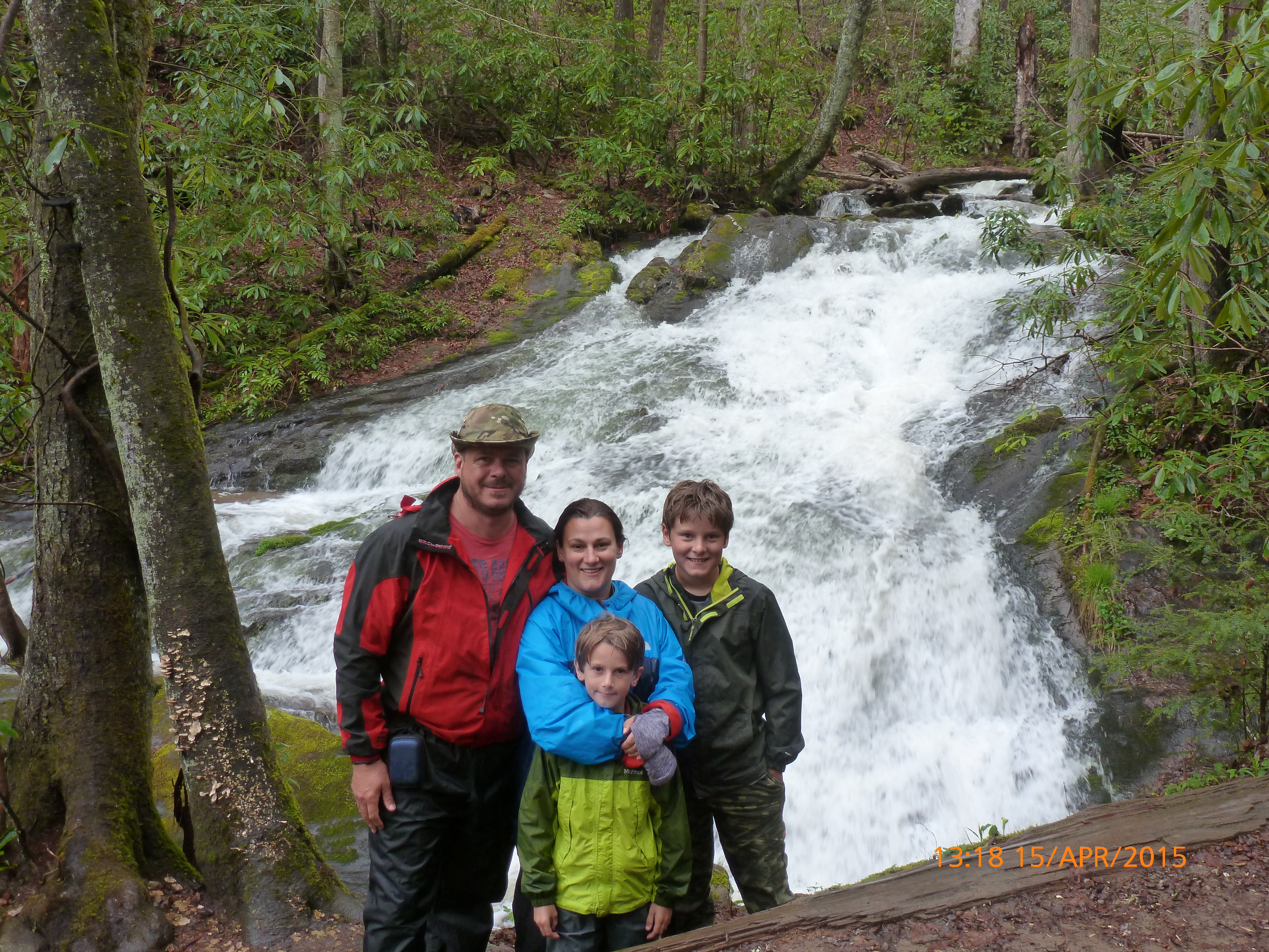 We hiked a 6-mile loop trail, which was beautiful; through forests, along the river, over streams, little waterfalls with wild flowers and blossom. There were thousands of tiny blue butterflies that kept fluttering away as we made our way up the path – it was like a scene from a Disney cartoon. About 1 mile in it started to climb uphill quite steeply. Once we’d crossed over Oconauftee River did we start the real uphill – zigzagging up and round the mountains. Basically 2 ½ miles of constant uphill walking – the kids of hands on your thighs uphill walking. Owwwww. All in hot humid rain. Every time we turned a corner we thought we must have reached the summit only to find another uphill section ahead of us. There was a lot of moaning. John singing to keep spirits up. Sang the Banana Split song with a few changes to the regular lyrics – William cracked up. He told me afterwards “I laughed so hard I forgot my name!” which struck me as a great expression.